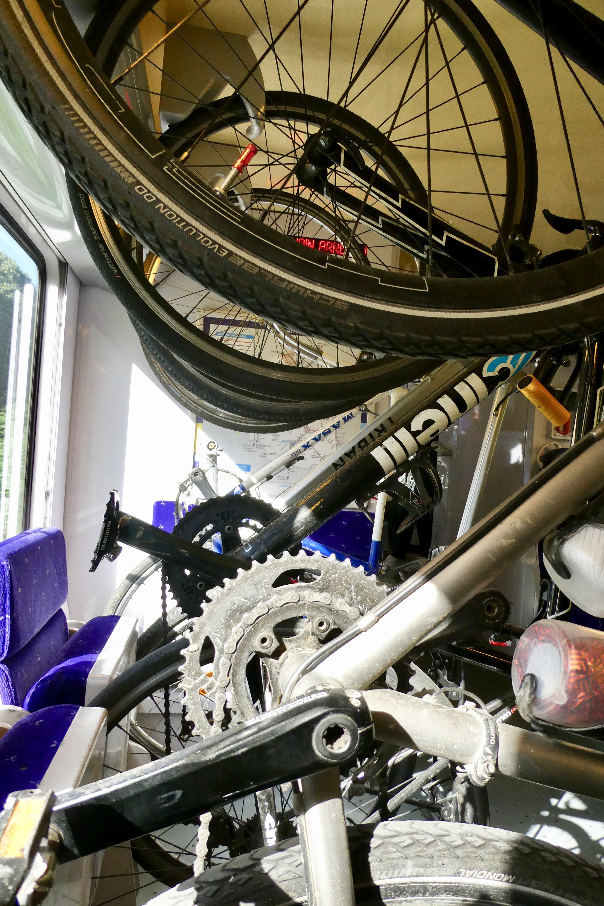 The exact plans for the trip were a little loose and didn’t really fall into place until this morning when I booked the 11:06 train to Épernon and a room for the night in Chartres. Vivien George was the first bike to board the Bike Car and I hoisted her up onto a hook without too much problem. I took my seat across the aisle but soon moved to a spot behind the bikes as the train quickly filled up – with both bikes and people. All hooks in car 5 were in use, two of which belonged to my seat-mates Assunto and Hugo, on their way to Chartres to have lunch with Hugo’s sister. The three of us had quite an enjoyable conversation on the way to Épernon – one of the more remarkable things I learned is that Assunto lives just a block from me in Paris! But our main topic of conversation was cycling. They had just (yesterday) completed their first cycle tour – a trip to southern Brittany that included visits to both of Hugo’s grandmothers as well as the small island of Île-d'Houat, which they said was better suited for hiking than cycling. They were now hooked on bike touring so I naturally directed them to Cycle Blaze.