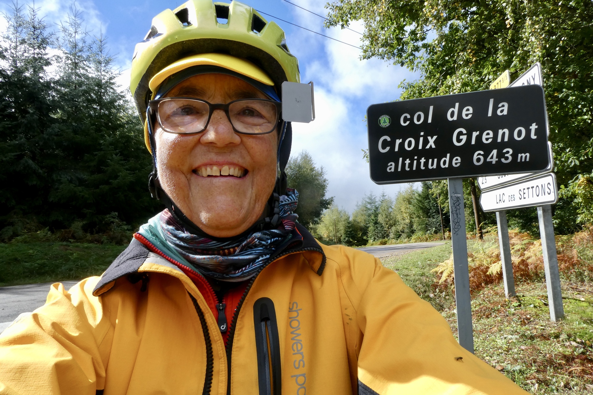 It had begun to clear up by the time I left the museum – not sunny, but the fog was lifting and the drizzling mist had dissipated. I headed south through more hilly terrain, and after a series of ups and downs I was surprised to come across the sign for the Col de Croix Grenot. Not shameless, I posed for an obligatory selfie and I then found a nearby lunch spot at one of Resistance “places of memory.” It seemed the perfect time and place to sample my Morvan goat cheese – one picked out for me by the folks at my Paris fromagerie when told I was going cycling in the Morvan. It was a stinky cheese, but I found it quite tasty, which may be a sign that I’ve been in France too long.