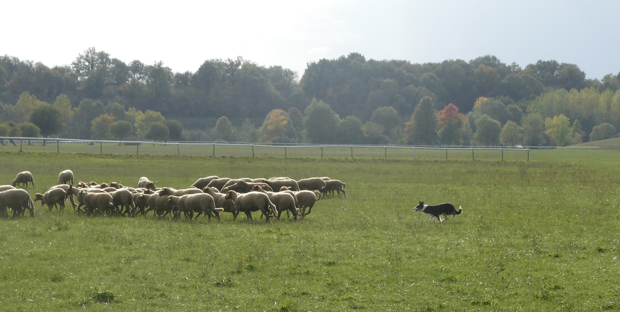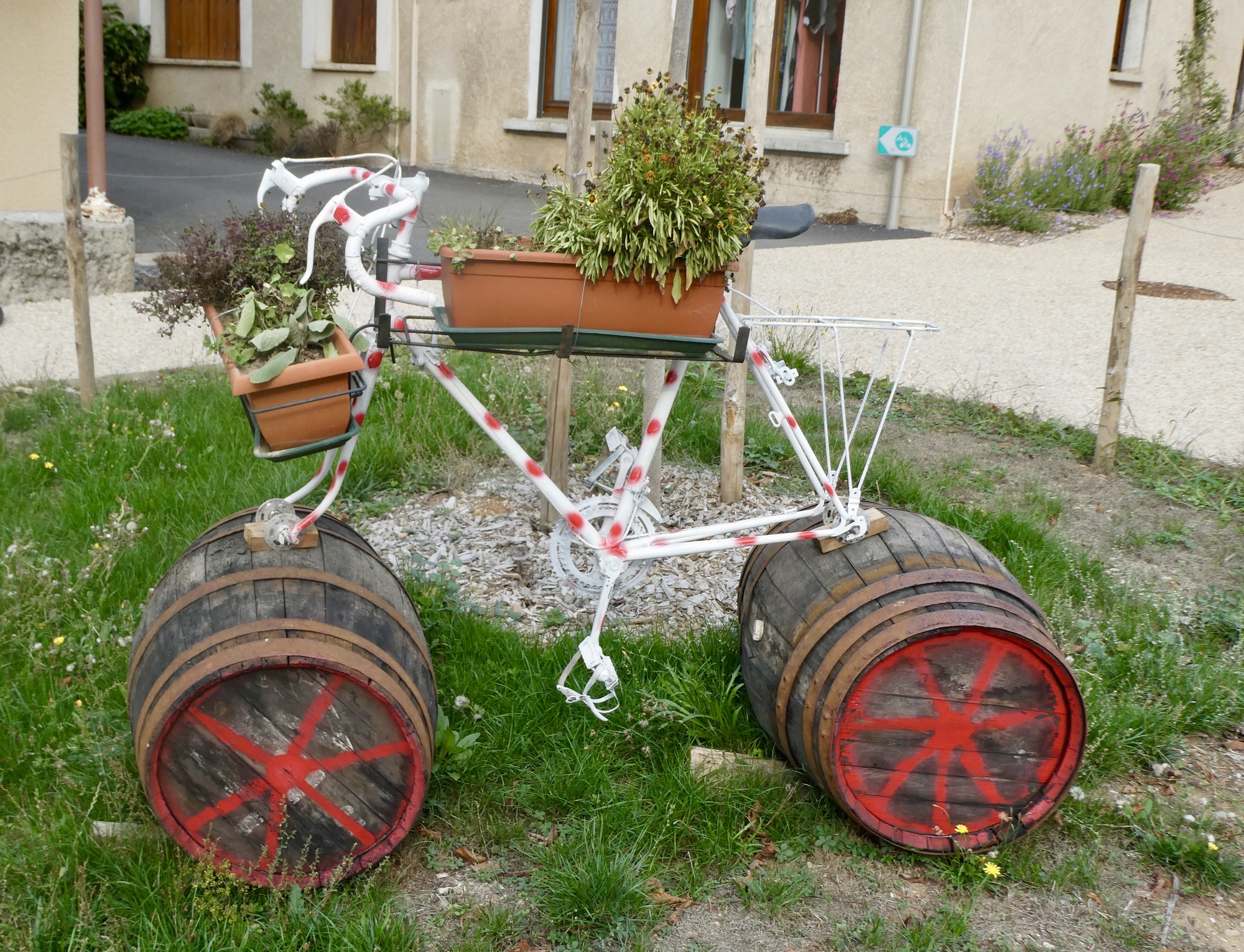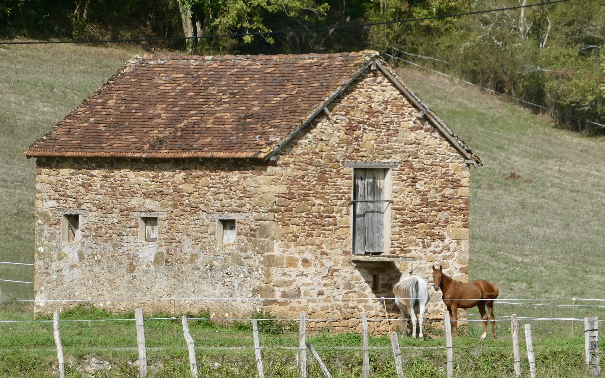 We were almost back to Gramat when I came to a large open field nestled within a wide curve in the road. A flock of free-ranging sheep grazed in the pasture and I stopped to take a few pictures, wanting to capture the sheep as well as Rachael as she rounded the curve ahead. Suddenly, there was a pounding roar that sounded like hooves approaching from my rear, then a blur of black and white sped past and made a sharp turn toward the sheep. It was a dog, a Border Collie type. Without a sound from either dog or sheep, the latter began to huddle and move as one. The dog raced from one flank of the herd to the other, driving the sheep away from the road and toward a man in the distance. At one point, his mission seemingly accomplished, the dog sat, alert with ears forward, ready for the next silent command. It was an extraordinary display of sheep herding – fast and with an economy of motion, the dog commanded the sheep, and they obeyed. All I could do was stare in amazement and snap a few photos. Scott, similarly awestruck, may have also managed to capture a few photos, or perhaps some video. Regardless, the sights and sounds of the scene is etched in both our memories.