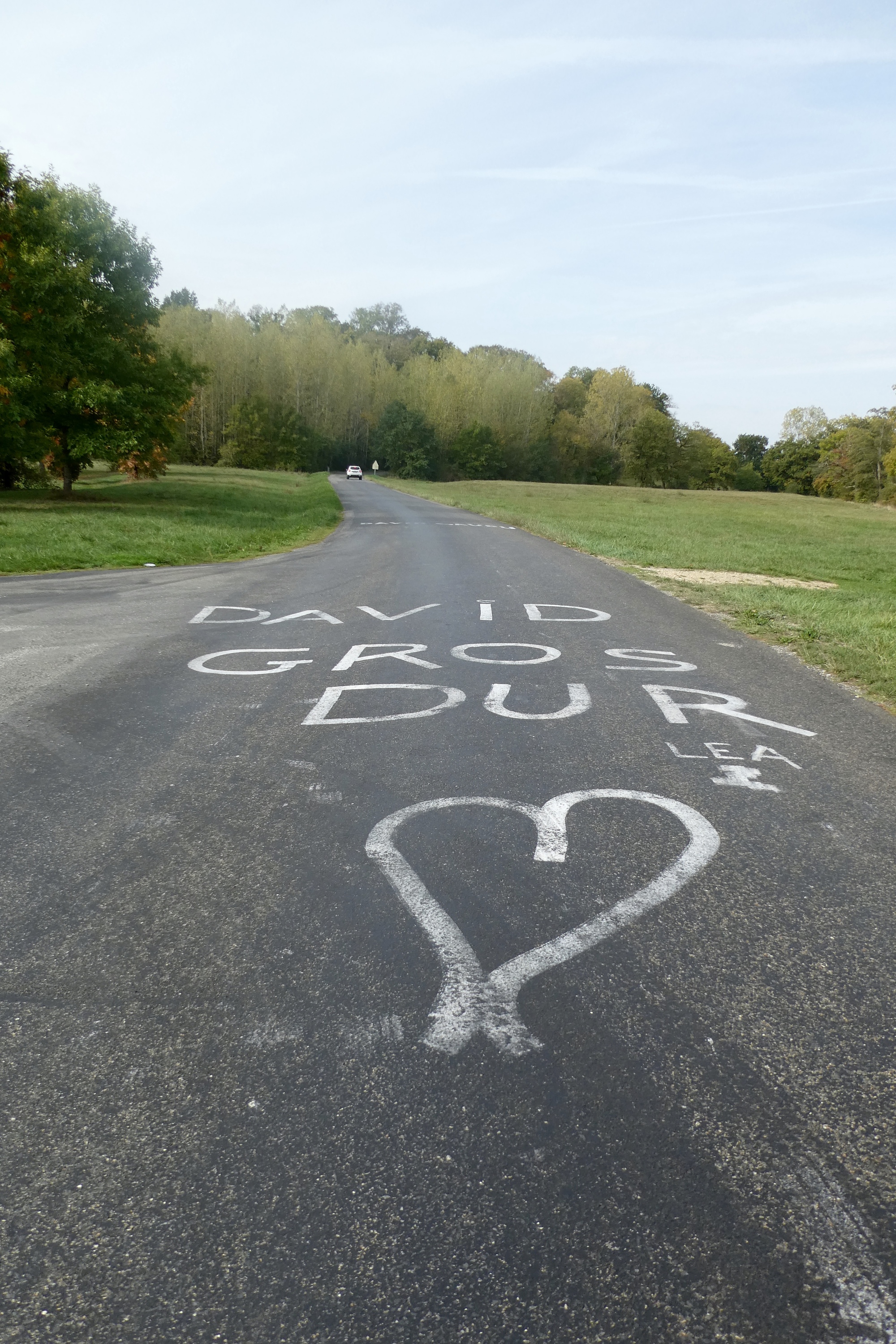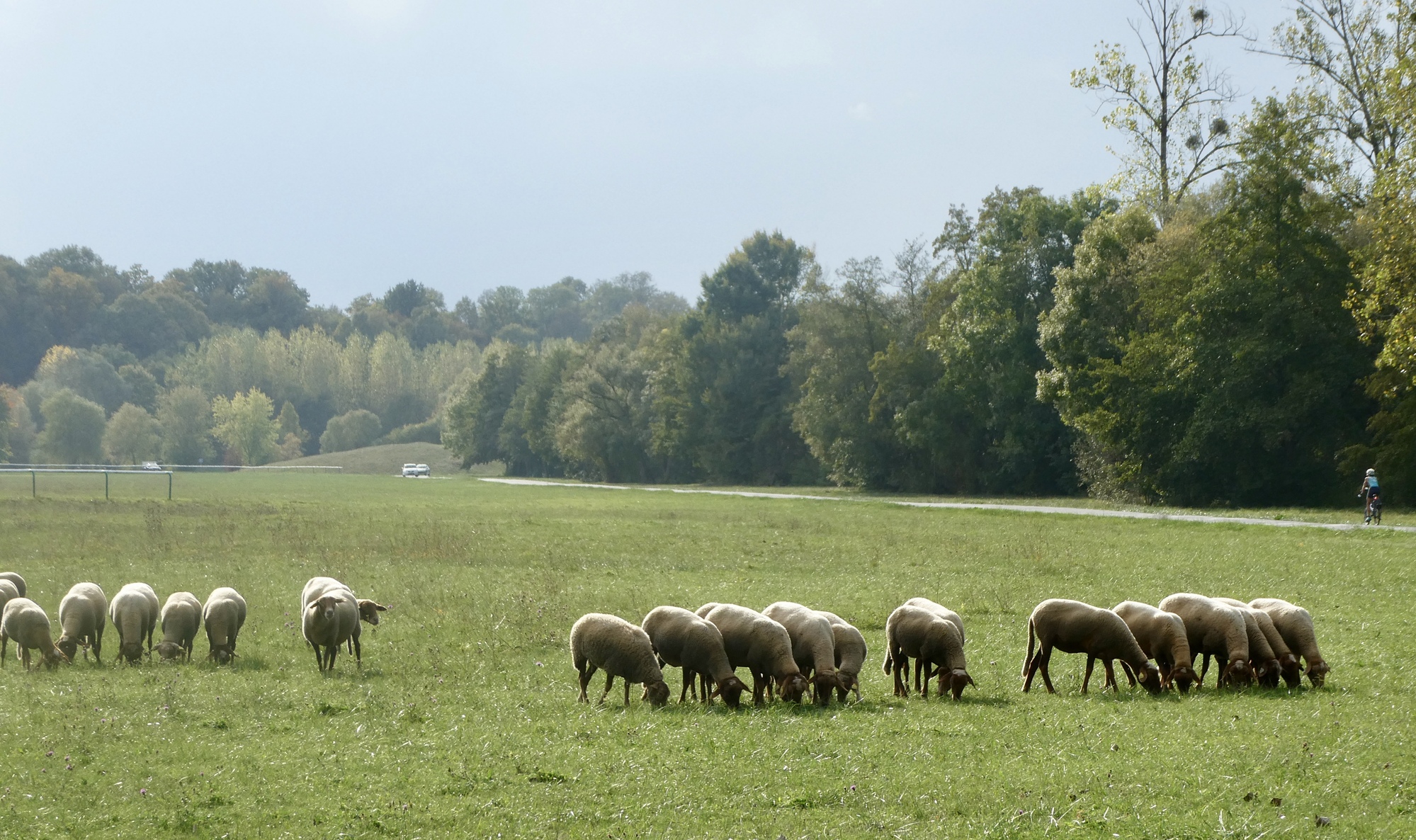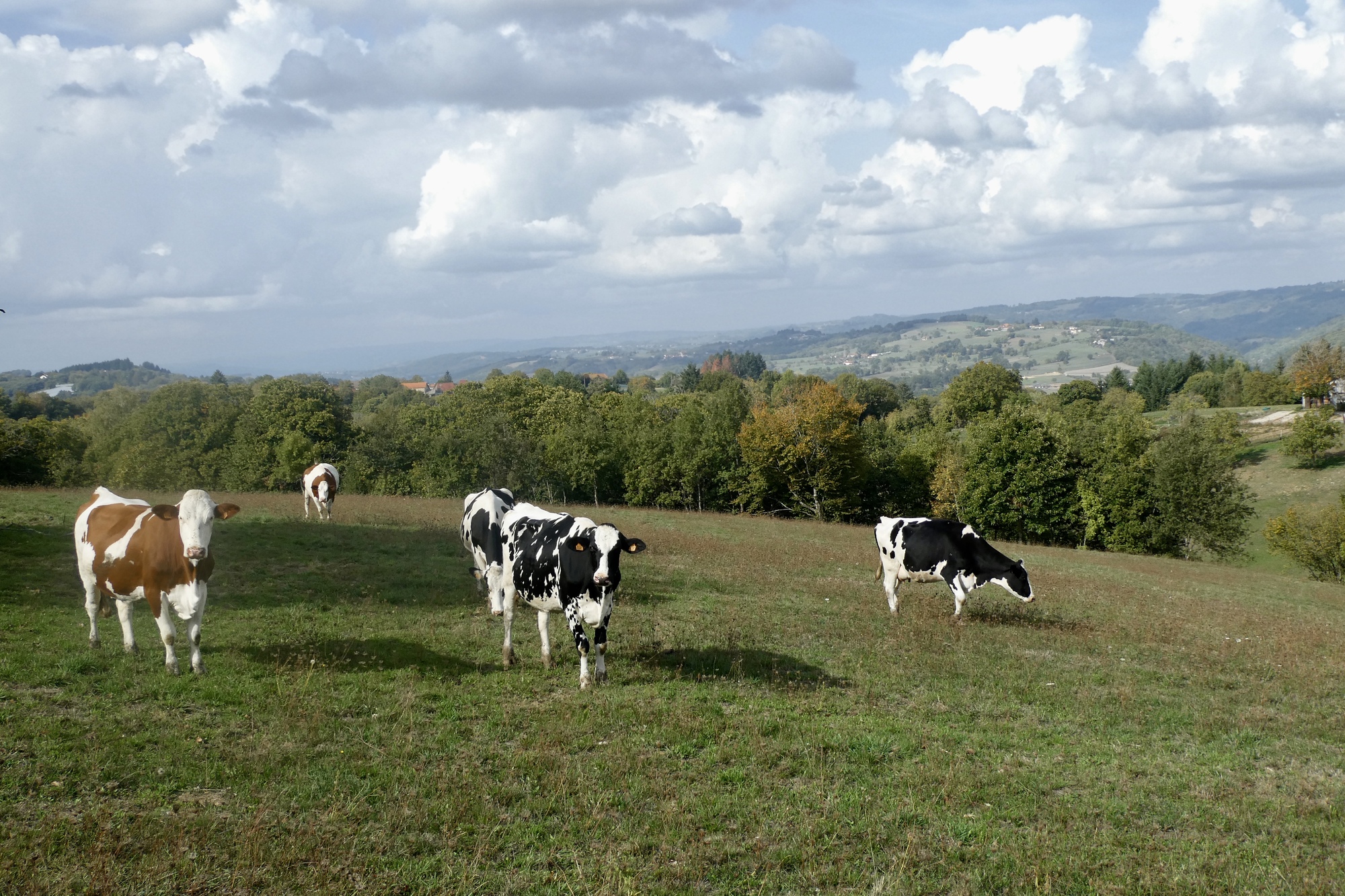 We were almost back to Gramat when I came to a large open field nestled within a wide curve in the road. A flock of free-ranging sheep grazed in the pasture and I stopped to take a few pictures, wanting to capture the sheep as well as Rachael as she rounded the curve ahead. Suddenly, there was a pounding roar that sounded like hooves approaching from my rear, then a blur of black and white sped past and made a sharp turn toward the sheep. It was a dog, a Border Collie type. Without a sound from either dog or sheep, the latter began to huddle and move as one. The dog raced from one flank of the herd to the other, driving the sheep away from the road and toward a man in the distance. At one point, his mission seemingly accomplished, the dog sat, alert with ears forward, ready for the next silent command. It was an extraordinary display of sheep herding – fast and with an economy of motion, the dog commanded the sheep, and they obeyed. All I could do was stare in amazement and snap a few photos. Scott, similarly awestruck, may have also managed to capture a few photos, or perhaps some video. Regardless, the sights and sounds of the scene is etched in both our memories.