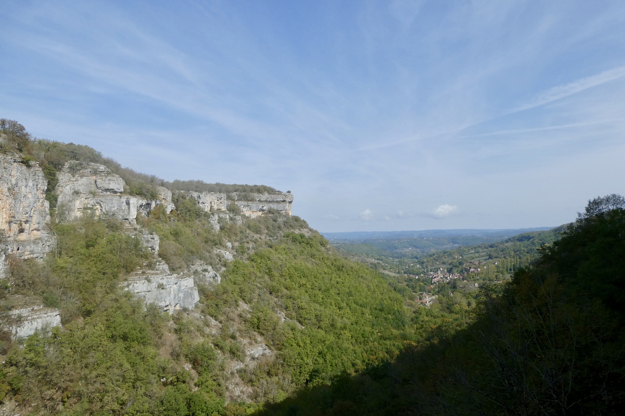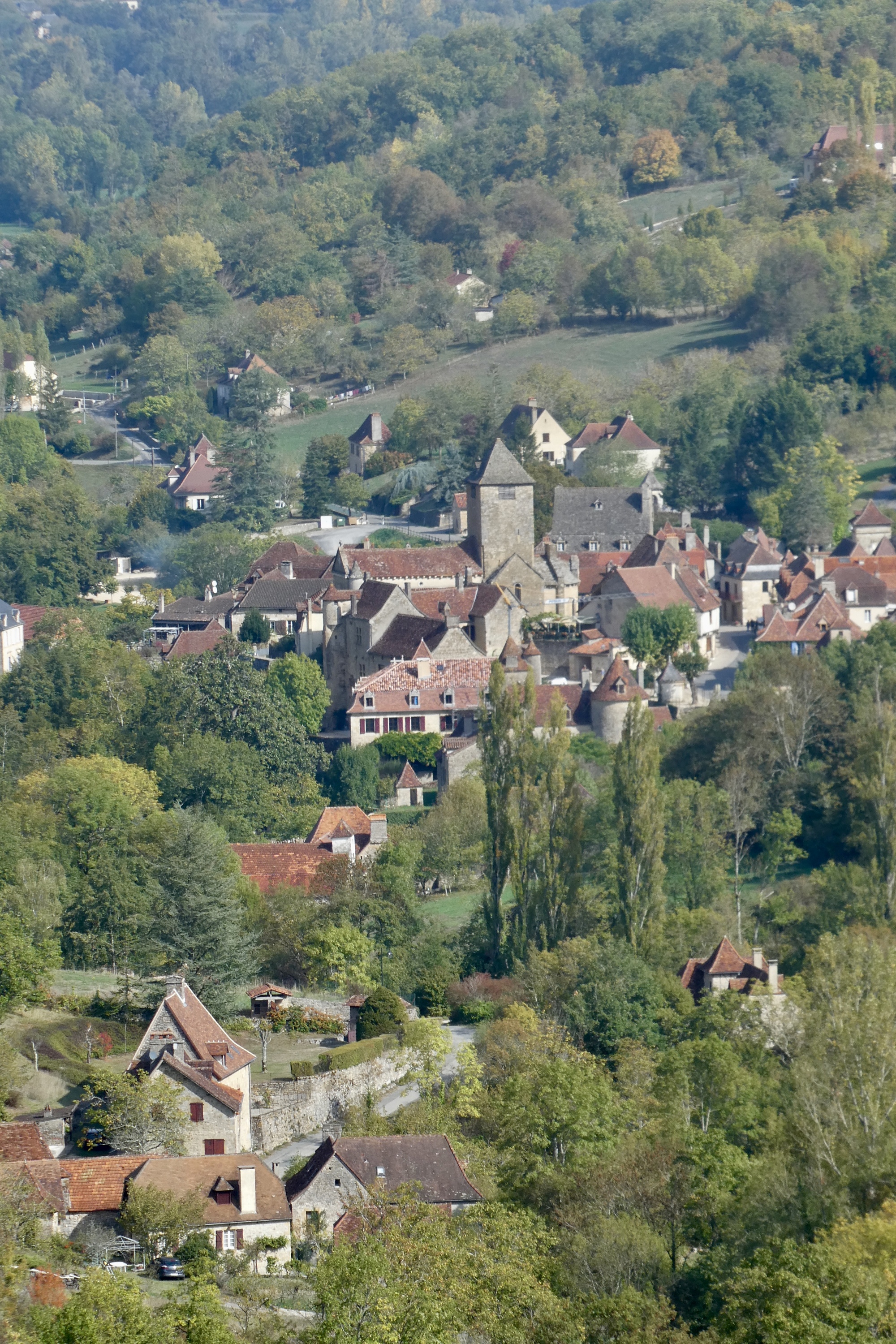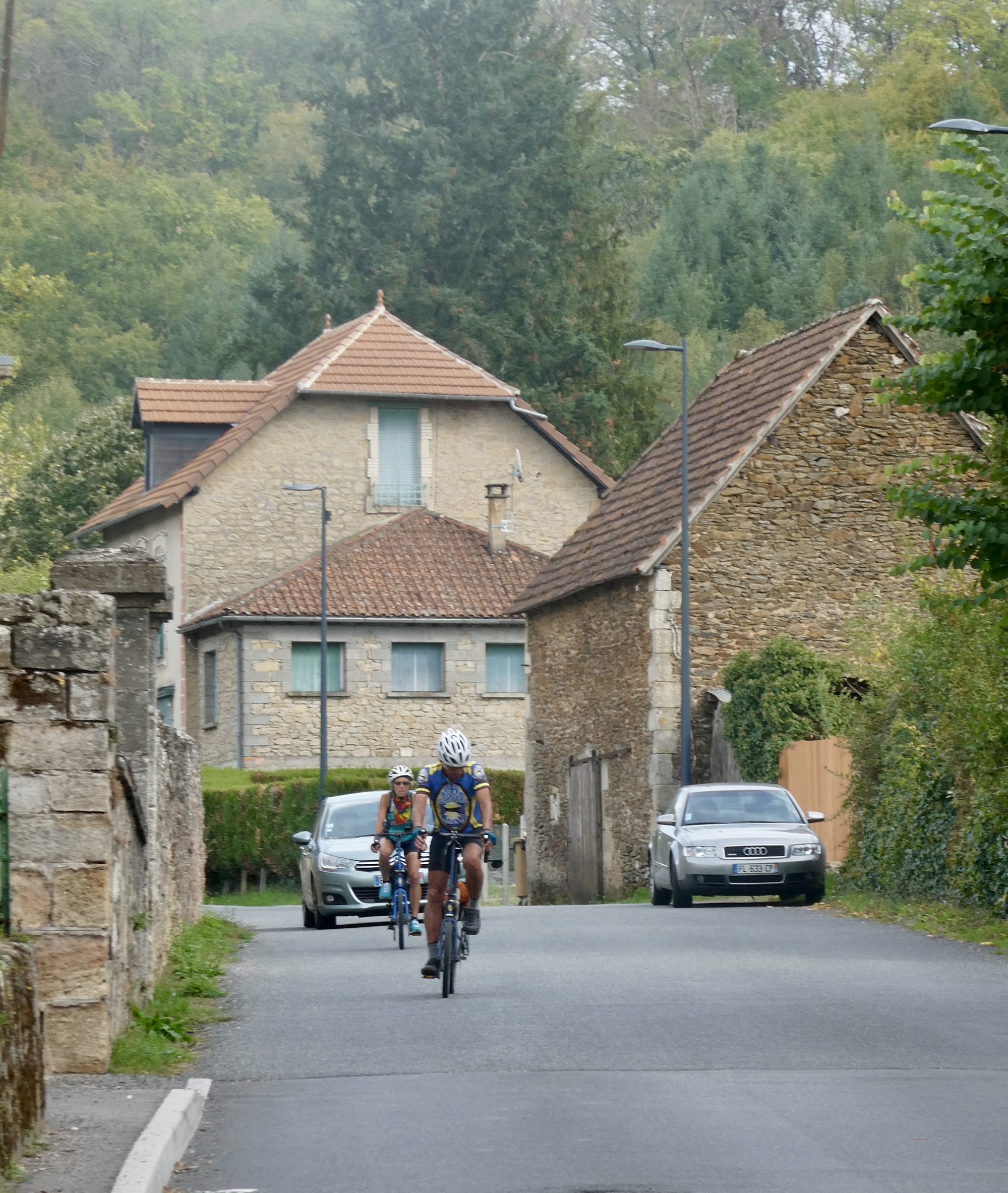 After leaving Autoire, there was a nice five mile stretch along the valley to Saint Cêré, followed by a nine mile climb back up to the causse. Though there was some apprehension about the climb, it was actually more fun than painful. The first section rose gently through the woods, while final section was perhaps a bit steeper, winding through open pastures with splendid views of the surrounding countryside. The descent was as pleasant as the climb – gently unfolding with wide curves, necessitating minimal braking until the final drop into Aynac.