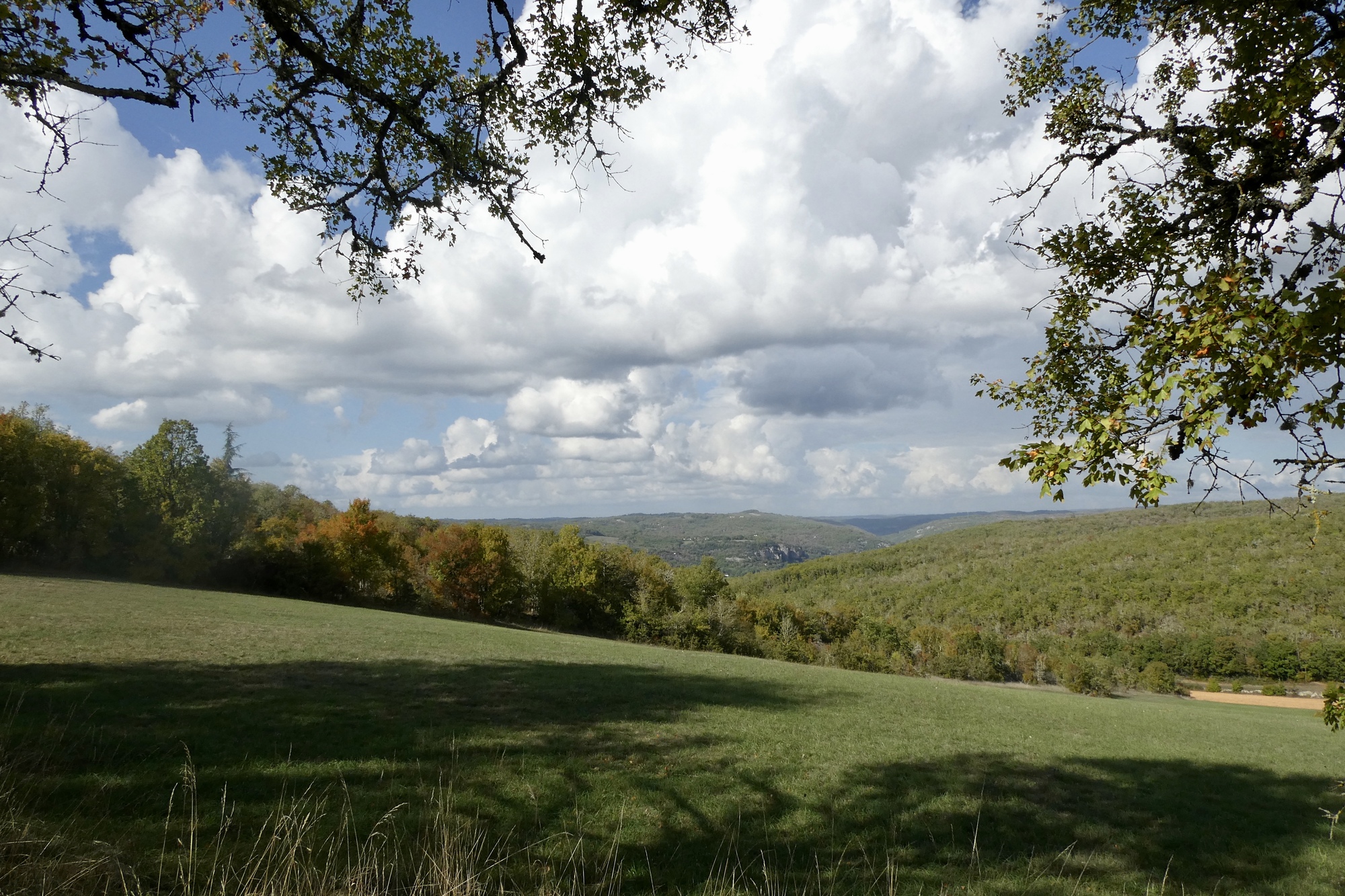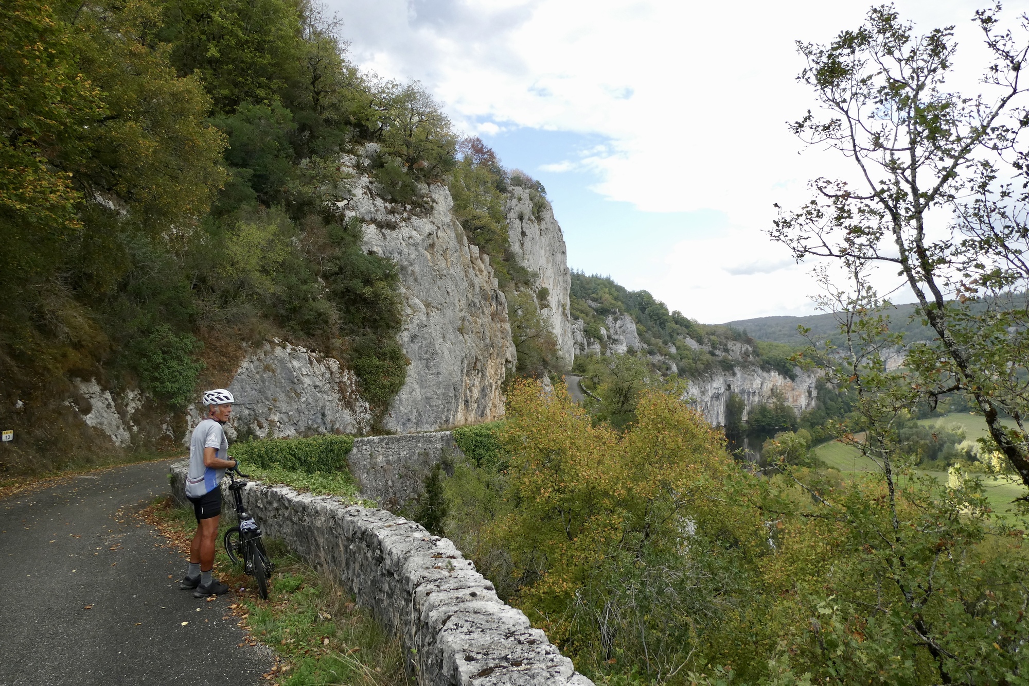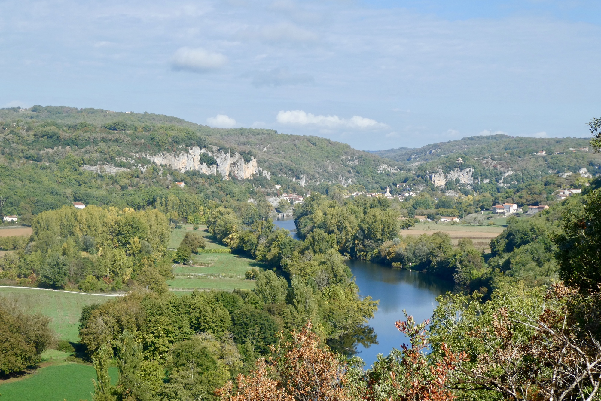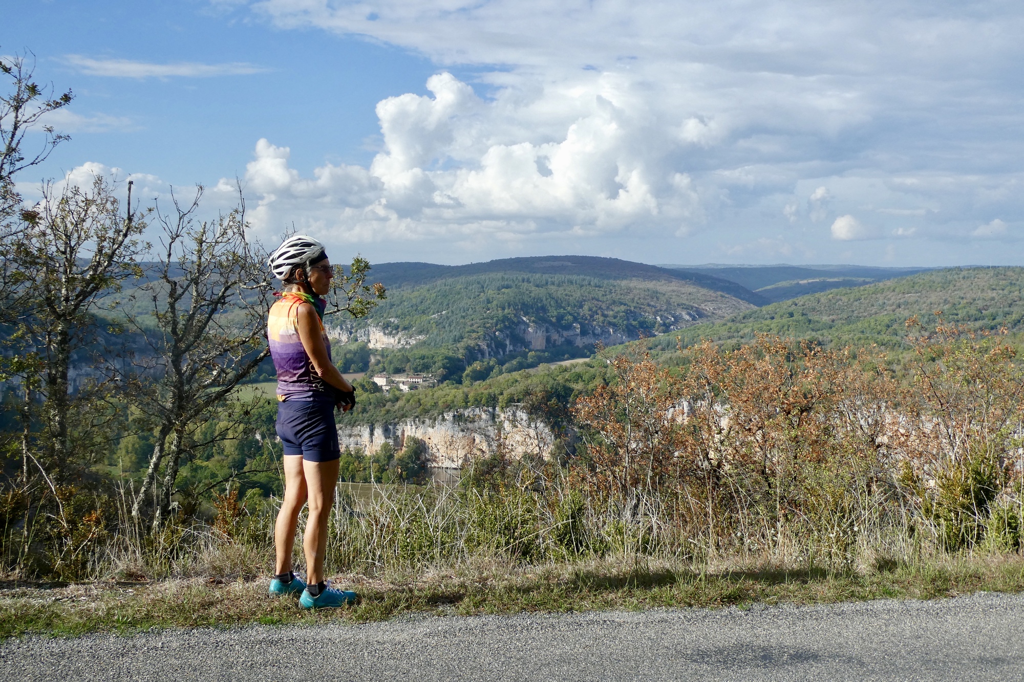 The return to Bouziés started out on a six-mile backtrack of our route into Cahors. Just past Arcambal, however, we climbed away from the river and onto the causse, reaching the highest point of the day in Berganty. We rolled across the top of the causse for another eight miles, and although the views were limited by trees, the cycling was relaxed and enjoyable, with Rachael and I riding together and chatting away. There was a lovely descent that steepened a bit before we rounded a curve and were suddenly at an overlook facing Saint-Cirq-Lapiope. Rachael and I stopped at the viewpoint, basking in the sun while waiting for Scott catch up.