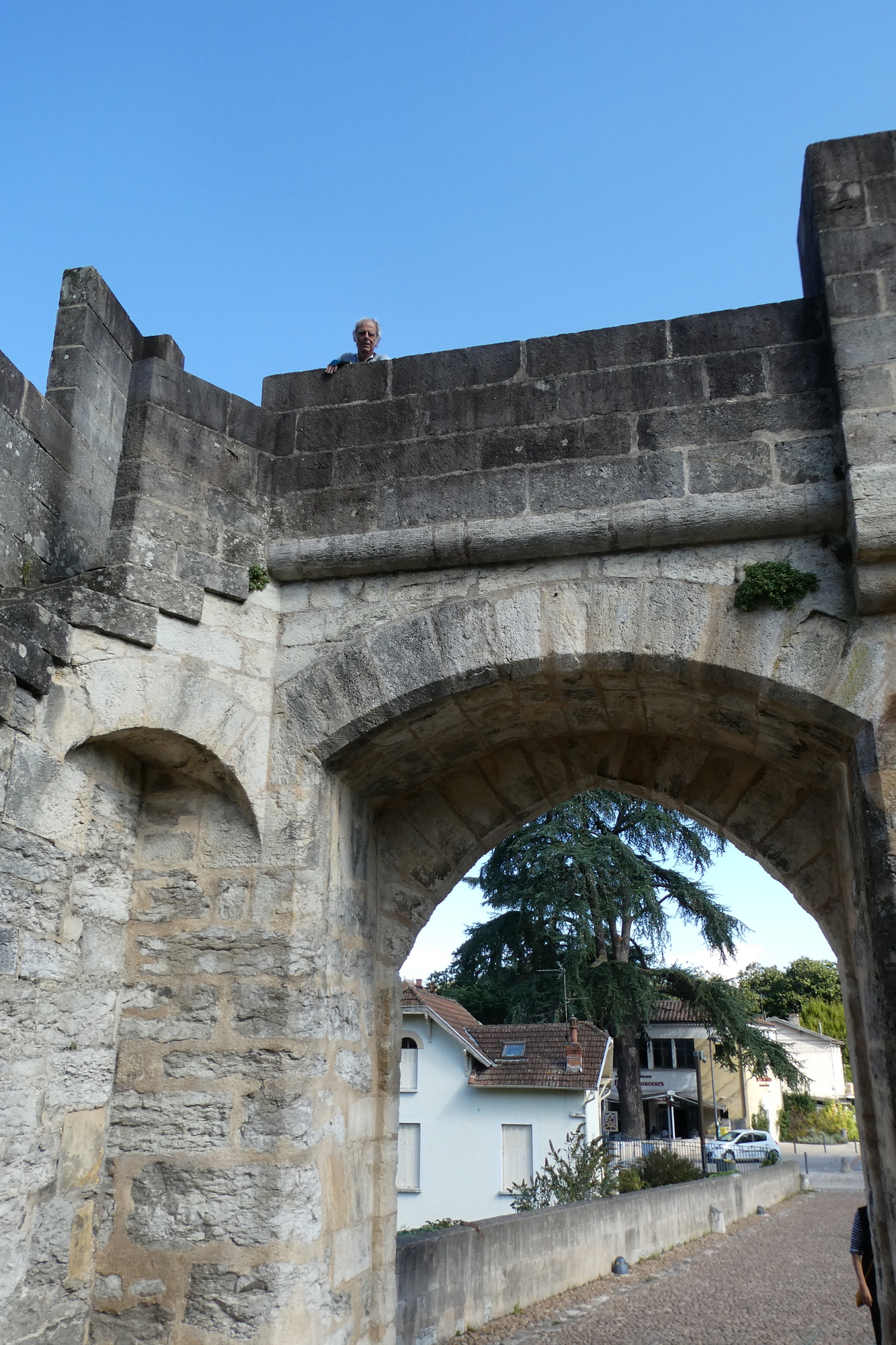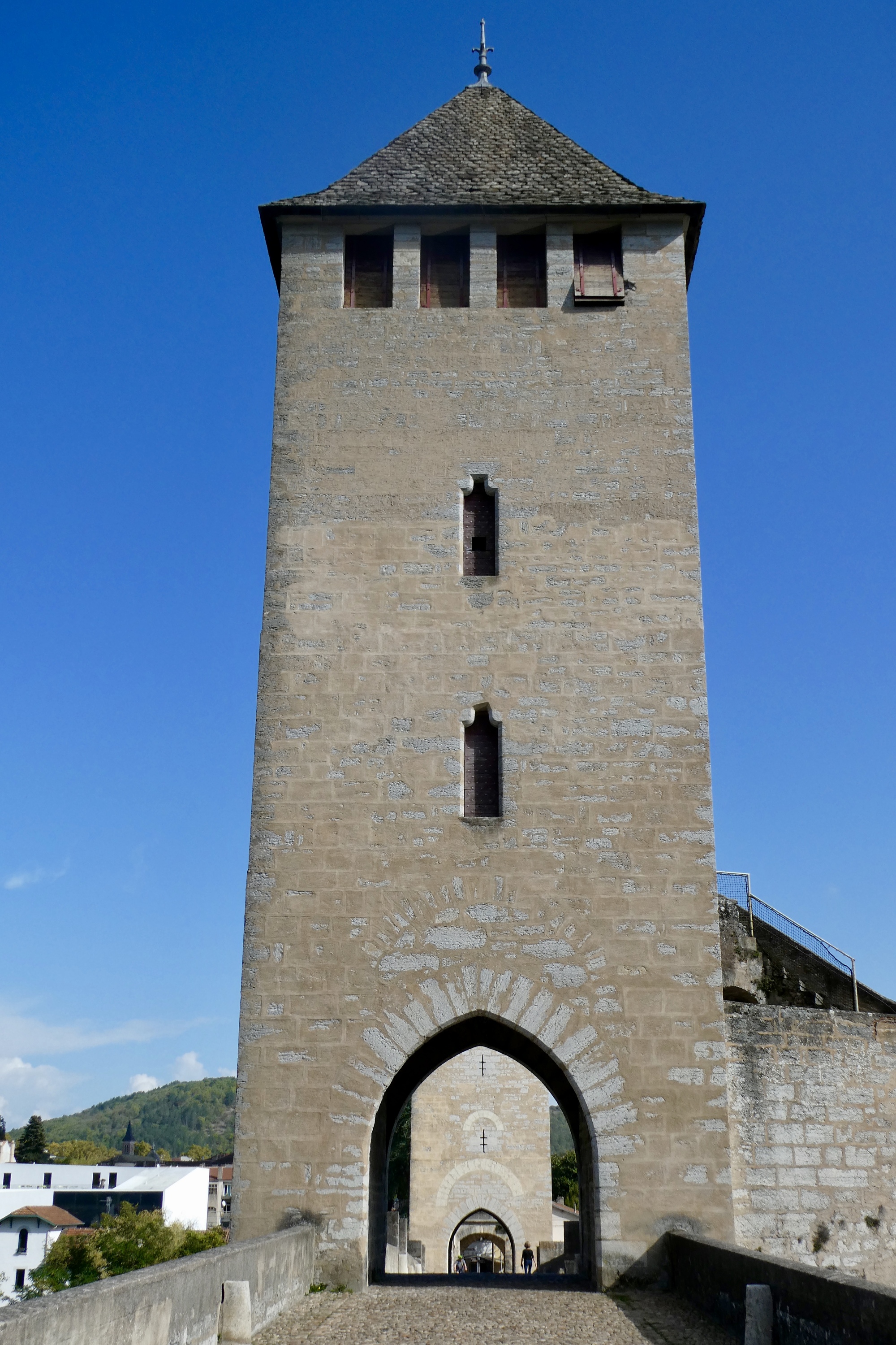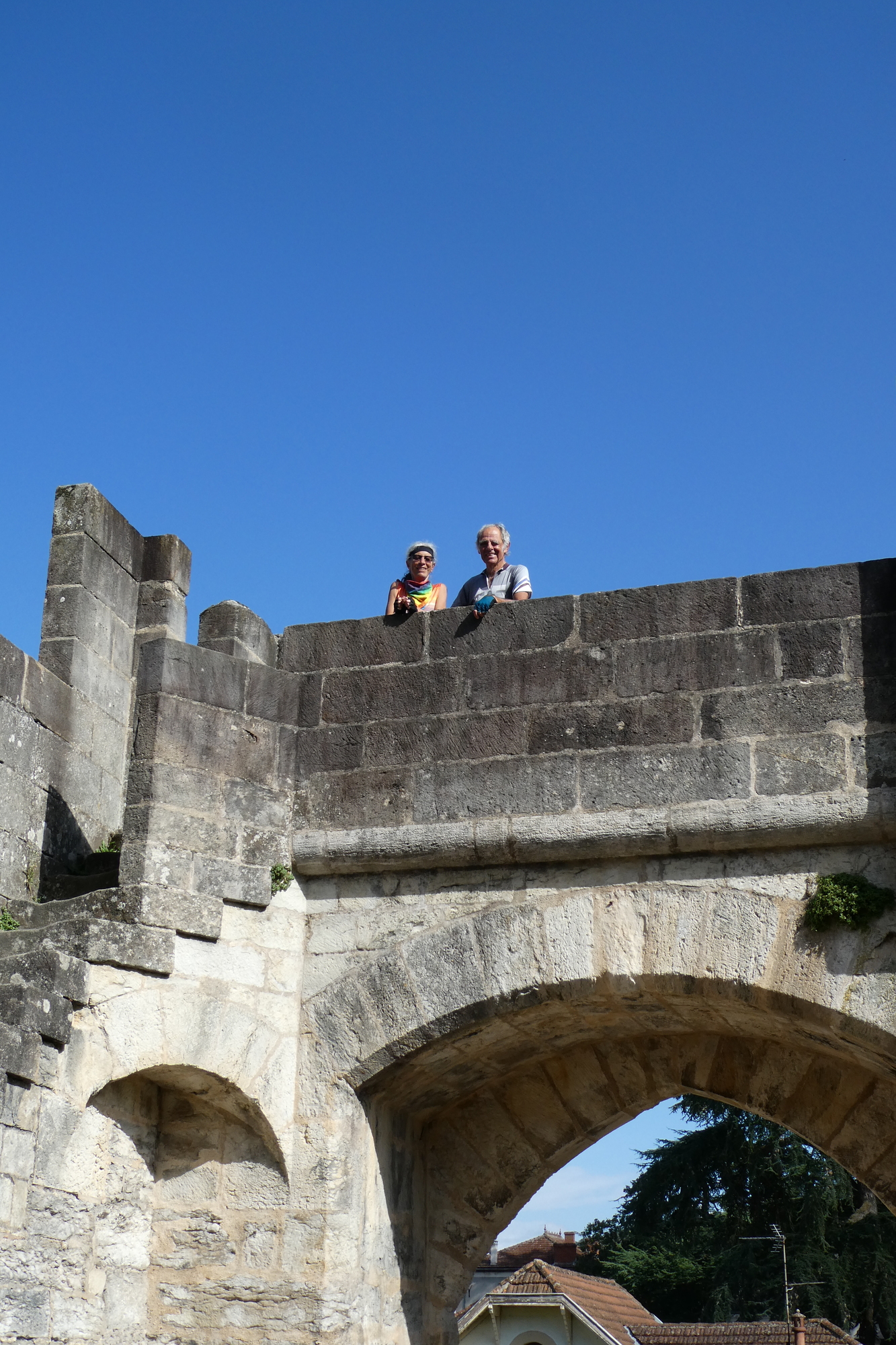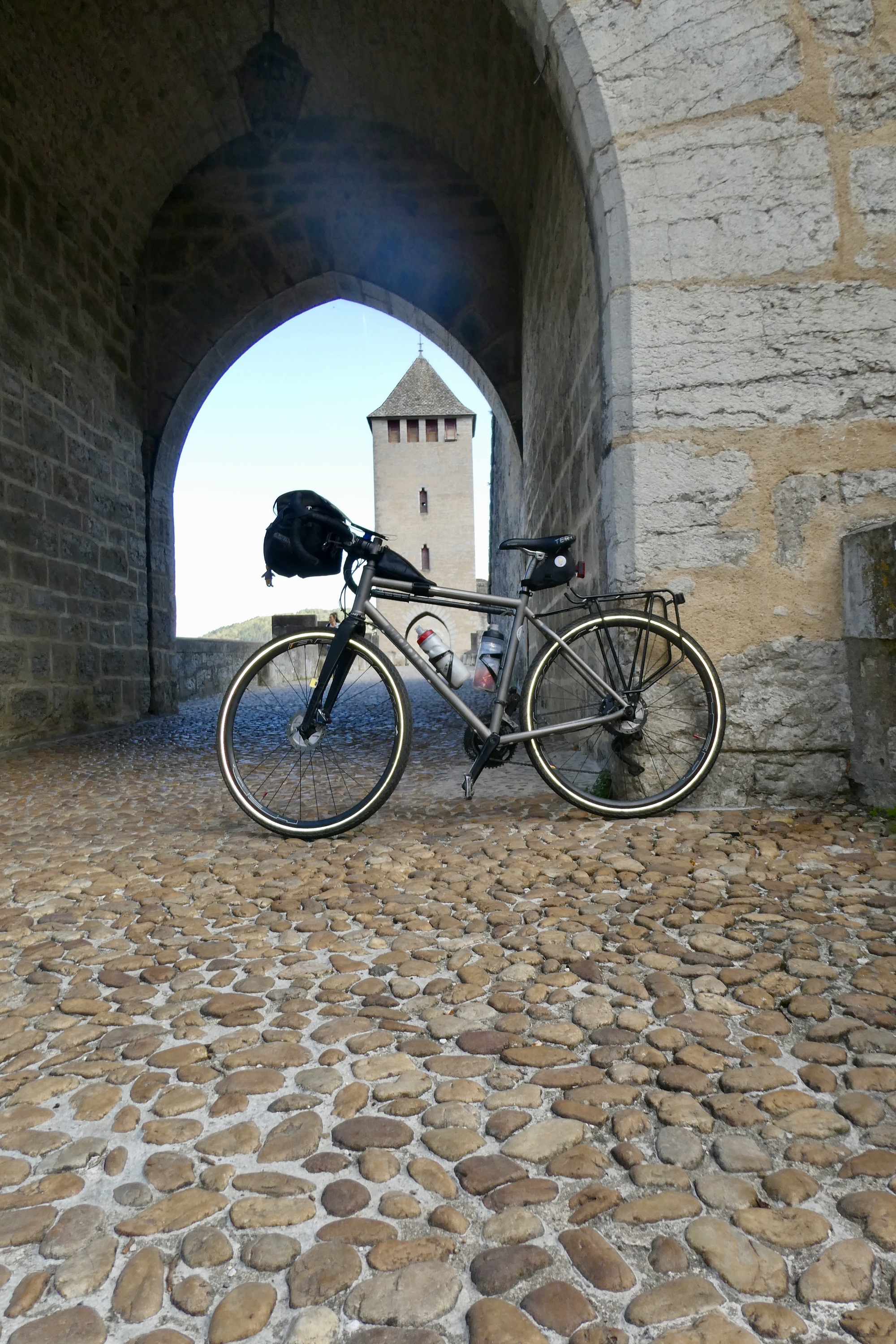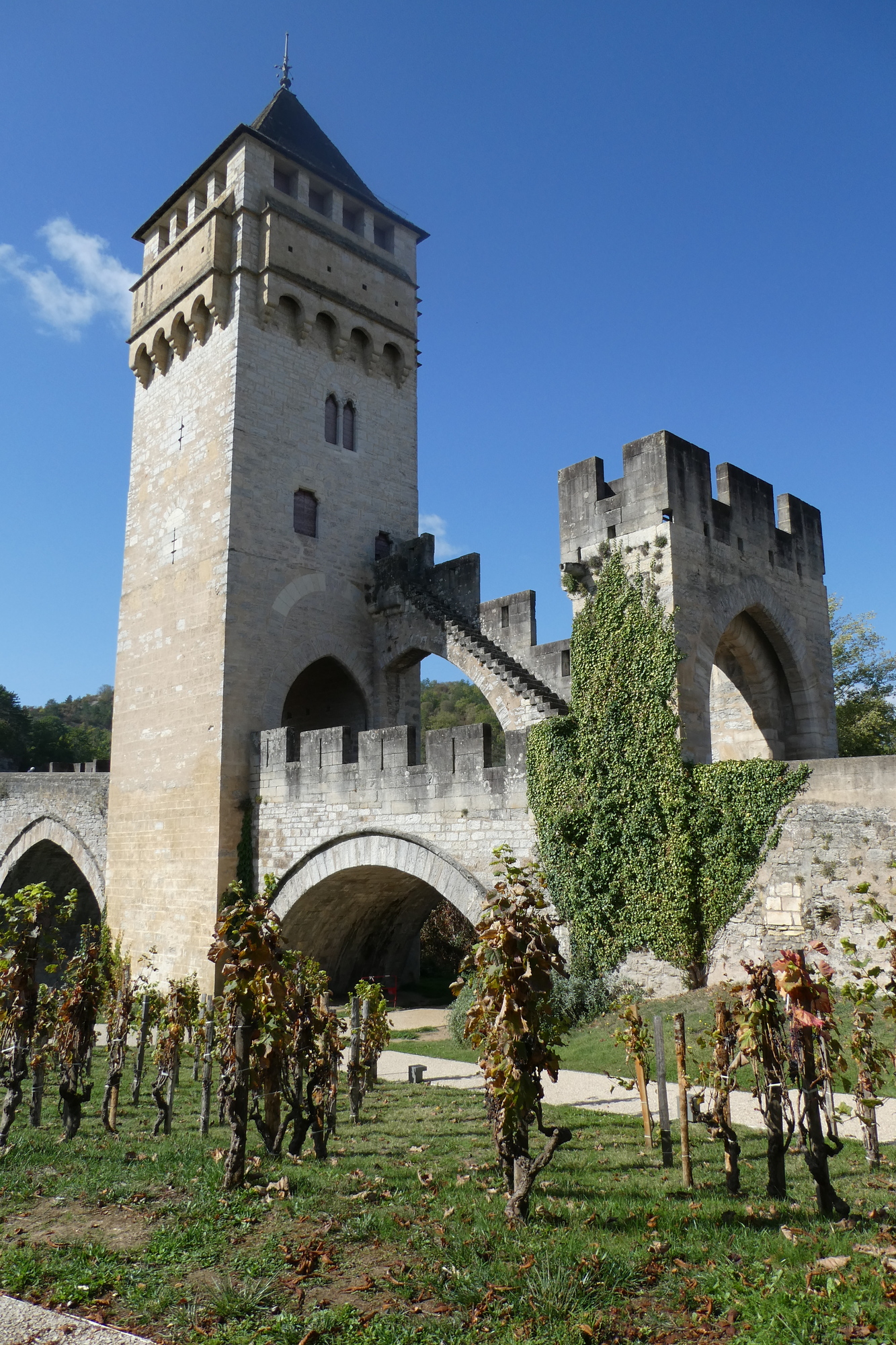 We picked up a bike path entering Cahors, staying on the south side of the river and searching for a picnic spot that would give us a nice view and/or bathroom facilities. We found the former, a park bench in the sun with an unobstructed view of Pont Valentré, a 14th century bridge with three fortified towers. The Pont Valentré is also called the Devil’s Bridge, and after lunch we three acted like little imps, scrambling up and down the archway stairs to pose for pictures/get a better view. Surviving our hijinks without plunging to the cobbles below, we headed back to Bouziés.