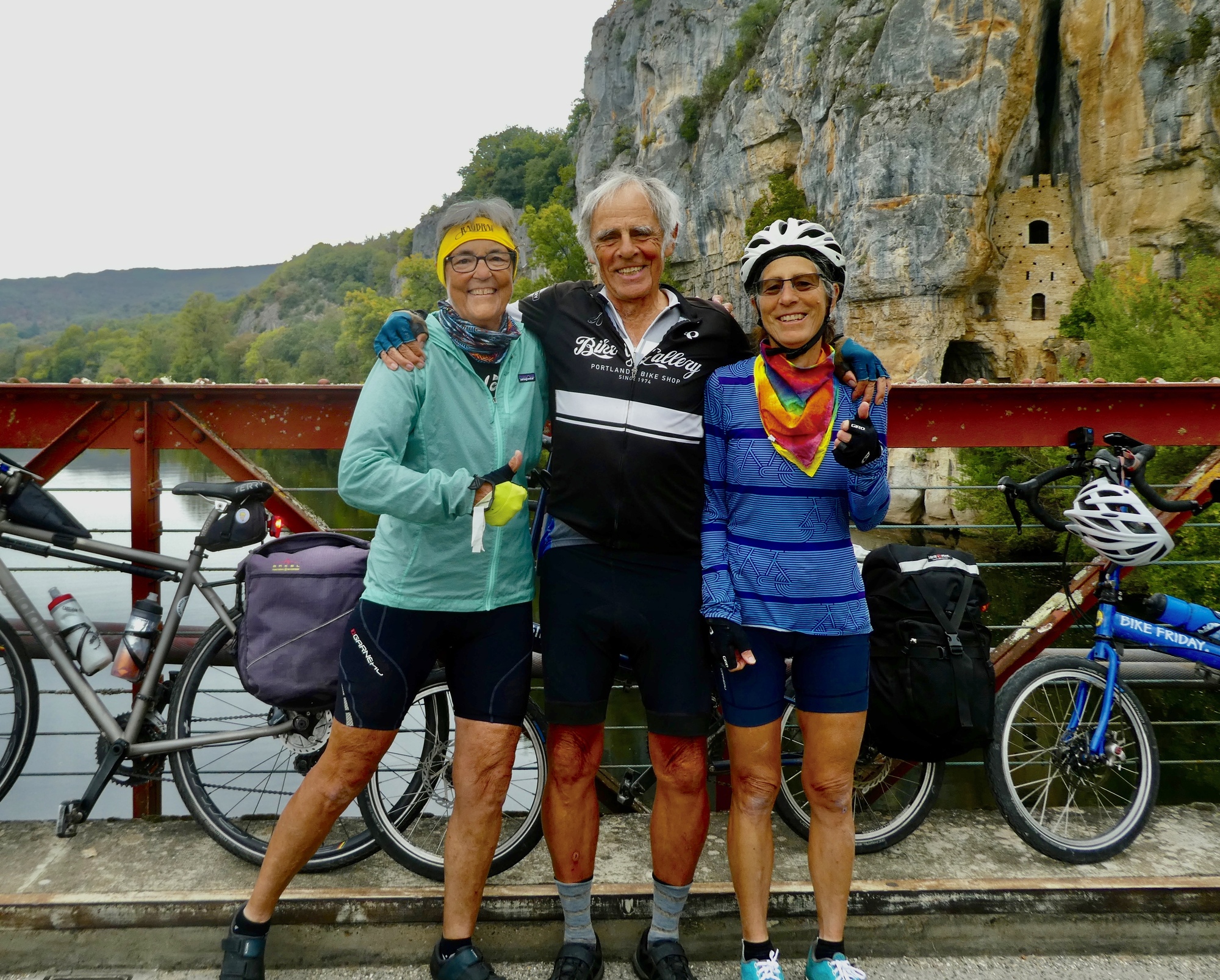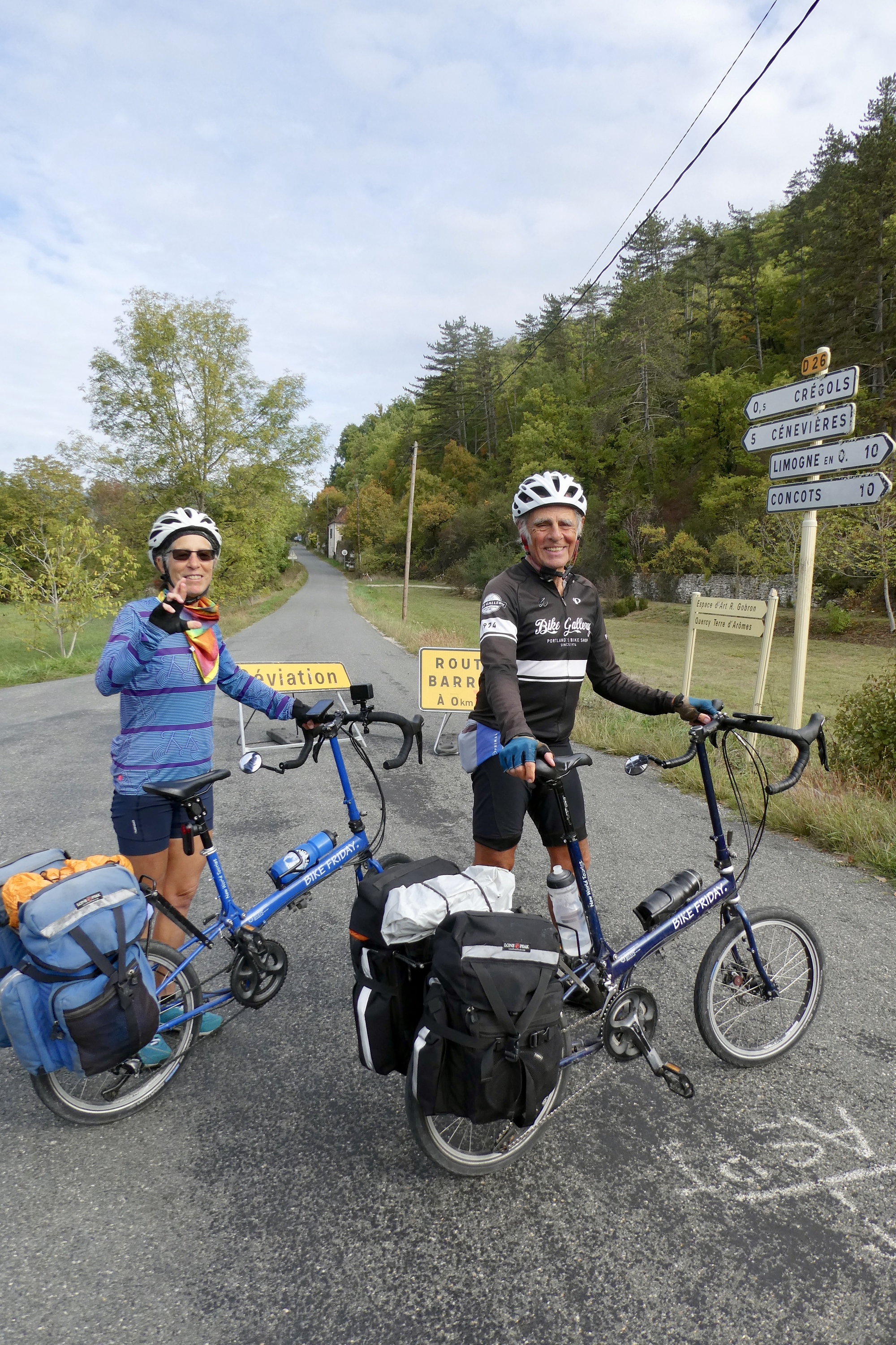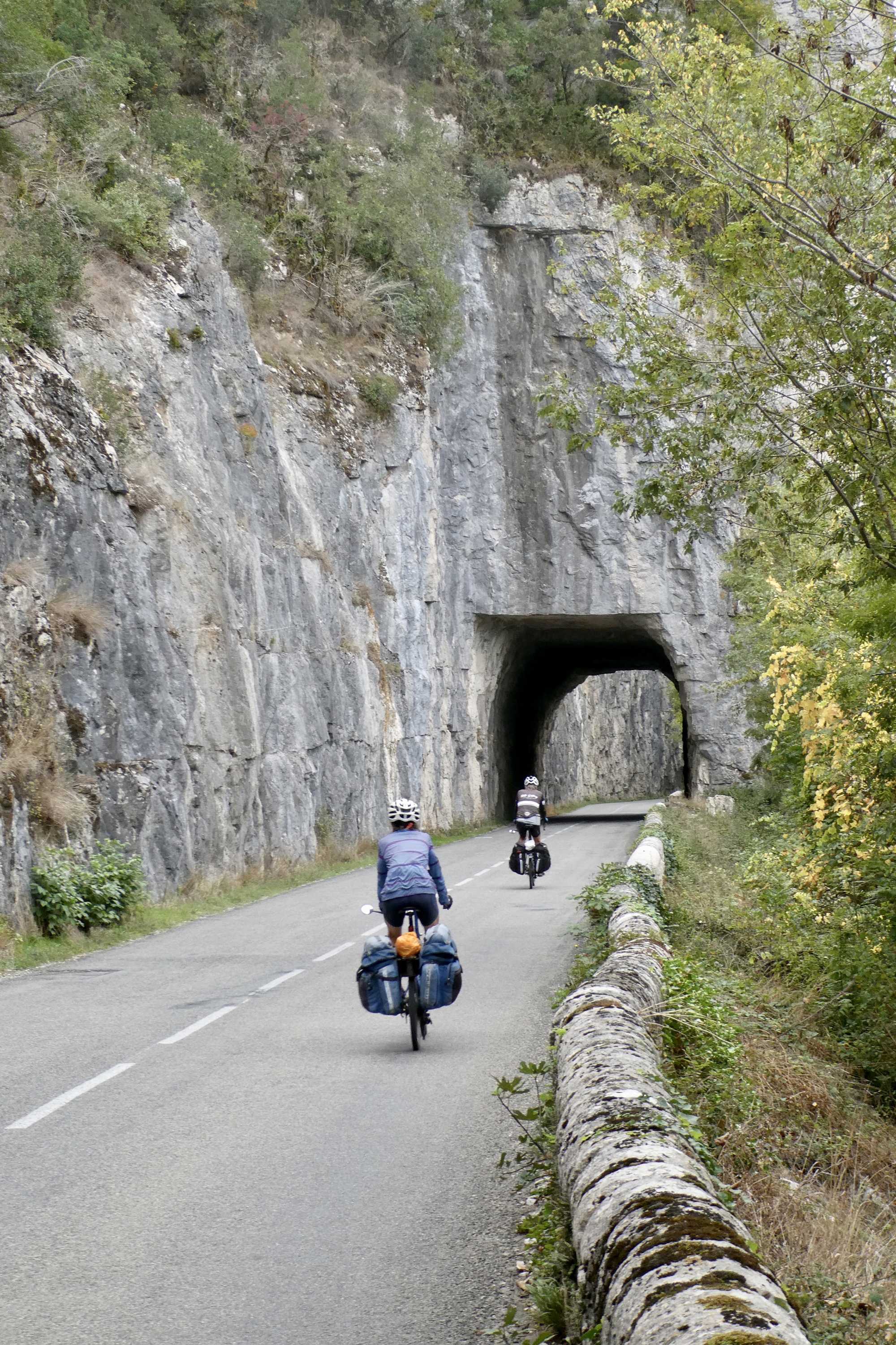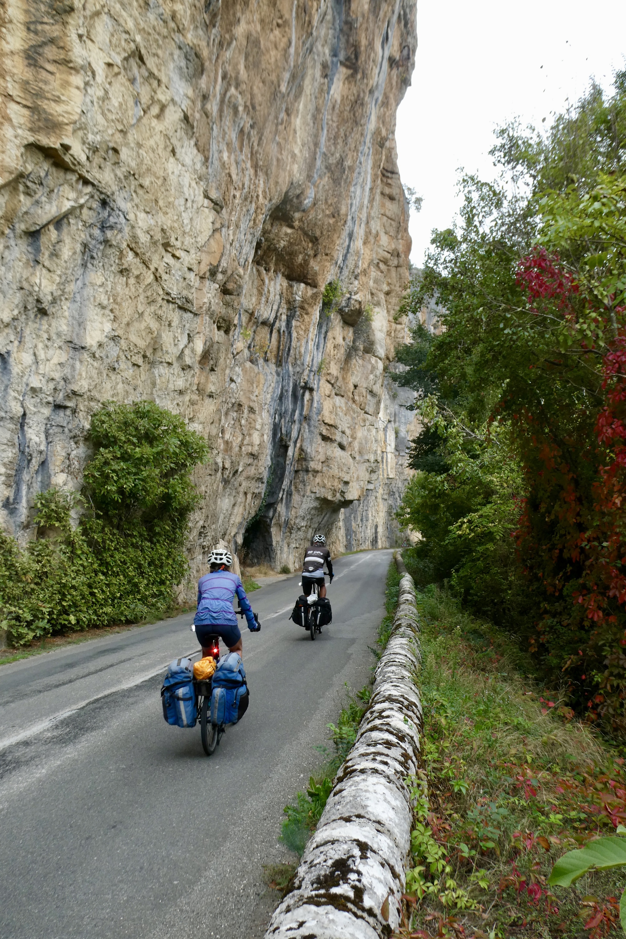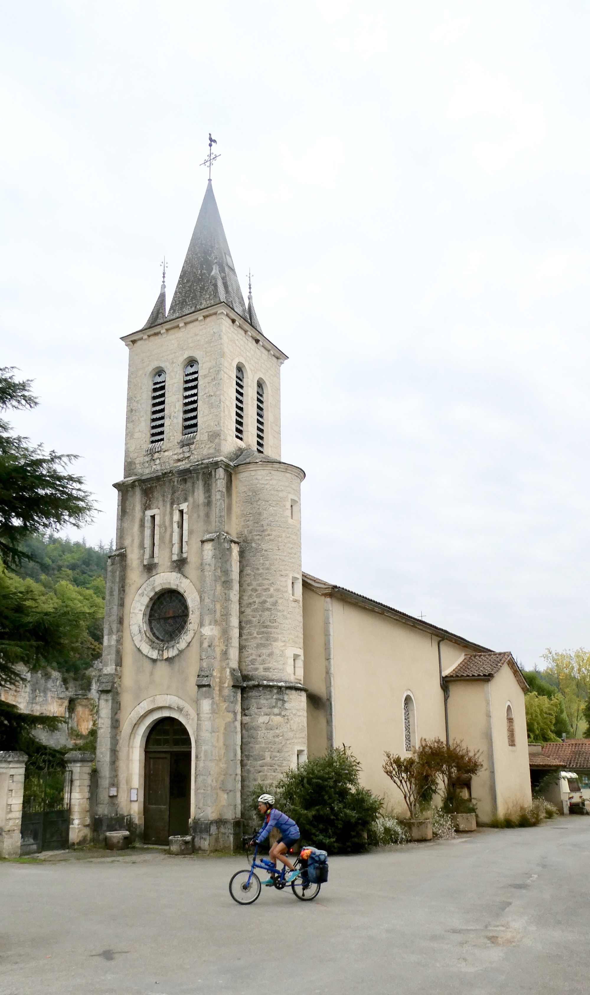 Today I was parting ways with Team Anderson: they were heading east up the Lot River whereas my route was south, to the Aveyron and Tarn rivers. Our routes out of Bouziés overlapped for the first few miles, so we planned to head out together not too long after breakfast as rain was predicted by mid-afternoon. It was cloudy and chilly as we rode out of town, pausing for one last picture on the suspension bridge before turning up the Lot River. I savored these last miles along the Lot, under soaring cliffs and in the company of Scott and Rachael - we’d had some magical rides and memorable moments over the last few days, and I look forward to when we might meet again.