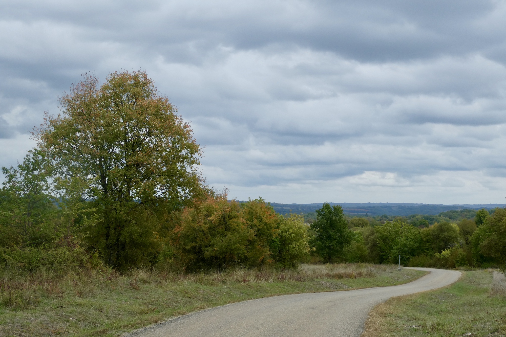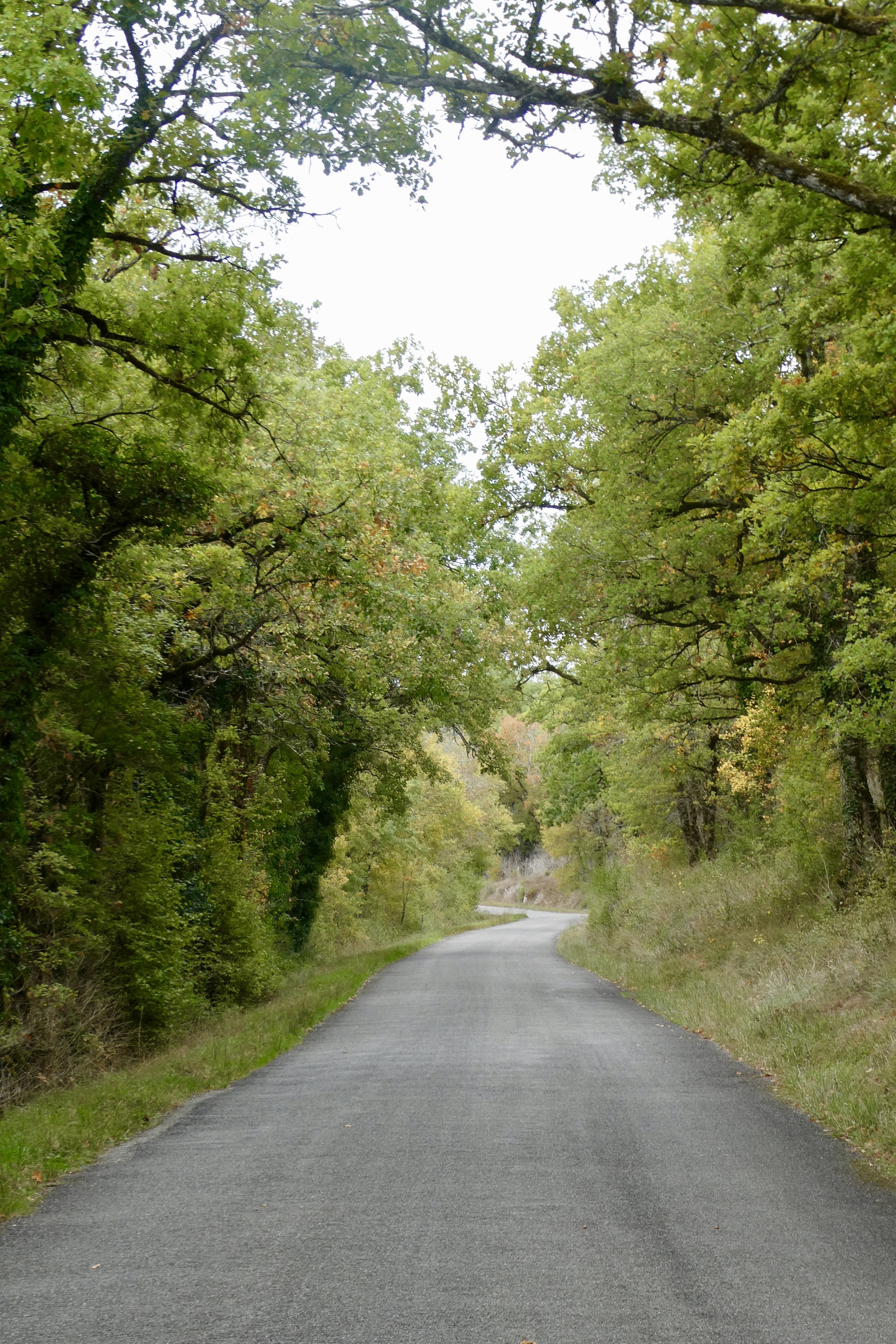My destination today was Saint-Antonin-Noble-Val, a place I first visited while wandering through southwest France in 2019. After bidding farewell to Team Anderson, I turned south and climbed up through the woodlands of the Causses du Quercy to the small village of Concots. The woods were rich in yellows and burnt orange, full of moss-covered stone walls that told of former homesteads and pastures. It reminded me a bit of Vermont, which is said to once have been two-thirds open land, but is now two-thirds wooded.