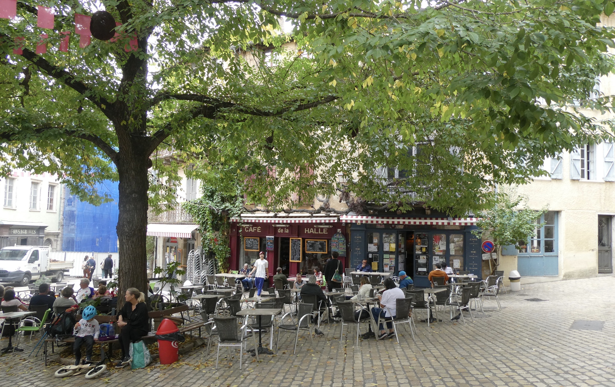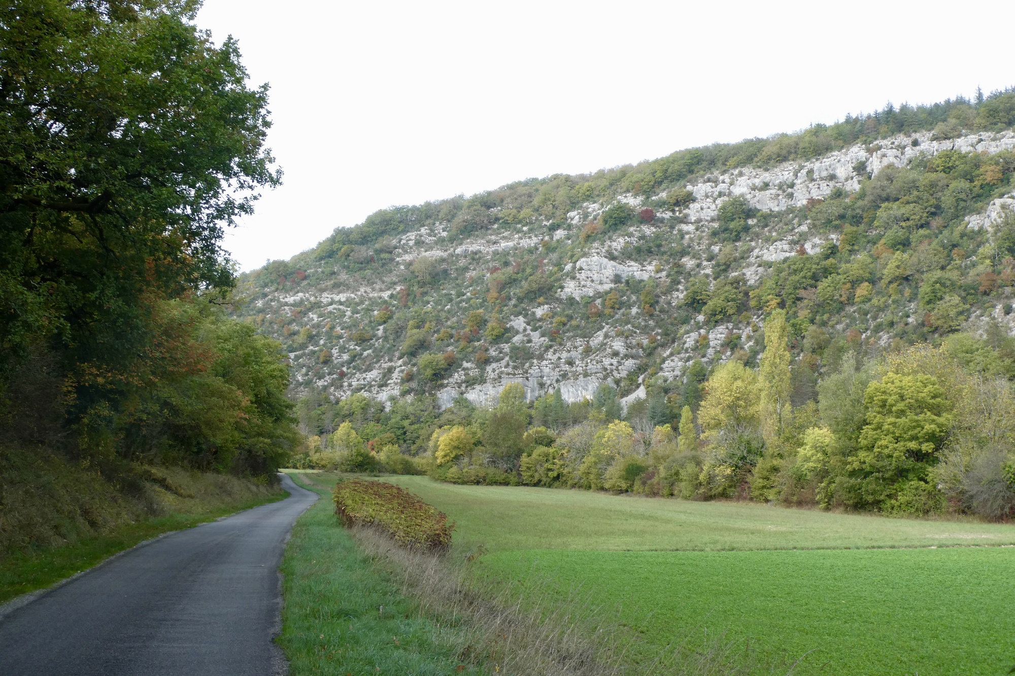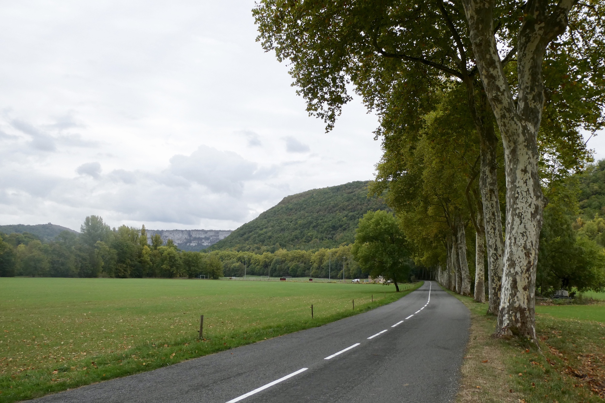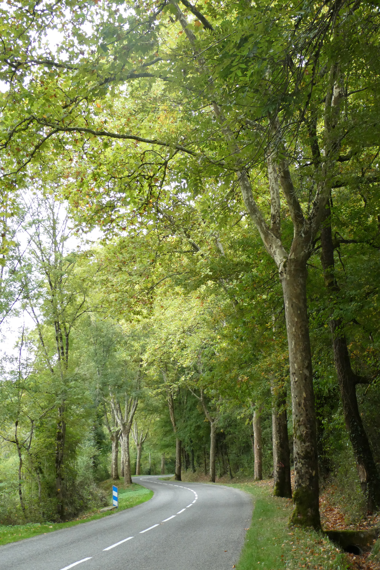 I finally left the military base, passing down through Loze and continuing along tree-lined roads that offered only glimpses of the surrounding countryside. By the time I reached Caylus, I was anxious to get to Saint-Antonin-Noble-Val and passed through without a look. The last miles into Saint-Antonin-Nobel-Val were a repeat of a magical ride I’d taken there in 2019 – after a long afternoon in the rain, I seemed transported down a smooth, newly sealed road through a canopy of plain trees. That seven-mile stretch along the Bonnette River had been exhilarating, completely reversing my gloomy mood. I was a bit anxious today to see if the magic remained and, to a very large extent, it had. The road had been patched a bit and I was not in the doldrums, but the plain trees and limestone cliffs above the Aveyron retained their magic.