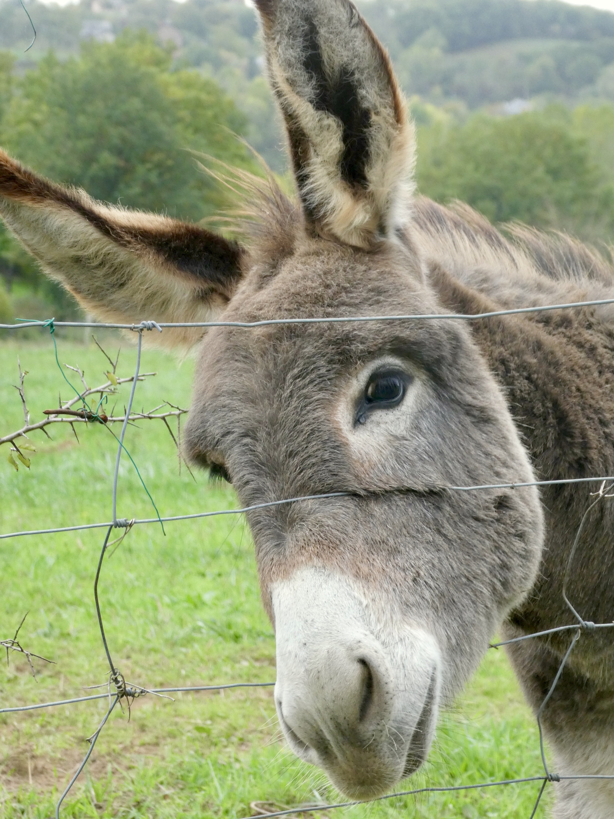 Back down near the river, I came upon a pasture of donkeys, all grouped at the far end of the field. Of course I stopped, and was reaching for my camera when Juliette detoured from her walk to discuss cycle touring and route mapping. We had a most agreeable chat, and by the time she ambled off several of the donkeys had crossed the pasture to check us out. One girl was quite curious, but after establishing that I had no goodies to share, she resorted to munching grass. As she turned away, a young donkey emerged from behind, one hidden so well that unless you counted legs you would have no idea there were two donkeys rather than one. I was instantly smitten by this shy young thing, especially when she poked her nose through the fence, imploring me for an apple. Alas I had none, or so I thought.