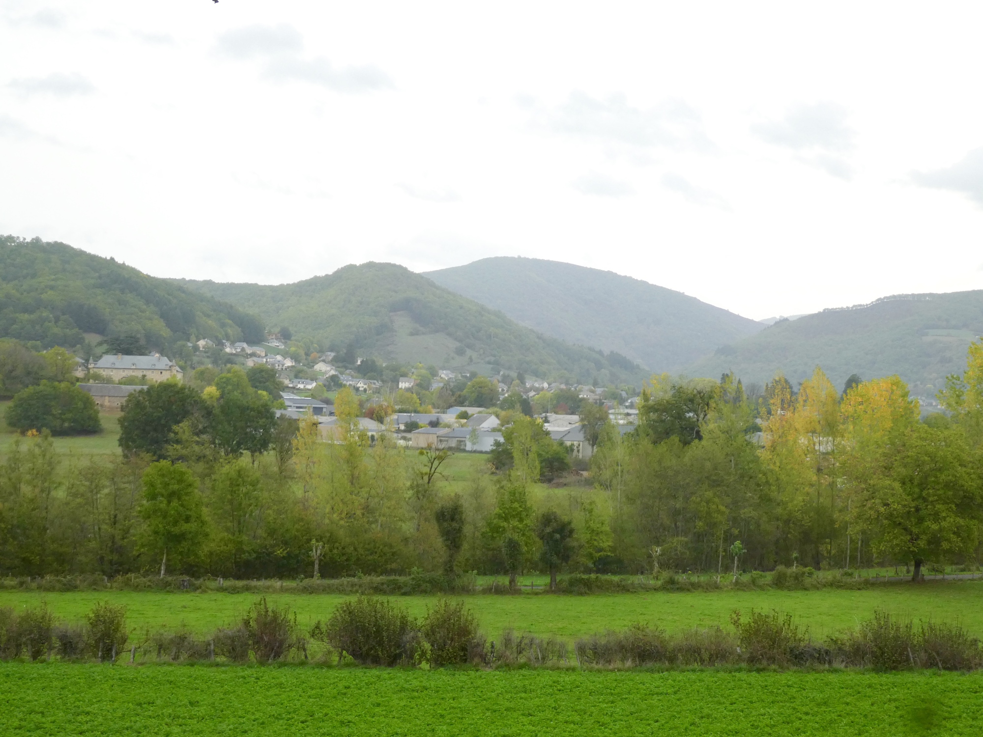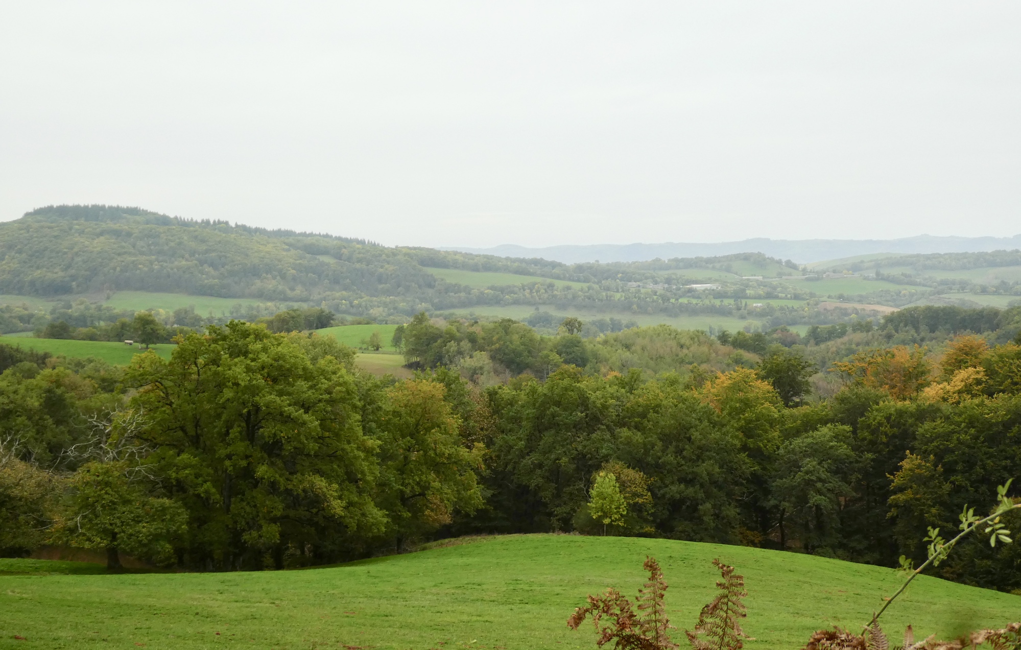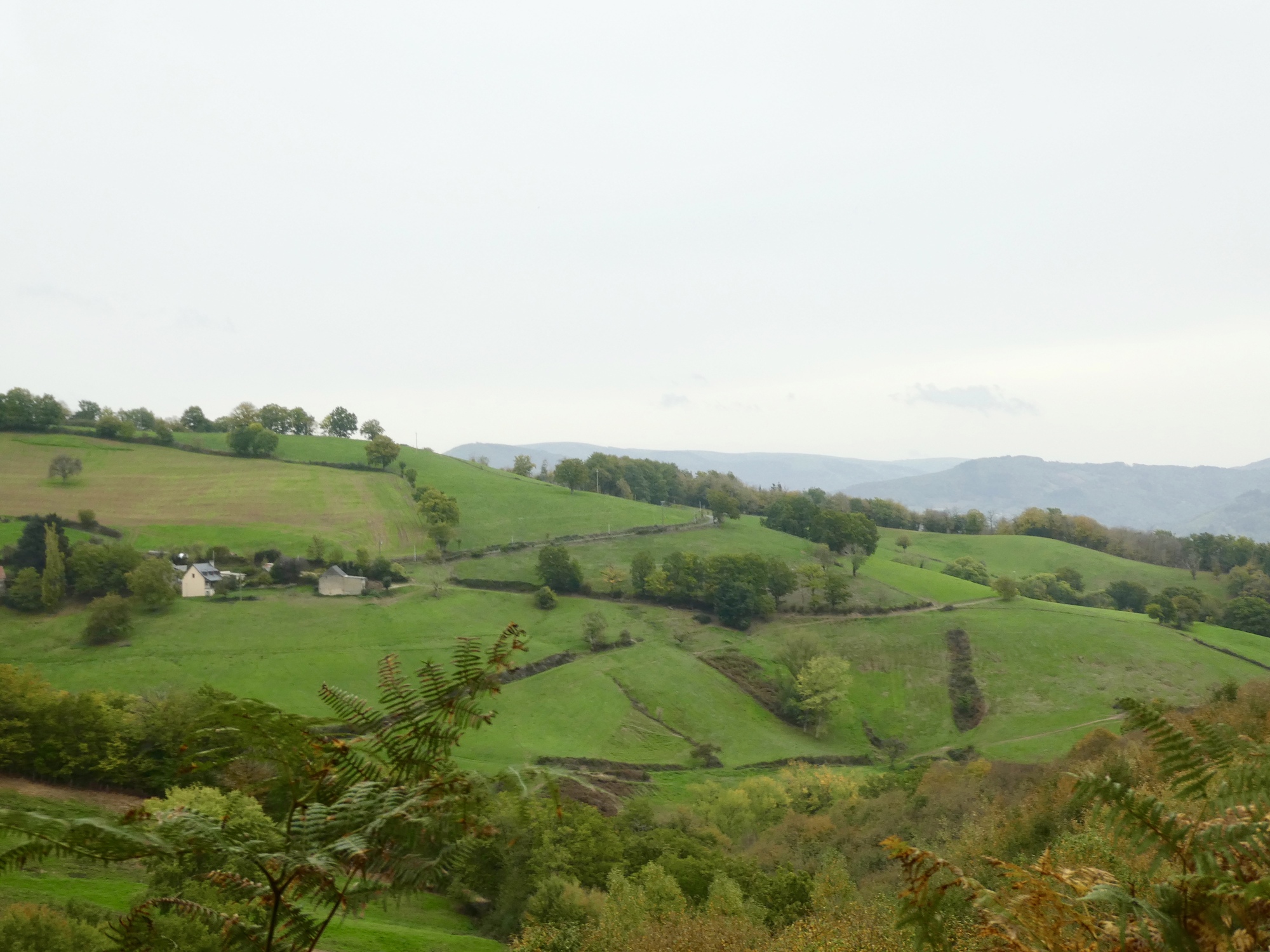 I set off from Saint-Geniez-d'Olt without giving the town it’s proper due, nor learning about the secret of the marmot. The sky was overcast and there was a bit of chill in the air, it really felt like fall. The route took me quickly up and away from the Lot River, on small tree-lined roads resplendent in their fall foliage – I was reminded of my days spent in the hill towns of Western Massachusetts. As I climbed higher, the trees opened to views of distant meadows, hillside pastures, and small hamlets. It was a tranquil morning, one that lent itself to contemplation on my life choices and good fortune.