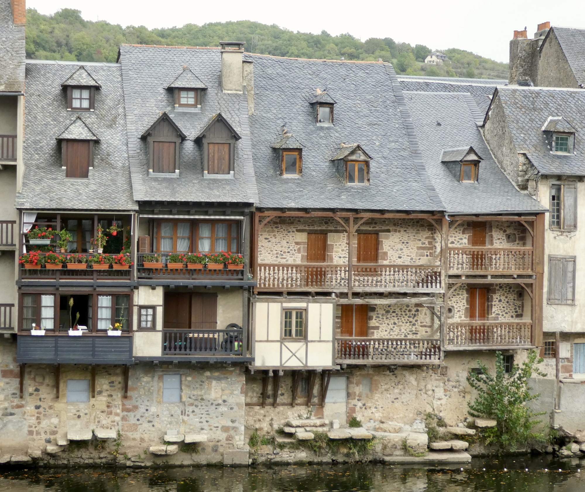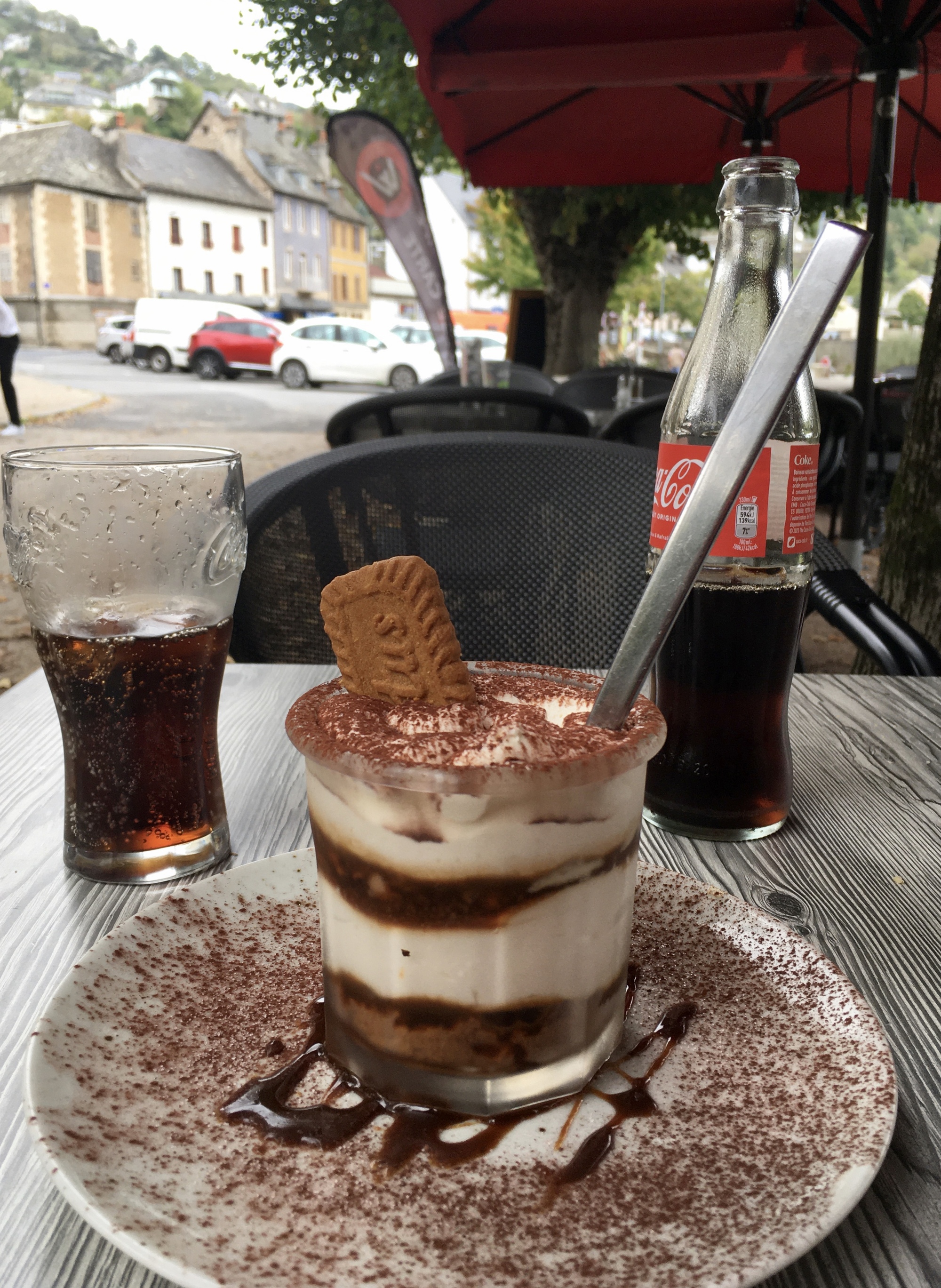 The last ten miles went quickly, following the river through a narrow region of the valley know as Gorges du Lot. I arrived in Entraygues about an hour before check-in time, and tried calling to see if I might be able to arrive early but there was no answer. It was a steep climb up to chambre d’hôte and not wanting to make the climb up unnecessarily, I opted to wait at a nearby restaurant where I mistakenly ordered their house version of tiramisu. Oops! I still hadn’t eaten my sandwich from this morning, but rather than do the sensible thing, I devoured the tiramisu. It was tasty.