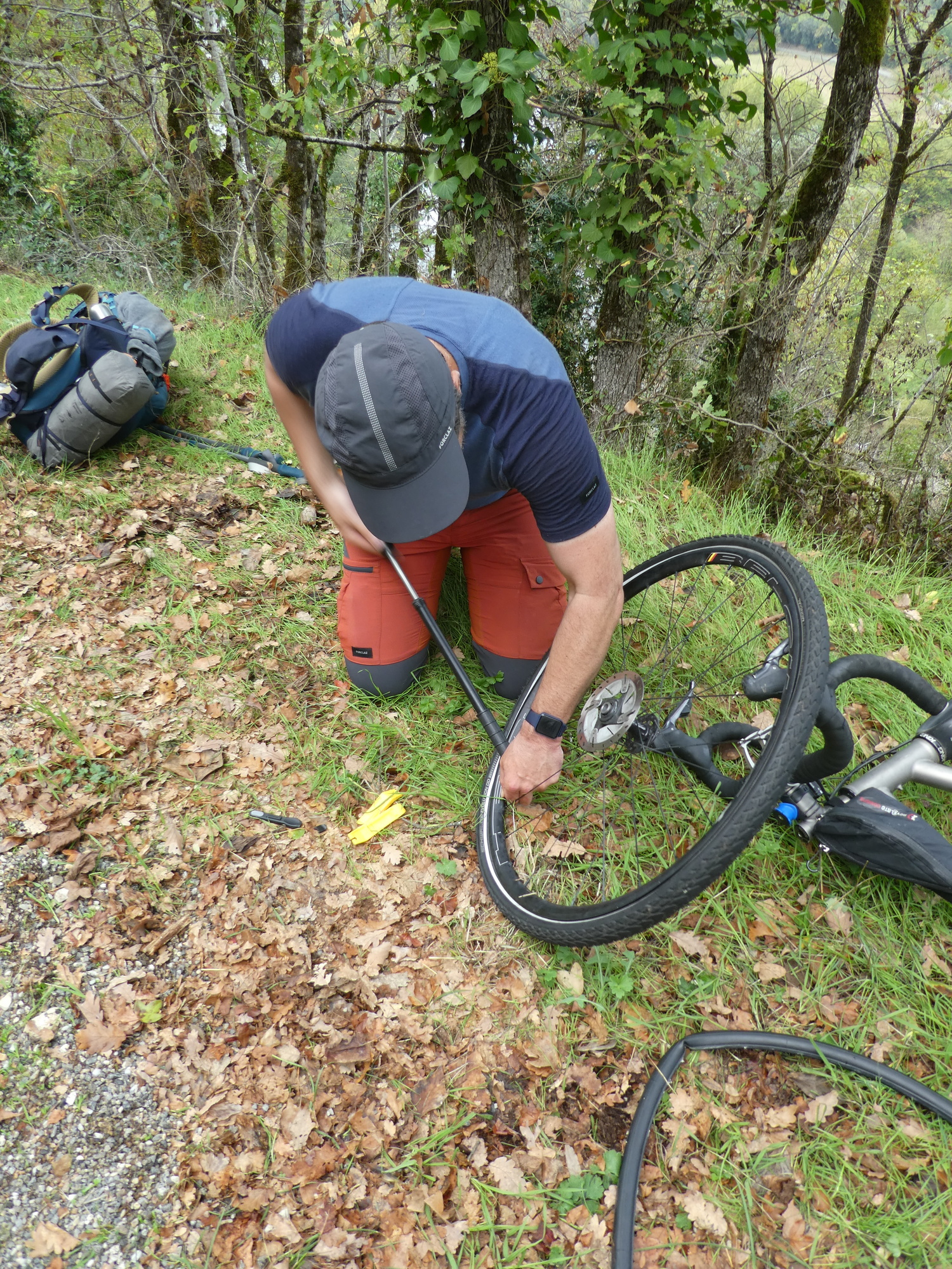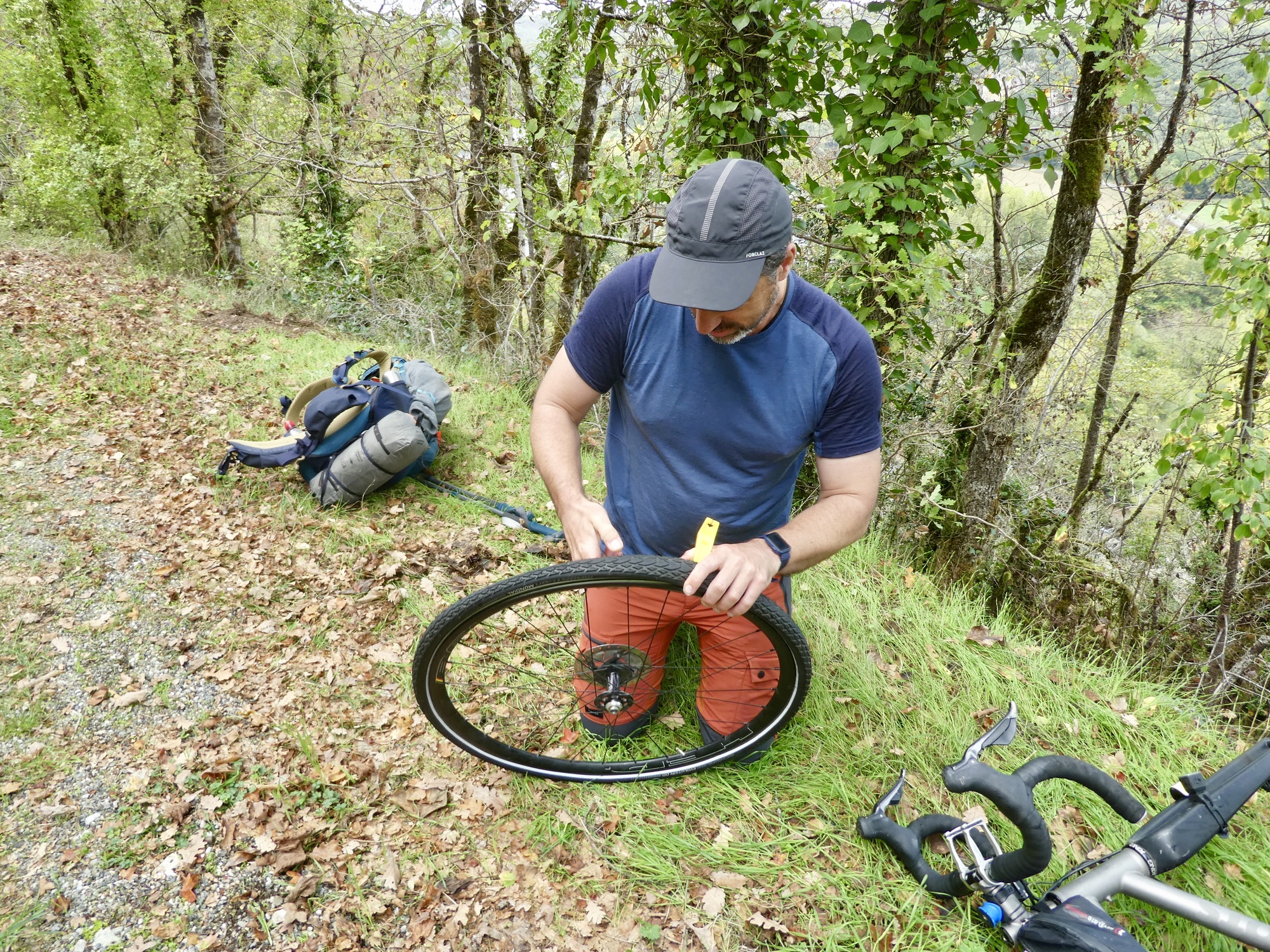 It was only a few minutes before I noticed the front tire was squishy. I happened to be near an intersection, so I pulled over to a grassy area where my fears of a flat tire were confirmed. It was Vivien George’s first flat tire, ever, and though I have fixed flats in the past, I have never done so with these tires/wheels. The tires I use are Schwalbe Marathon Mondial and though they are not tubeless tires, the wheels are tubeless ready – which means they have a rim that helps seal the tire when using a tubeless configuration. Unfortunately, the rim can cause difficulties when trying to remove and/or reseat the tire. Not possessing a great deal of thumb strength, I’ve always struggled reseating tires, even on my 1990 Trek 520. Therefore, my first inclination was to put air in the tire, hoping it was a very slow leak and I could limp along the remaining ten miles to Cahors. My test spin was promising, but after a few hundred yards with a loaded Vivien George, the tire had lost enough air as to be unsafe to ride.