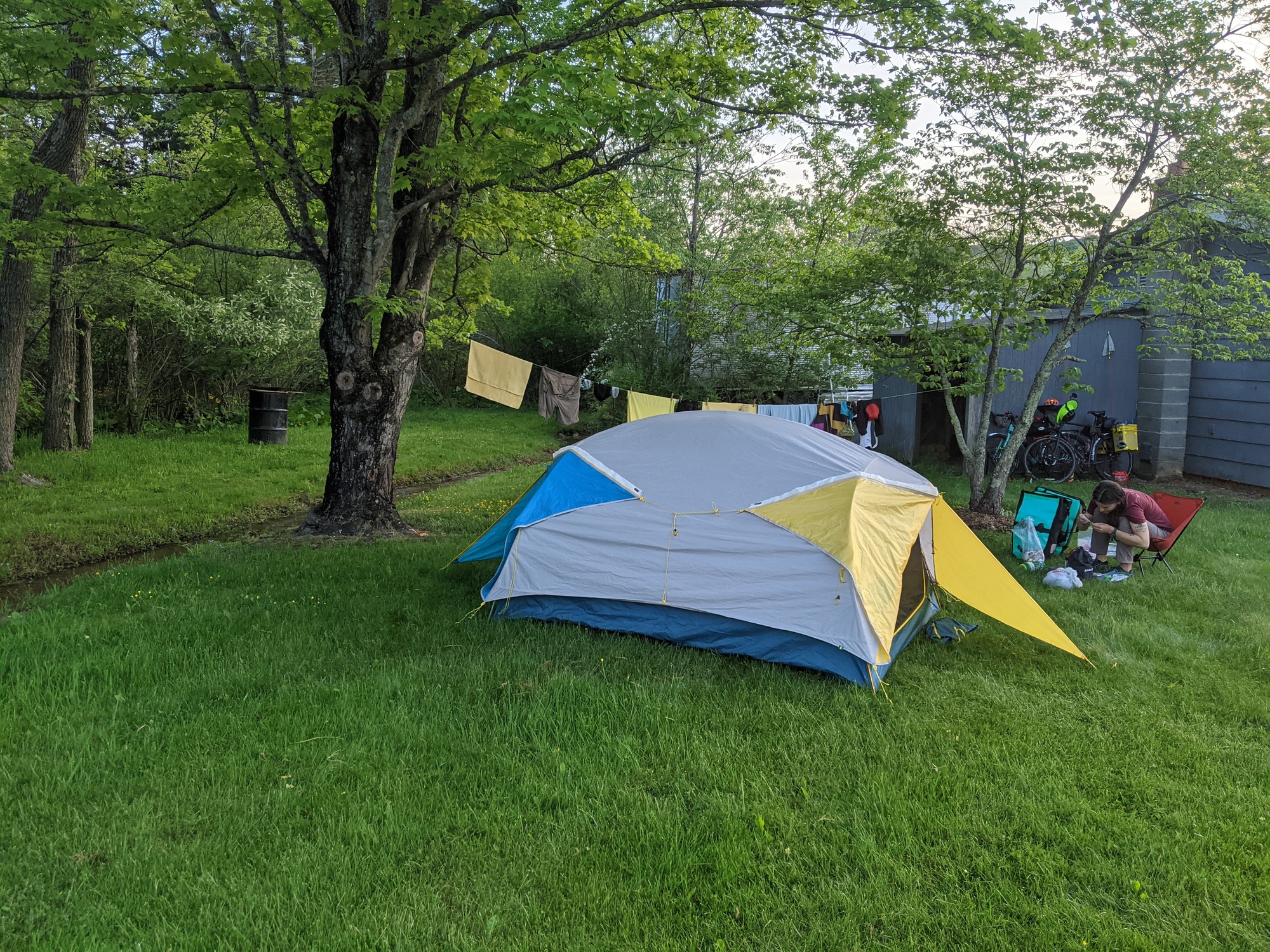 We kept stopping to hydrate and snack but our legs weren't keeping up and we were getting slower and slower. Chubs developed another annoying pedal tick. I wasn't sure how much more parkway I could take but finally, around 430, we pulled off the parkway onto 56. We stopped to don our jackets for the infamous descent. It did not disappoint. It seemed like we did 3 miles in 5 minutes. We got to the bottom around 5 and went to Gertie's store up the road to grab supplies. We hadn't picked a spot for the night, and it was getting late. We had heard the mallard duck campground down the road was closed so we were preparing to camp at any random church or ask someone at their house. When I went into Gertie's to ask about camp spots they offered their back yard! They also offered a shower at the nearby house! We instantly accepted since we were super beat and didn't want to continue into the unknown. We got some sweet potato fries and kombucha before the guy running the place showed us to the bathroom. We were so happy to shower after our toughest day yet and we get to camp over by a tiny creek. We ate the rest of our hummus and guac on bread, set up the tent and set to catching up on mobile. We shall sleep before sundown today, of this I am sure.