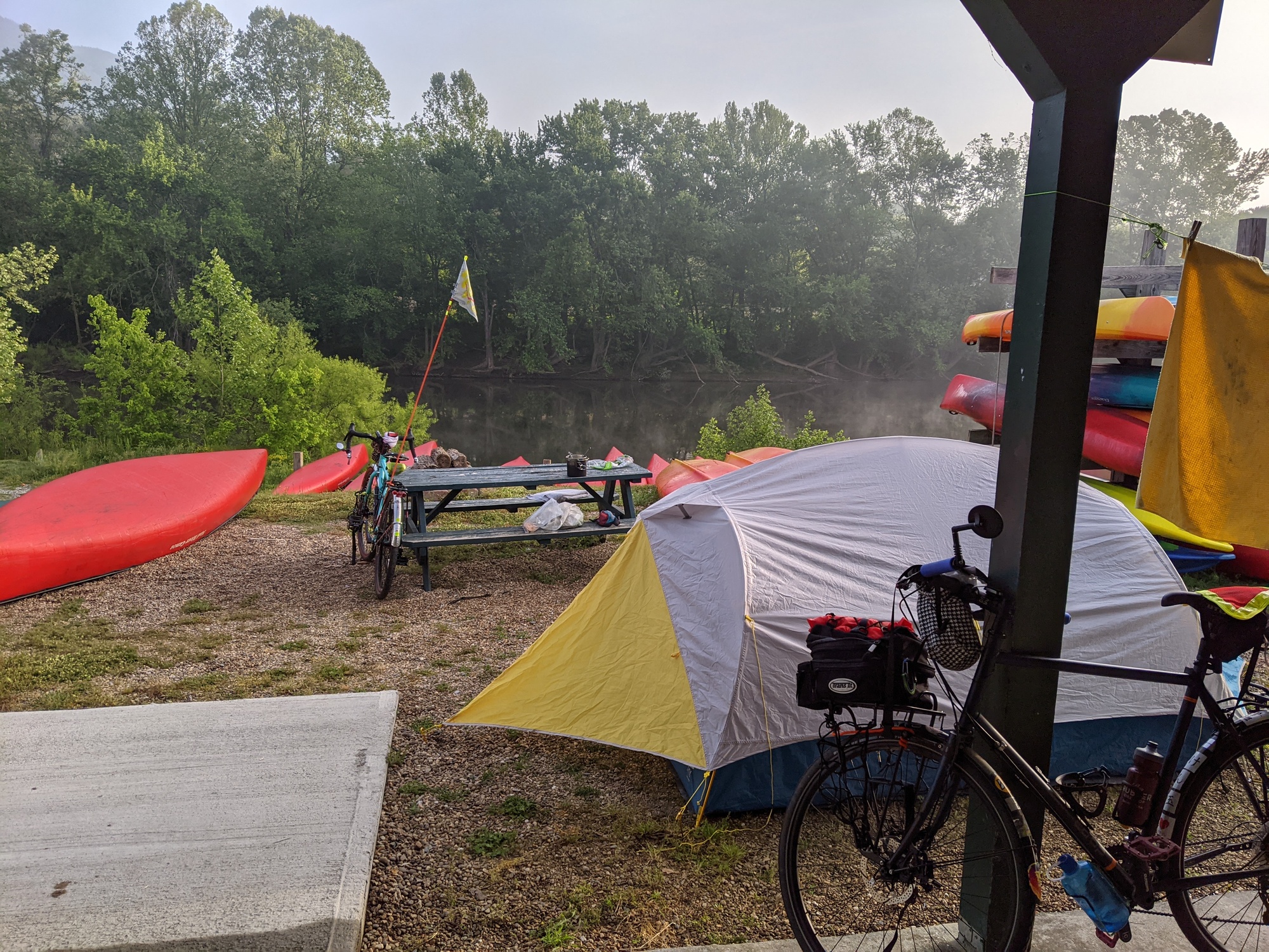 We decided to go to Buchanan in hopes we could stealth camp behind a church or something. When we arrived in Buchanan, Mary asked a policeman about sleeping in the park but he was a bit standoffish. I went into a river outfitters store to check for a fuel canister. They didn't have any, but I asked them if they knew of any campsites around. The guy behind the desk nodded and showed us to a place behind the building overlooking the river. It had a picnic table, bathroom, and covered area!