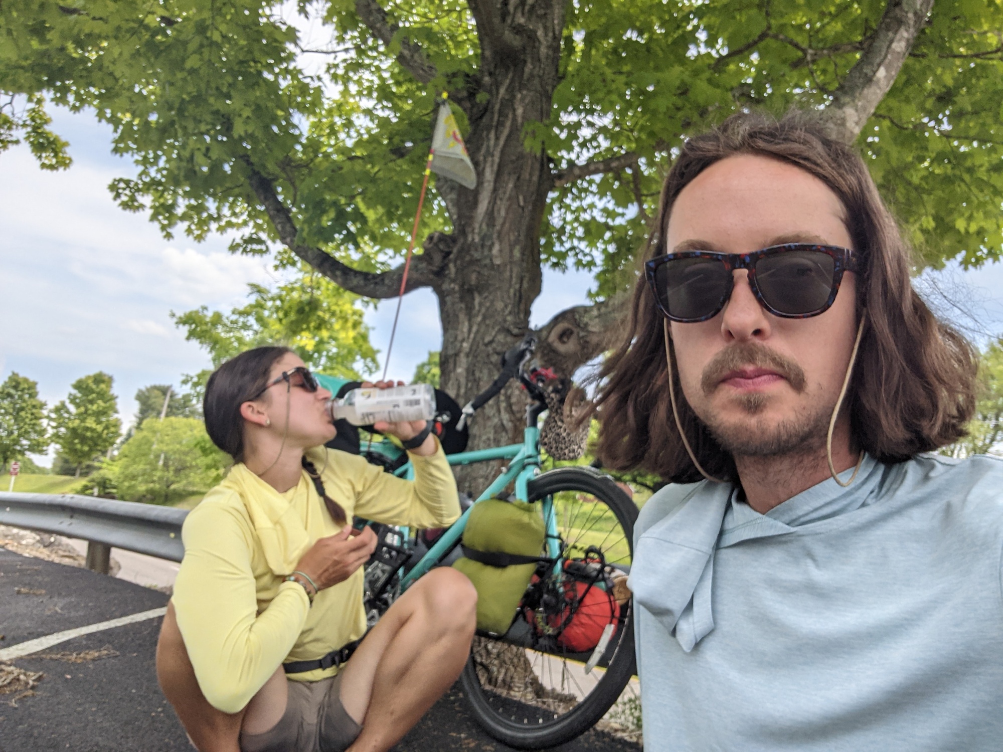 Today we woke up late but still left by 9 thanks to our warm shower hosts. They made us coffee and sent us along with a tub of oatmeal, which is the key to my heart. Today is Saturday so that means all the amateur lawn mowers are out. America is surely the land of picnic tables and lawnmowers. Also, as we go further west, truck and waist sizes increase. Not sure if they are related but somebody better look into that. We stopped for church lunch today and got covered in spider mites.