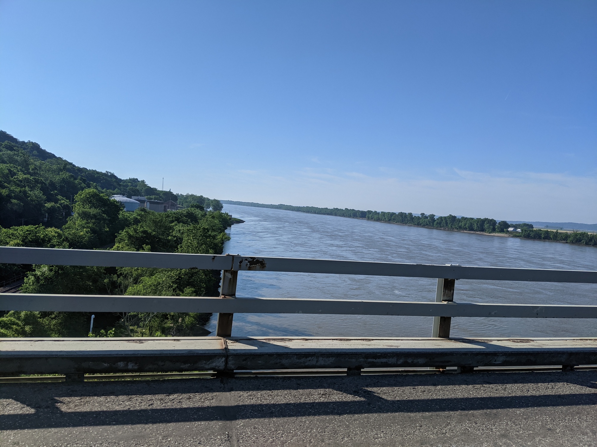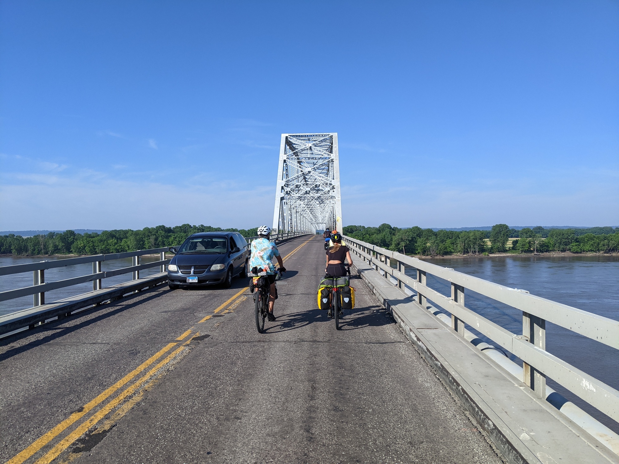 We were trying to leave from the eagles lodge early so we made overnight oats, but by the time everyone was ready it was already 8. We went across the two lane bridge that crosses the Mississippi as a group of 8 and got a picture at the Missouri sign.
