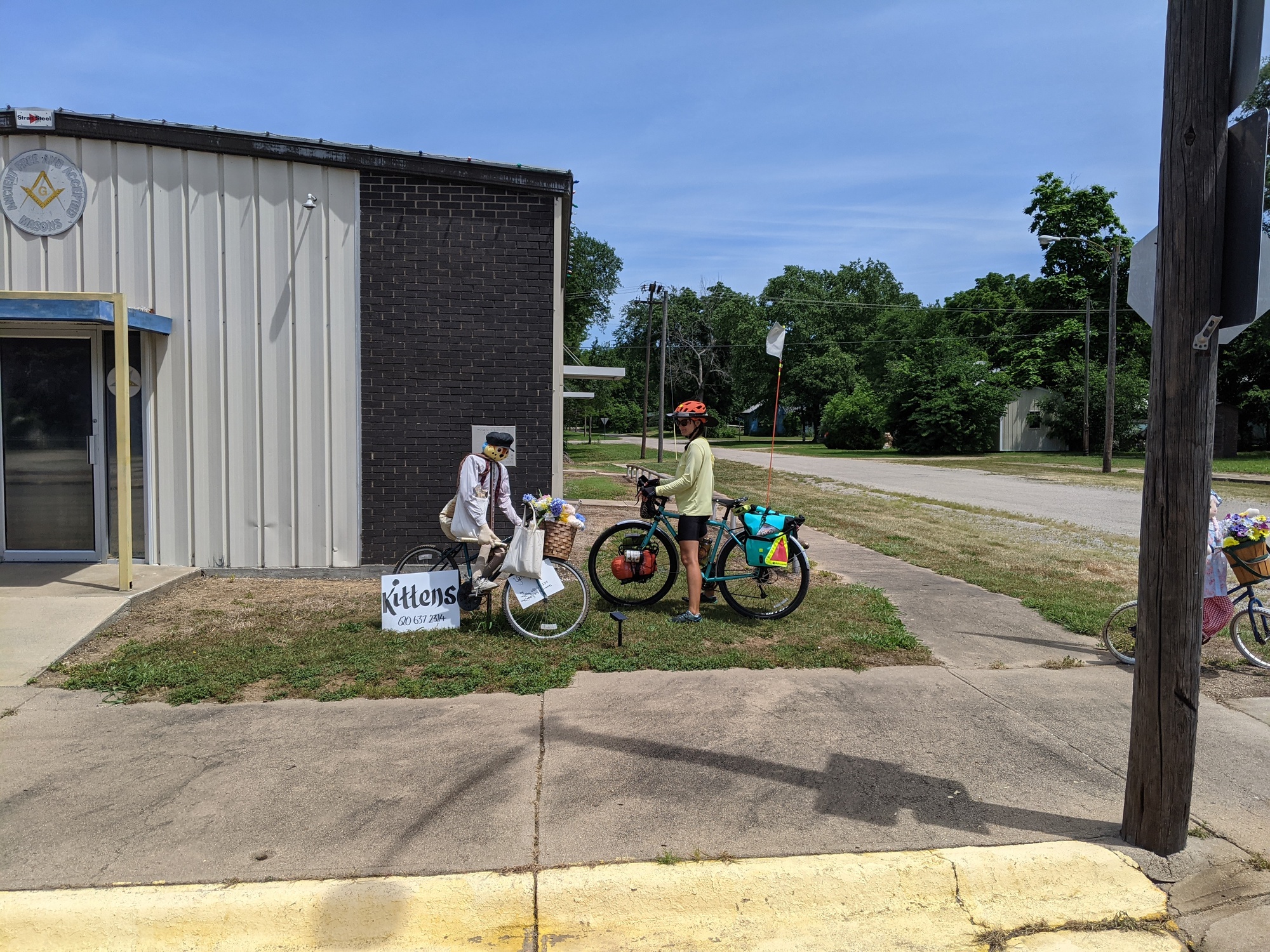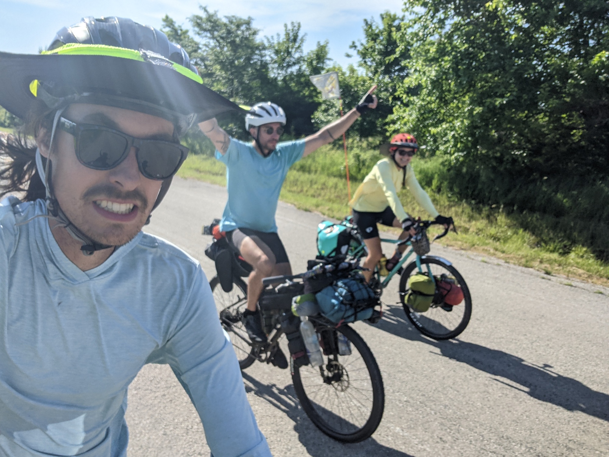 We woke up today and out our clean laundered clothes on. I ate like 3 bagels and today was day two of bagel breakfast, which doesn't stick around long. We said our goodbyes and took a photo. I think we left a little after 8 am to head towards Eureka. We could make a longer ride, but the next town past eureka is another 30 miles. It wasn't quite as hot or humid this morning and we had a great tail wind for the first few miles.
