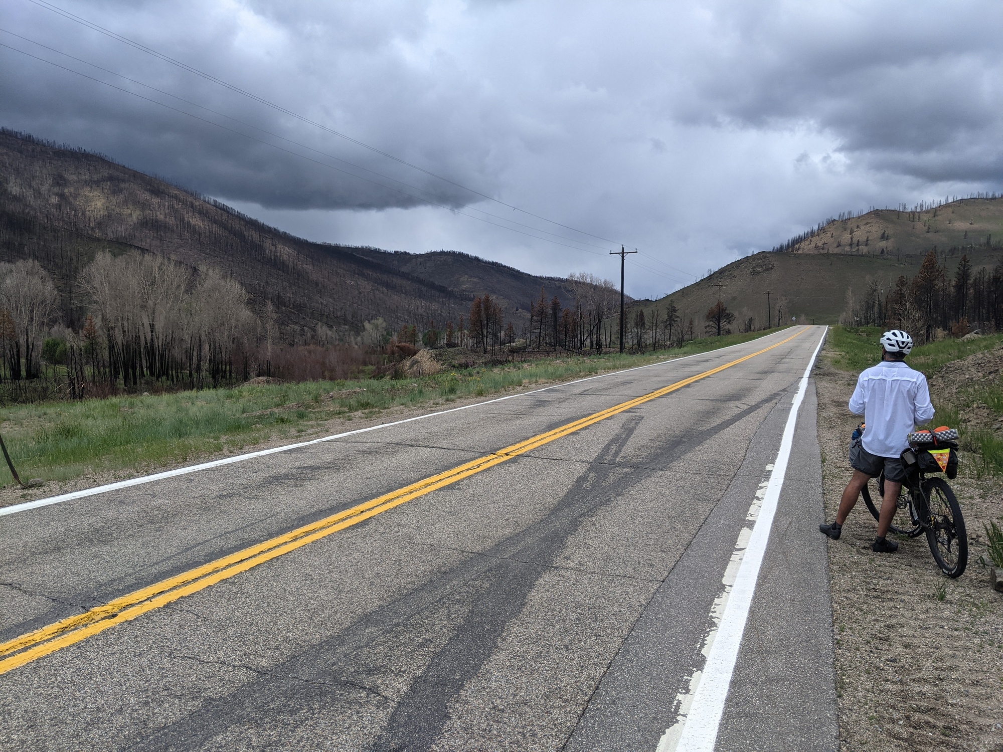 Somehow we finally made it and we started making tea and wraps. We should have known, bit it started raining really hard while we were just finishing up. Everything got wet while we packed up. I was shivering and shoving things into my boxes. It must have been around 40 degrees. We couldn't stay at the top, so we started down the pass in the rain. I was only wearing shorts and a rain jacket so I could barely hold the bars on the way down. After a few miles of this, it finally stopped raining and we made it to a town called rand. We stopped at a weird bar there to warm up and ordered some fries. It rained again while we were there and we decided to make a run for it after it stopped. We had about 20 miles left and it was about 3 pm. On the way to Walden, we were in the valley and the wind was the worst it had been. We watched a storm come over and it hailed on us. The wind made it pretty painful. I was close to giving up at this point. We were 5 miles away and I could see the city.
