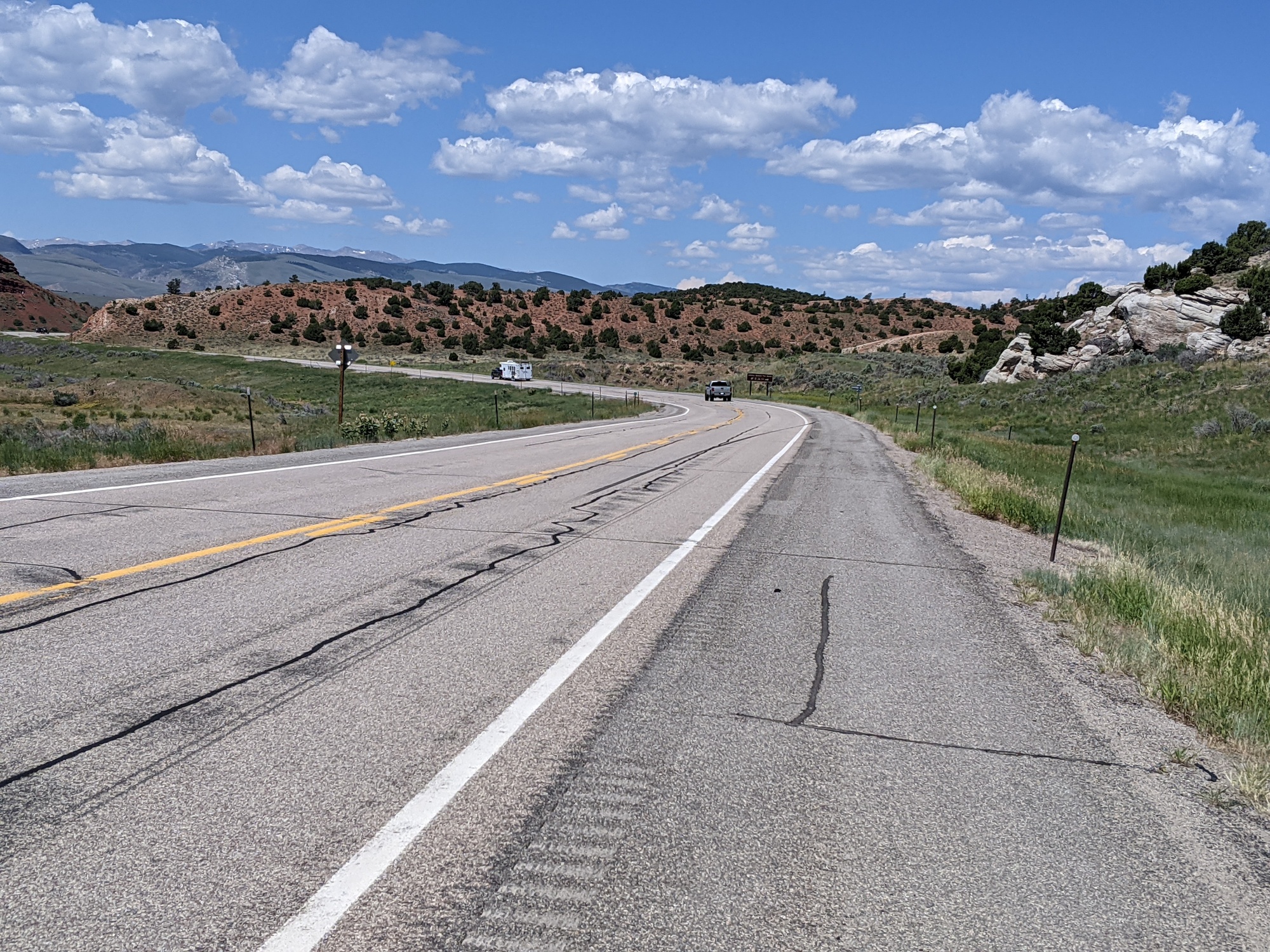 We hit the road around 8 hoping that we would make it to lander in time to go to some bike shops. The ride was supposed to be mostly downhill. The wind was extremely variable during the day. At the beginning we had tailwinds, but the rest of the day was Gusty from different directions. We are approaching the wind river range, which I think is named appropriately. We went flat to uphill for the first 30 miles before going down into the valley towards lander.