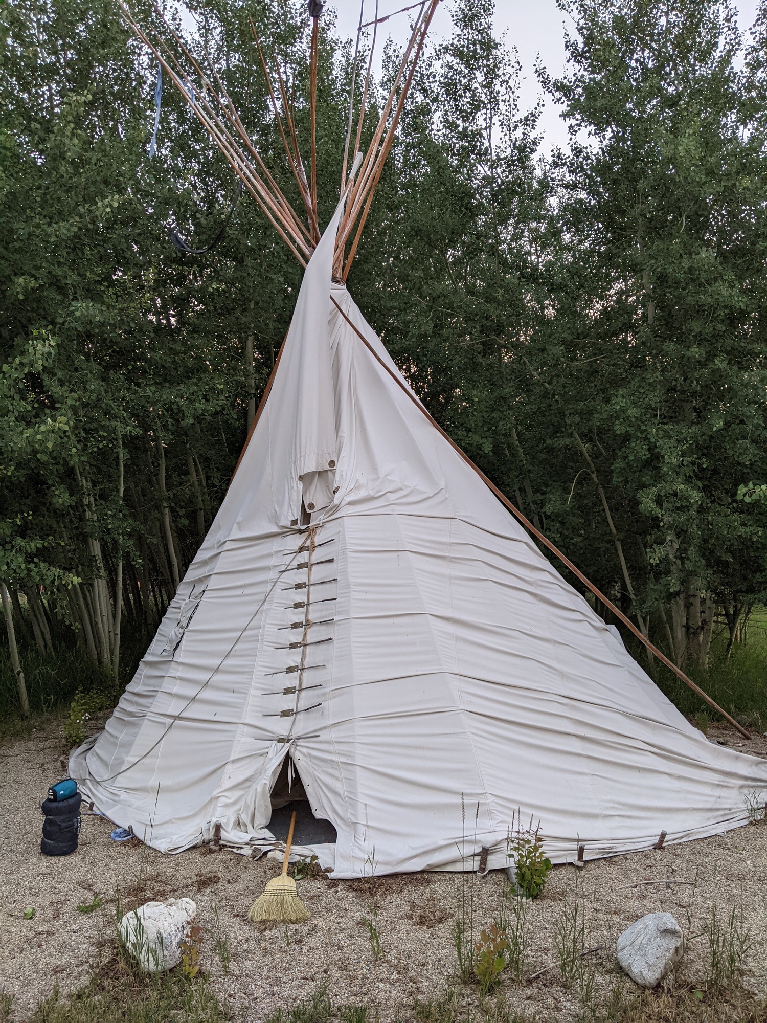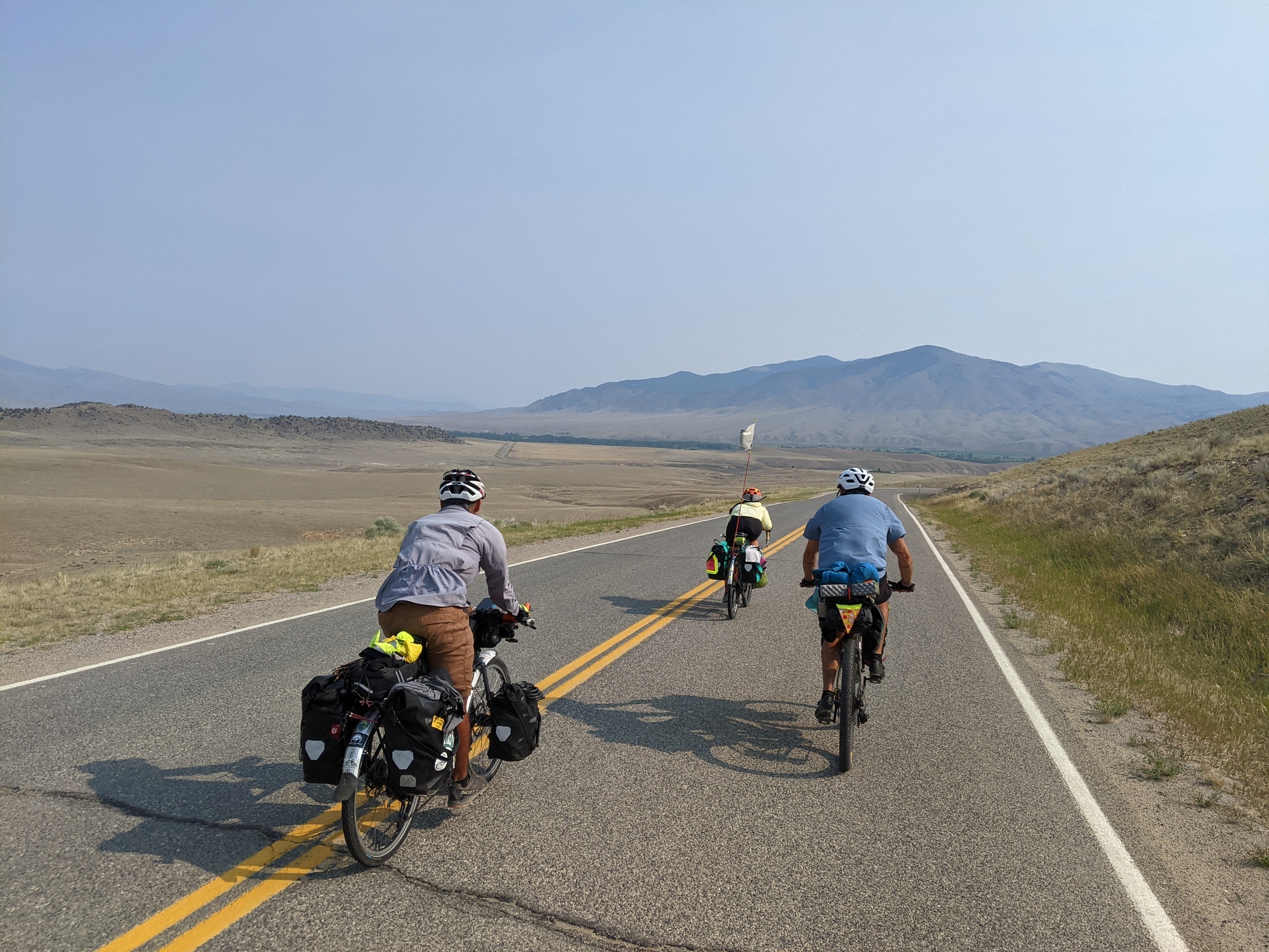 The mornings tailwind had changed to a headwind and we crossed the interstate one last time to get to a road which would take us to hwy 1. In all the mess of turns, we did find a bike trail for 1 mile. Before getting on 1, we were pretty burned out from the sun and the dry weather. We turned onto 1 to go west toward anaconda and the headwind was intense. We later found out from locals that the wind is funneled through that valley and almost always blows hard toward the east. We had5 miles to go and came upon a burned area. All the sudden, a bang rang out. The others thought we were finally shot at, bit my rear tire was flat. It unseated at the bead and blew a hole in the tube. I replaced the tube and we carried on into town. I was worried about another blow out, because I thought it was well seated when I rotated the tires yesterday. Luckily, the bike shop in town was still open and I bought a new tube. We went right to dairy queen for vegan dilly bars. Everyone almost fell asleep. We were looking online for a restaurant to eat at, bit there wasn't anything for me and Mary other than french fries, so we went to the grocery store while mark and Alex are at a restaurant. Our warm showers host for the night was 3 miles out of town, and we hoped he would let us use the microwave, because all we could find was frozen vegan foods. We showed up at our hosts home and he showed us in. It was a small space with no door on the bathroom, so the showers were a bit awkward. We heated up food and ate outside while mark and Alex talked to the host for a while. Our host, blaze, showed us out back to the teepee we could sleep in, which was awesome. We were about ready to pass out when blaze was having an ordeal. He said he was having bad cramps and was moaning and groaning around for about 20 minutes before his girlfriend showed up and put him in the back of her car and drove off. We were all alone and can only assume he went to the hospital. We prepped for bed and got into the teepee. Mary and I slept on the floor while Alex and Mark slept on a couch and a bed respectively. The teepee was dry and comfortable with minimal insects. It was also quite huge and pretty cool. I fell right asleep.