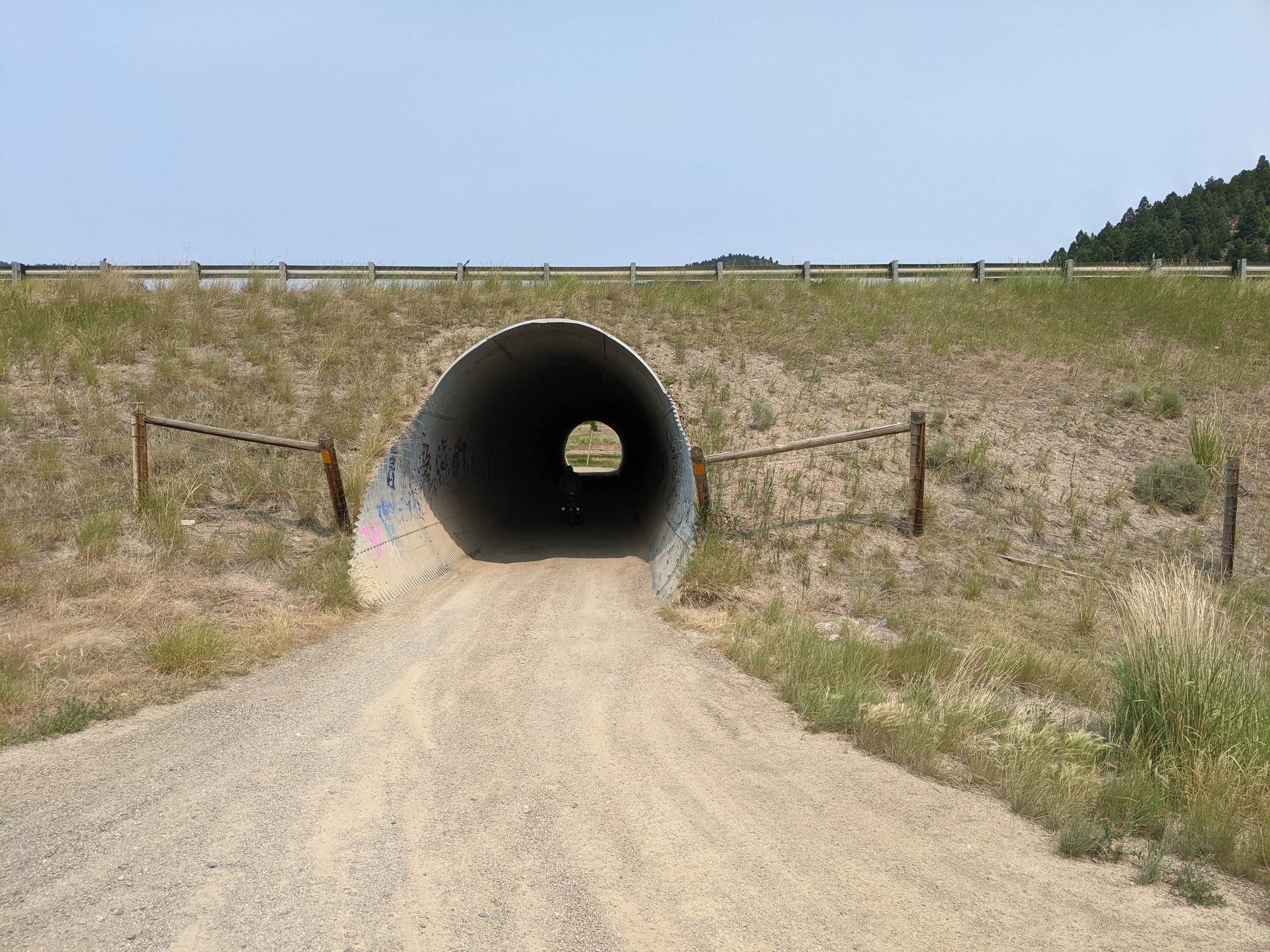 Our group decided to go to anaconda, 80 miles, where we found a warm showers host, then go 80 miles the next day over to Hamilton to rejoin the transam. The dew boys, Tim, David, and Conor decided to nuke this section, so Tim called his family in southern Idaho and they are going to get picked up from Dillon and taken down there where they will meet up with the transam somewhere in Oregon. I don't know what Nina and Jeremy were going to do, since their other friend, shalom, went the regular route this morning. We said our goodbyes, since we are usually pretty close with the other group, and headed on north into a slight tailwind. We rode the frontage road near interstate 15 for a while. We were out of water and stopped at a fly fishing spot on divide to fill up. The fishing guide recommended a different route through the mountains, but we ignored him. We didn't want to add any more miles since it was so dry and hot. The southern wind was bringing alot of smoke today, so it was definitely effecting my sinuses. We rode a little longer on the frontage road before getting on the interstate for 4 miles. We got off and took the next frontage road which turned into gravel and went through a giant water tunnel under the interstate.