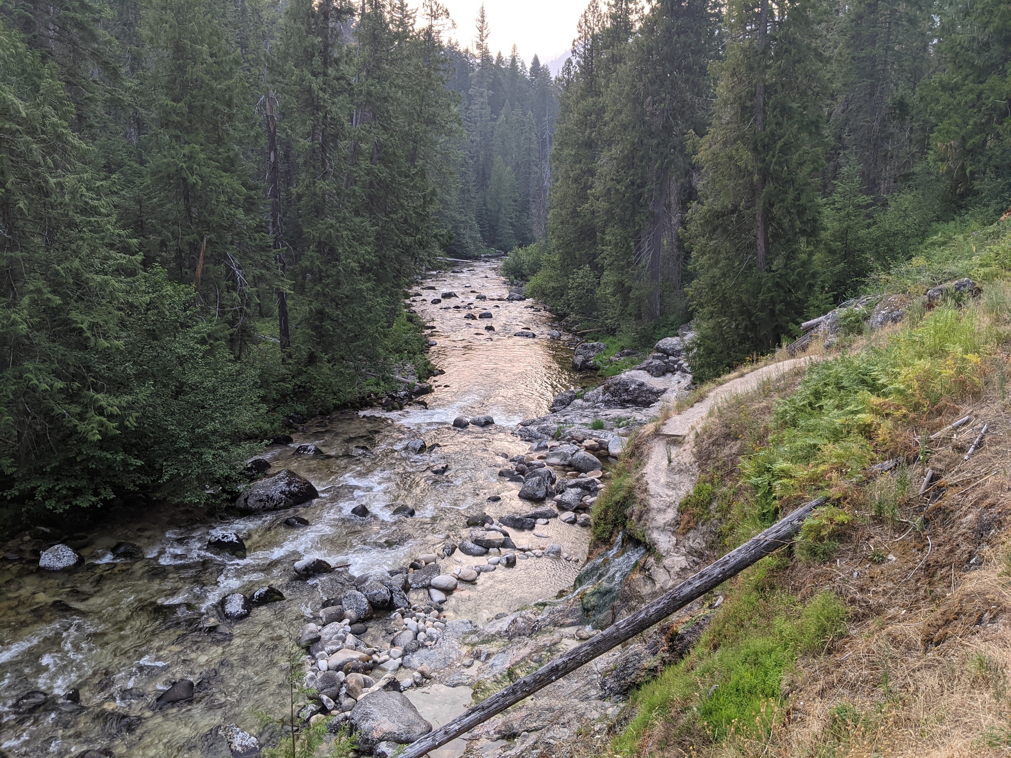 We made great time down the mountain and found a campground/restaurant/lodge where we ate our own food and used their wifi. I texted Chris that we made it over the pass and we took a short break. We had run into a recumbent cyclists going west on the Lewis and Clark trail. He got a flat at the lodge that took him a while to fix. He had a weird cover over his whole bike for aerodynamic reasons and he didn't wear a shirt while riding so it looked like he might be naked under there. We never did find out. We left the lodge on route to Jerry Johnson hot springs, which our warm showers host from a few days ago has told us about. We arrived across the river where there was a large suspension bridge to cross to get to the springs. We decided to continue down 12 to scope out the Jerry Johnson campground to make sure we could camp before we spent the rest of the afternoon at the springs. The campground was closed, but we just bypassed the fence. It was great, it looked like the camp had been closed for 2 years, but the bathrooms were open, stocked with toilet paper and the poo was completely pumped out. We were stoked, so we rode the mile back to the springs. We didn't want to leave the bikes out on the road, so we decided to walked across the bridge. When we got across, we decided just to try and ride the dirt path to the springs since it was a mile. It started super smooth but we went through several wet spots and had to get off the bikes a bunch of times. Alex and Anton both took a fall and I was starting to regret taking the bike in. Anton helped me lift the bike over another log and we finally made it. The springs were low key, especially compared to Saratoga.