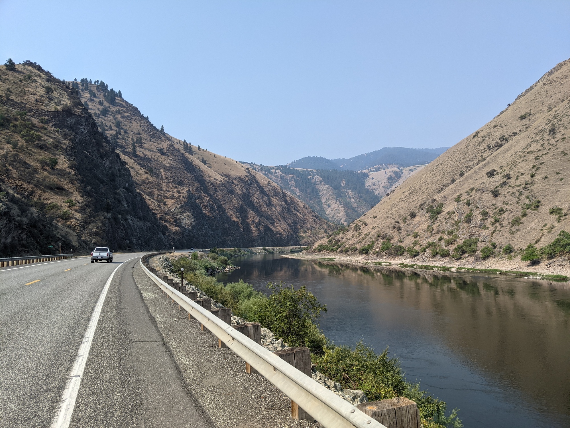 We woke up at the usual time this morning and had a semi slow start. The RV couple stopped by to talk to us. They saw us from the road while they were driving the jeep to the next spot. We also had the owner of the RV park come by and talk for a while about his proposed building in McCall. I don't know why people want to talk to us about their building projects, but it's not the first time people have chatted to us about their buildings. We got a later start than usual, which is unfortunate because the forecast was for 102* today. The ride was ok all the way until 11 when we were getting close to riggins and it got pretty hot.
