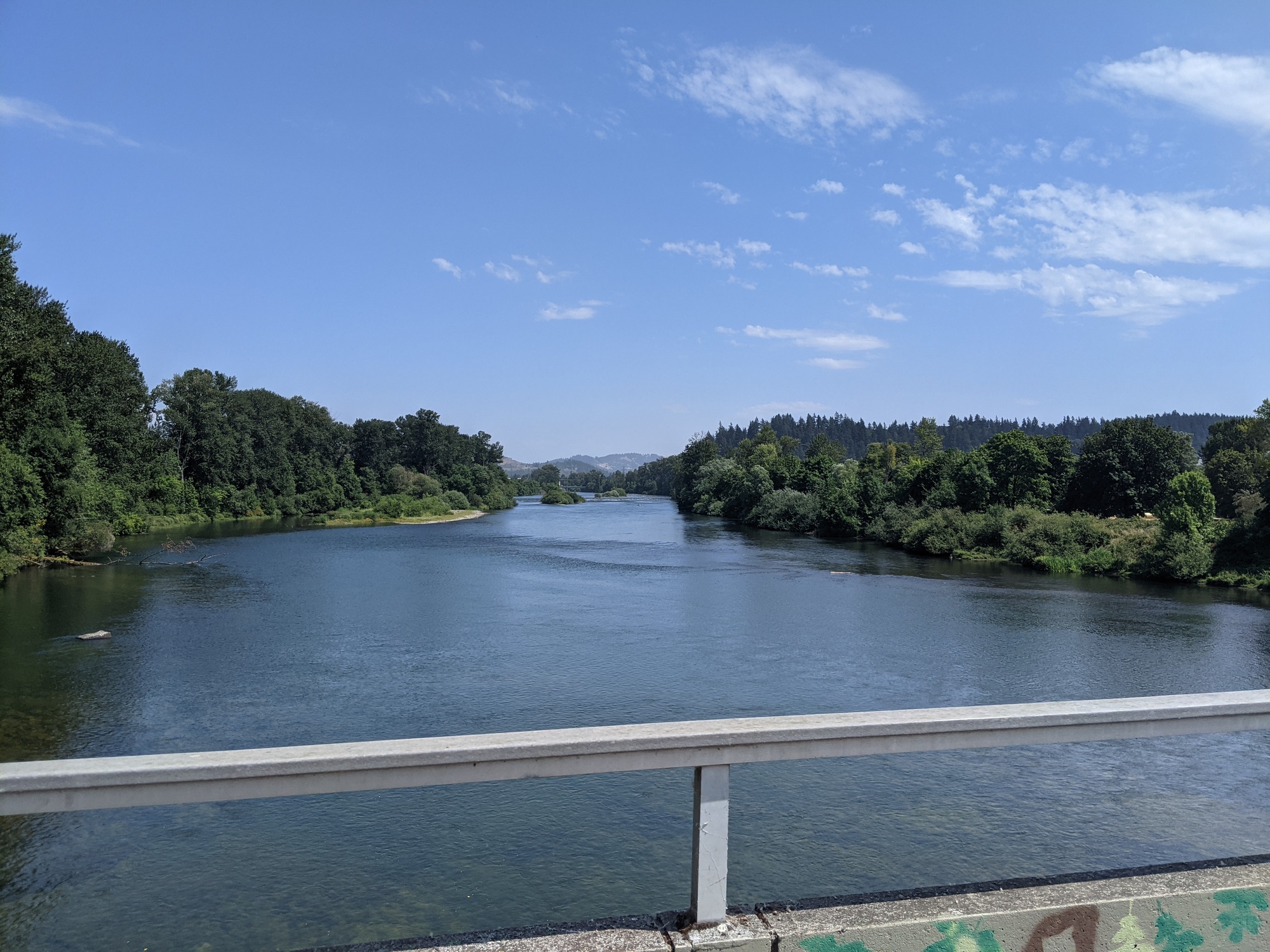 It had been about a month and a half since we have been in a real forest. The humidity fogged up my glasses and you could smell pine and fermentation. It was an amazing experience after being in a desert like place for so long. On top of the sensory overload, the road was one of the best downhills so far. Very narrow, winding with alot of 15 mph u turns and sharp bends. Around one curve, mark was in the oncoming lane and a car coming up was also out of their lane. It was almost a really bad crash, but luckily nothing happened. It was about 15 miles to the bottom where the road ended and we had to get on hwy 126. After a few miles, we entered the burn area from last year. We were following the McKenzie river to Eugene and most of the ride was through burned forests.