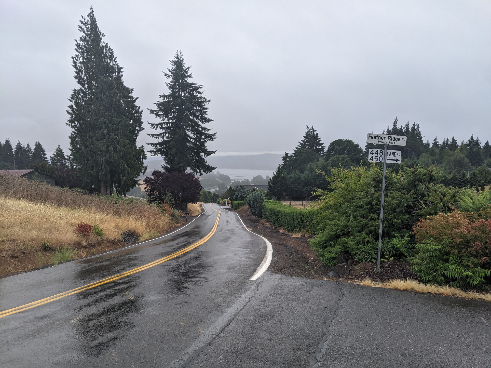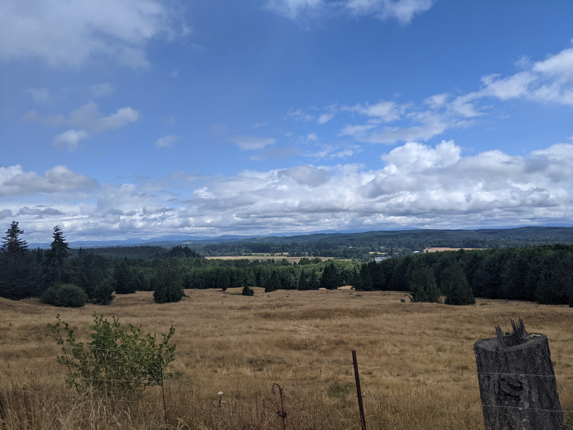We descended the other side in the rain, which luckily wasn't as steep, and arrived in a small town where we bought some roadside cherries. In a town called castle rock, there was a sign at the town limit displaying all 12 churches in town. There were only 2200 citizens. We took a bike path around town and everyone we passed was extremely friendly. They also had a mountain bike park and a skate park. I wonder why all the major religions lay claim to this small town in Washington. Maybe there is a shared historical significance, but so far no bombings or war, they seem to be ok with each other. Take some notes middle east, well I guess castle rock doesn't have oil so that's probably it. We rode out of town and up another hill which had a great view. On a clear day you can probably see big mountains.