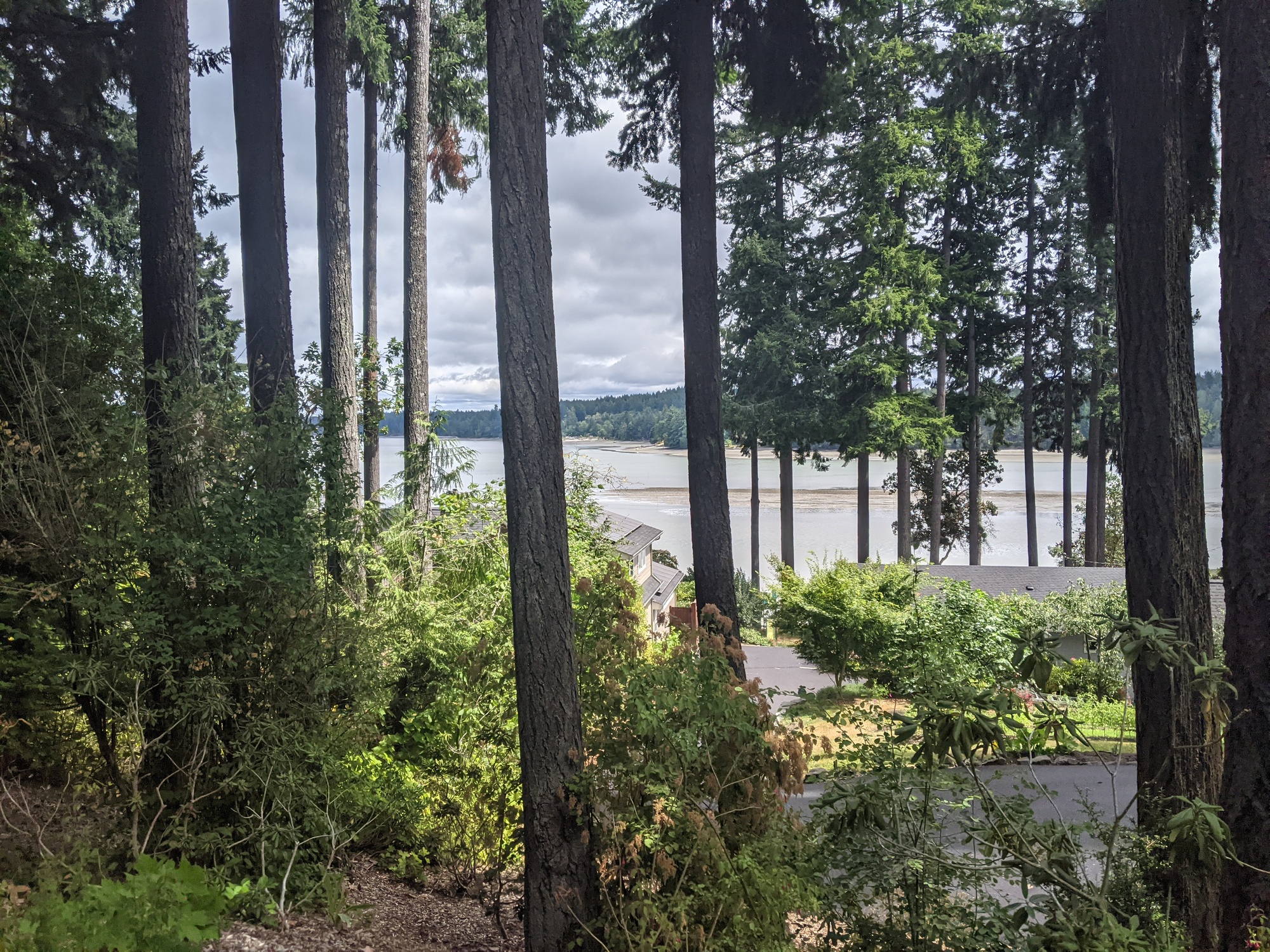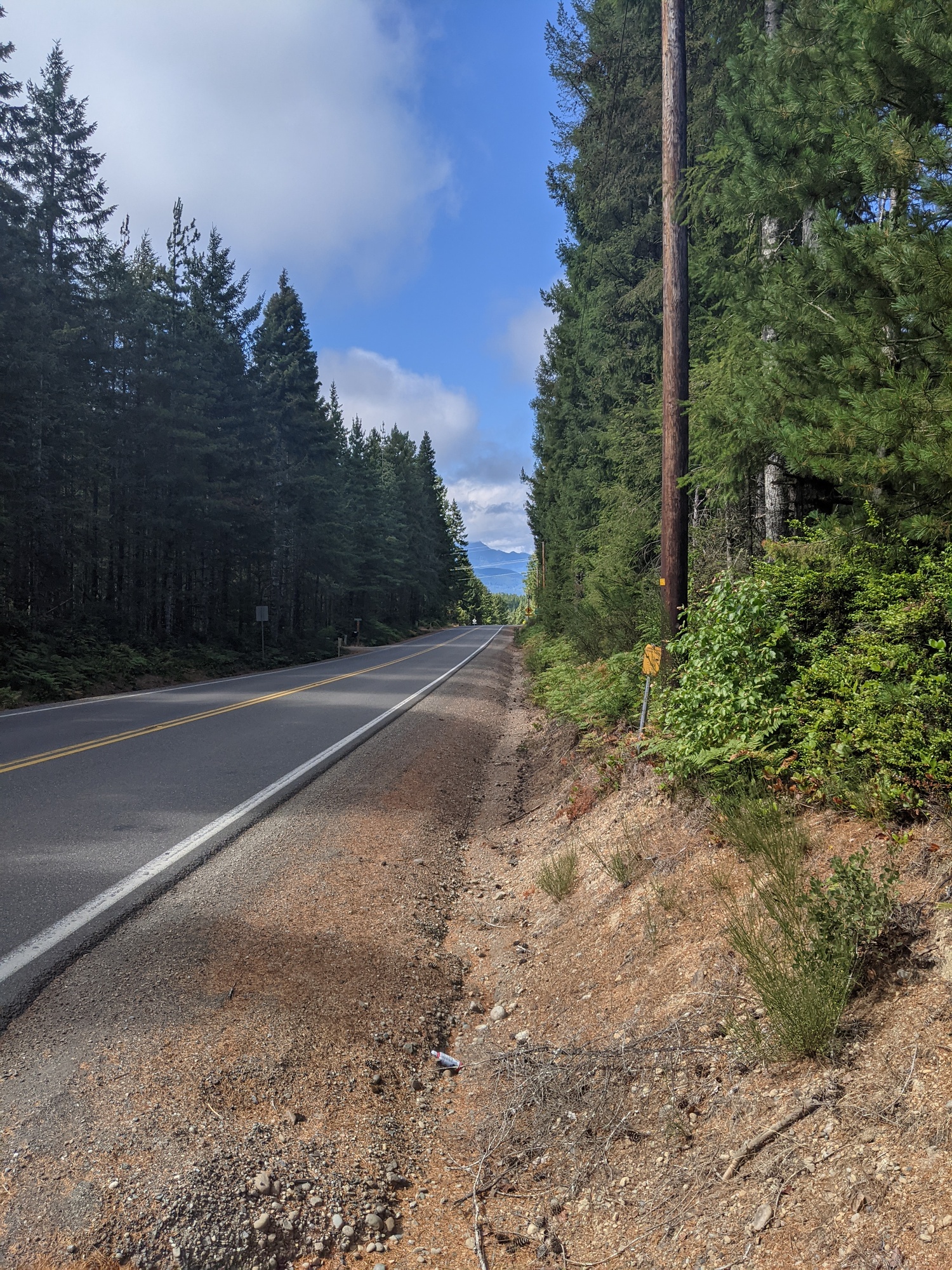 Today we got up around 620 and prepared for the day. No one was up, but Brian made auto coffee for 6 am, so we had some with oatmeal. We were just about ready to leave and Brian was up to see us off. Getting our bikes out of the garage we saw a beat to heck old mountain bike and I assumed that must have been the bike he toured with in the 80s. He confirmed my suspicion. It was about as simple as it gets: 26" rims, friction shifting, and a steel frame. He let us out of the garage and into the misty rain. It was forecasted to rain until 2 pm again, which was annoying. On the road from Chehalis towards Olympia, it was just about as redneck as you can get. A guy in a pickup with a don't tread on me sticker slowed down beside us while a car was passing to yell "get off the road!", lots of expletives involved as well. It's not the first time people have given us negative feedback in the rain. You would think that the rain would be punishment enough. I had just enough time to tell him off, but I think in the future, I'll just say "shut up damn liberal!". I think that would offend them the most. Or tell them that their family hates them. Deep beneath that macho pseudo cowboy vibe, that's something they already know. We continued on in the rain, having a real PNW experience and made it to Olympia as it started to clear up. We stopped at a trader Joe's to get lunch stuff and while eating outside, a lady gave us a coupon for a free cookie at Barnes and noble. I guess we look pretty hobo? Most people don't eat the food they just bought out front of the store. This was the third gift from Washington citizens: the first being a road map, the second being a sticker, and now this cookie voucher. The lunch was good though and we continued on towards the bottom of hood canal where it curves east.