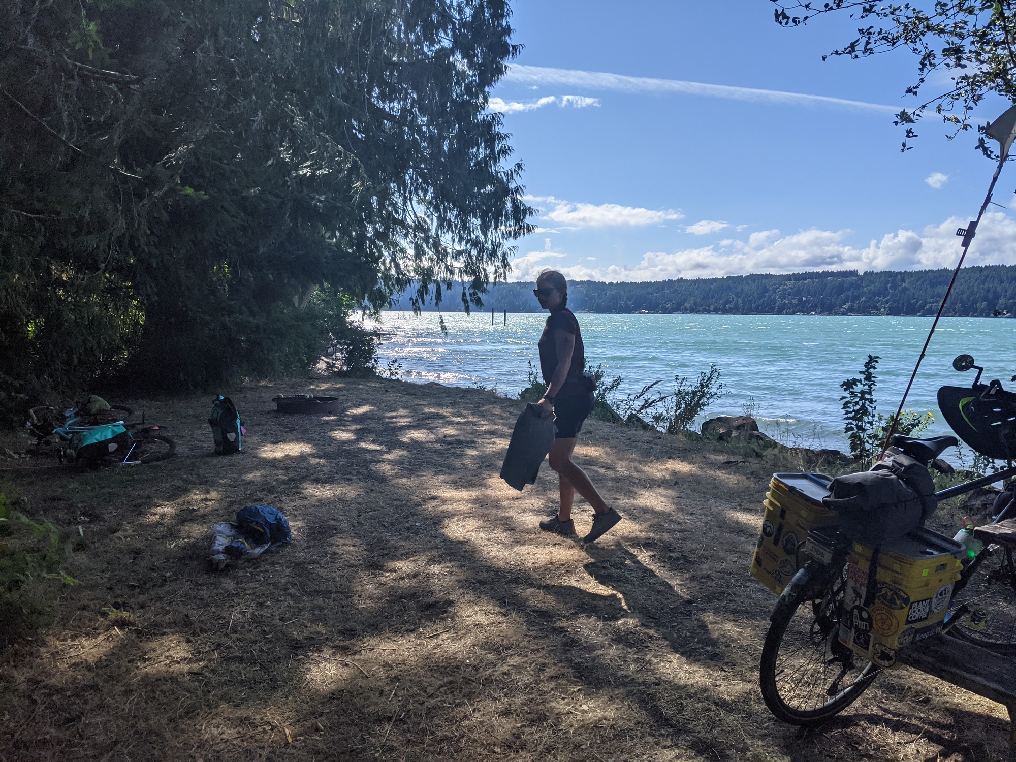 We were riding this busy vacation road and two guys in overalls told us to watch out for speedy cars. They didn't have shirts on, had fancy drinks in a mason jar with a handle and straws, and one of them looked just like Seth Rogan. We thanked them for the tip and continued on. The wind was really raging westbound , so we made it to the park in no time. The park was full, but Washington (like Oregon) have a no turn away policy for hiker)bikers. They reserve a couple sites just in case people show up. I was worried we would get a crappy spot or be near another late night party, but we were all alone across the street next to the boat ramp. The site was secluded and right beside the canal. It was really windy, but so awesome. Its definitely up there with best sites along with smith rock, McKenzie pass, and Togwotee pass.