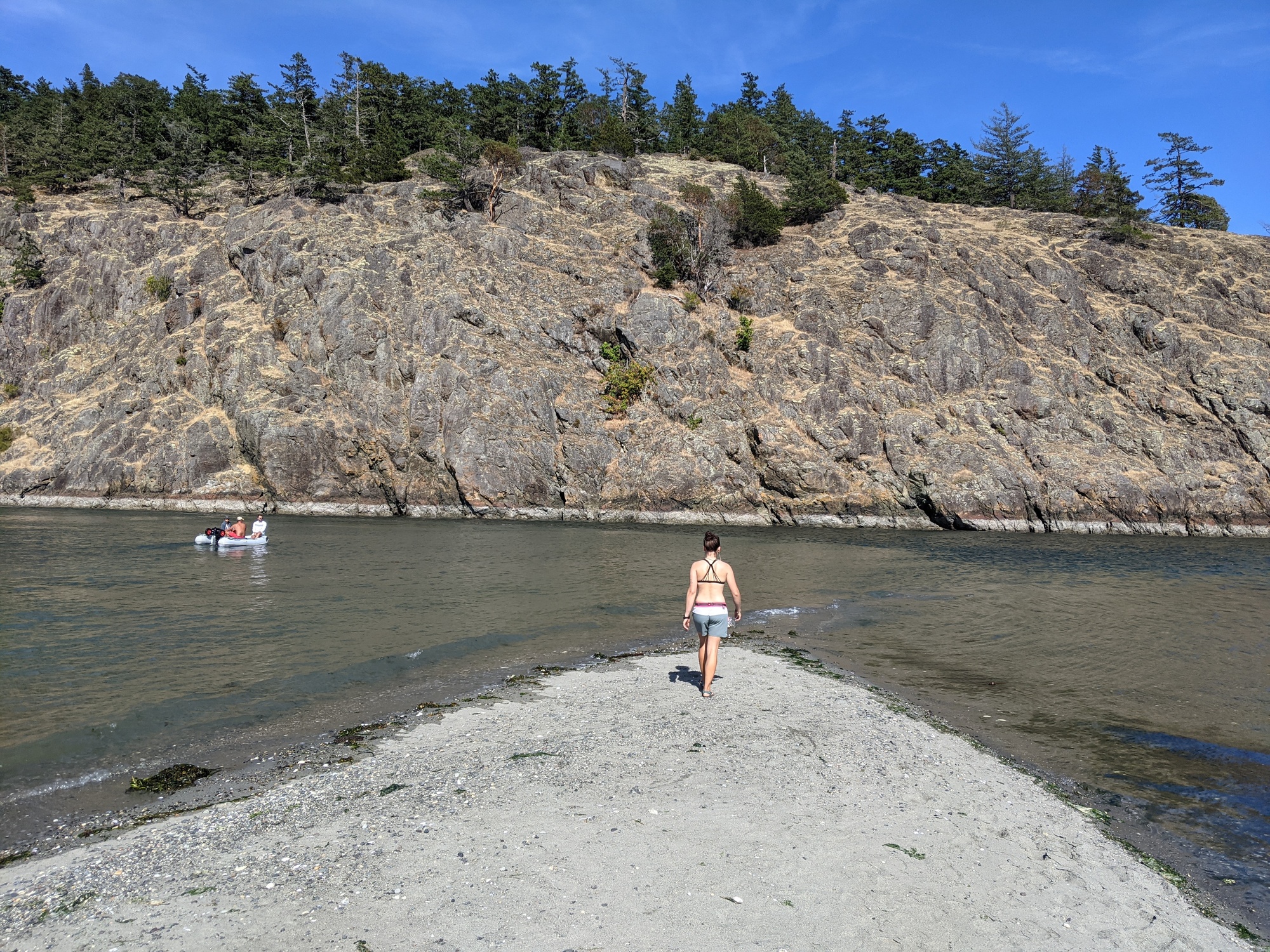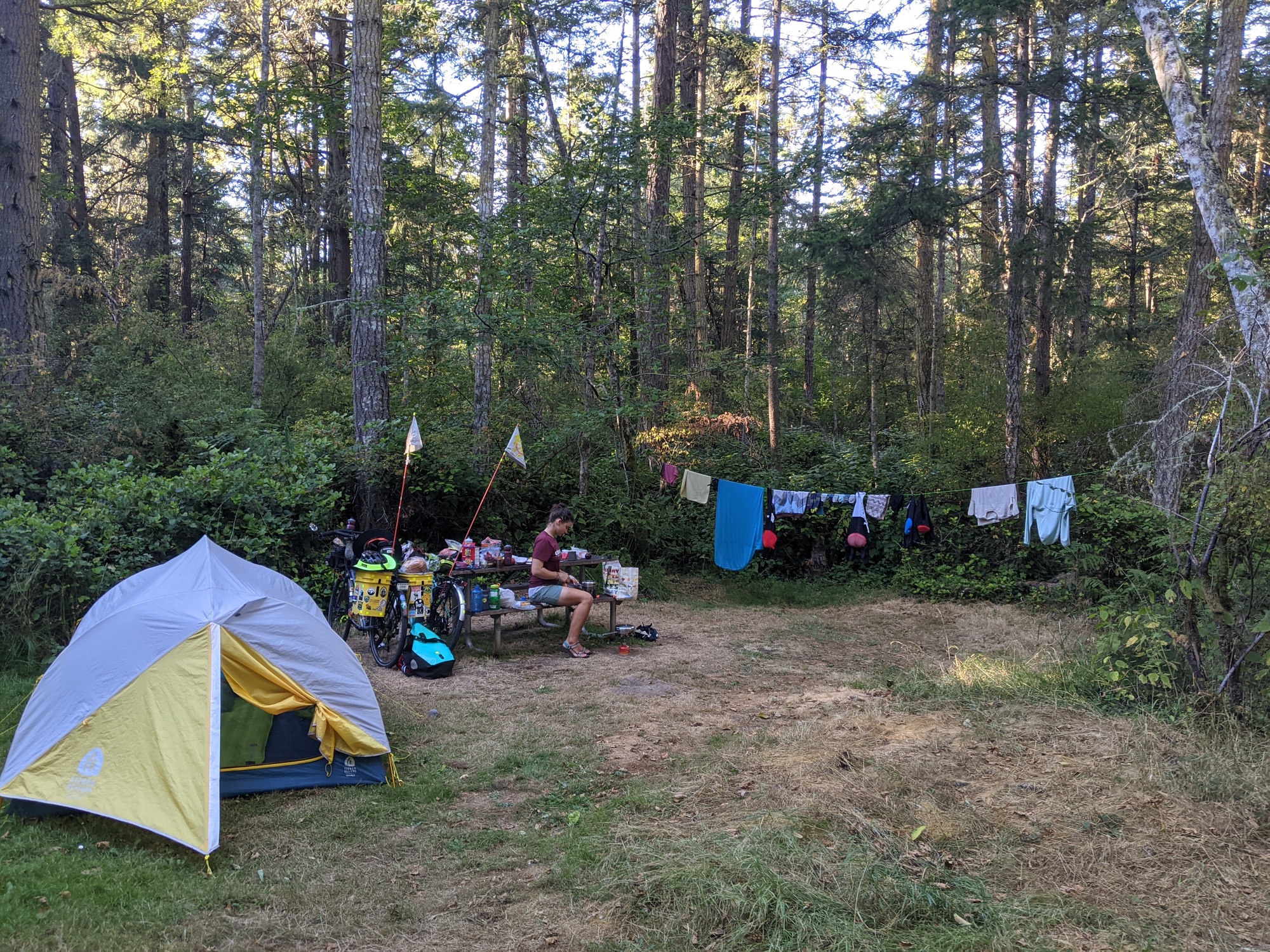Today we mostly lounged around. It looked like it was going to be a little harder to find a campsite near Friday harbor (San Juan island) than we anticipated, so we stayed on Lopez for a day off. We did ride into town for more food and stopped at Isabelle's espresso for a coffee, wifi, and charging. The coffee was quite good and the outlet was superb as well. We bought more stuff for curry at camp tonight and picked another nalgene of blackberries on the way back. I laid down for a few minutes around mid day before we walked out to the Spencer spit, which is a pointy sandy bit sticking into the bay.
