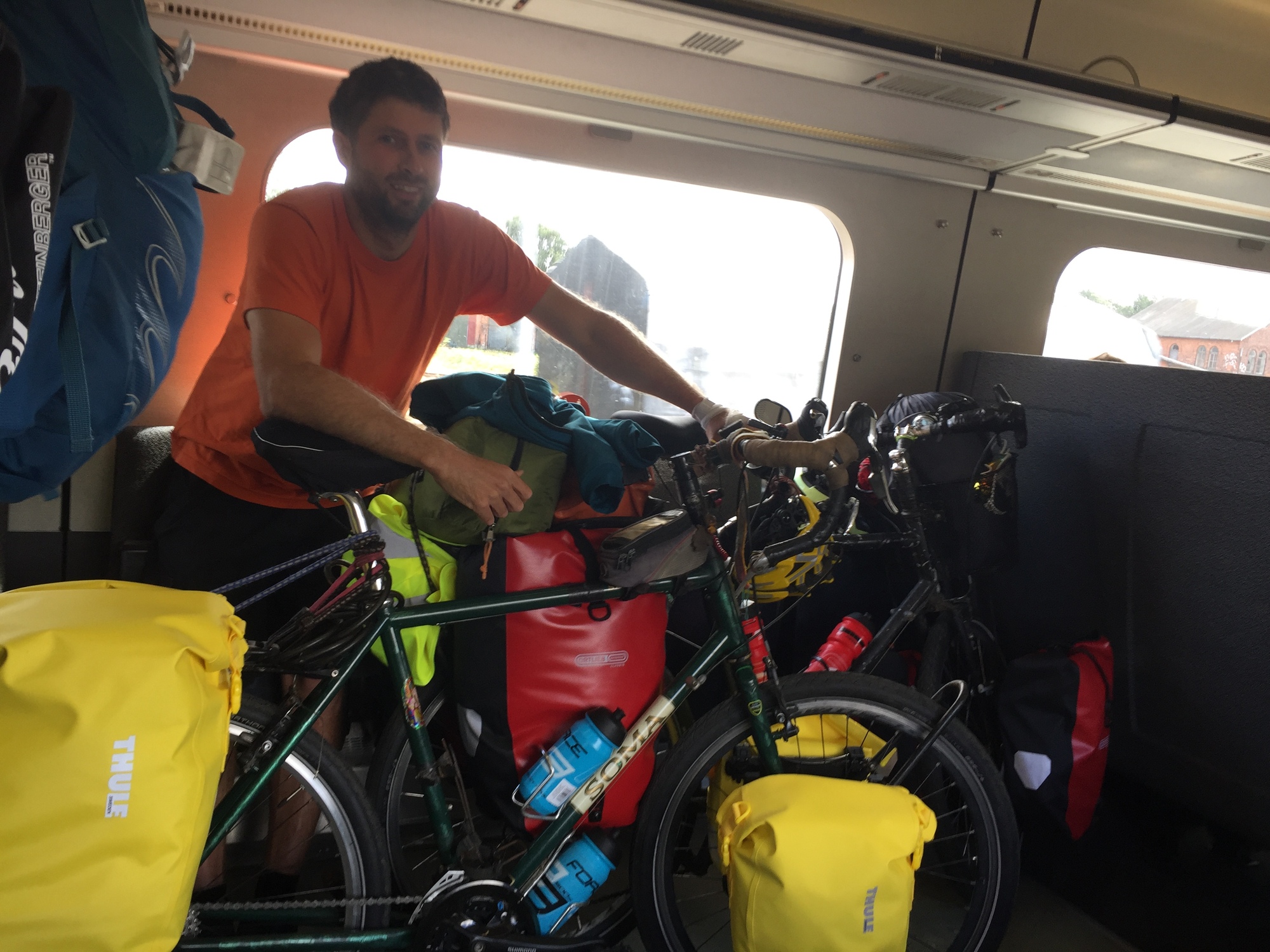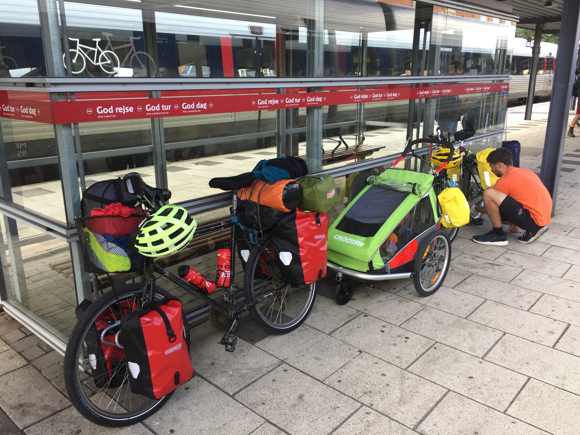 But there was no time for that, we were soon at the station, where we had to get two bikes and a push chair (bike trailers are technically not allowed on trains in Denmark, so we had to replace the connecting arm with a little wheel to convert it into a push chair) up an elevator and onto a very packed train. We had pre-booked space for our many items, so it was just a case of me asking people to move seats as I barged on with the first fully loaded bike. “Don’t move there though, we’ve also got those seats booked for our trail- I mean push chair.” Anyway somehow we got everything on before the train rolled out of the station. Kevin, by the way, had been asleep the whole time.