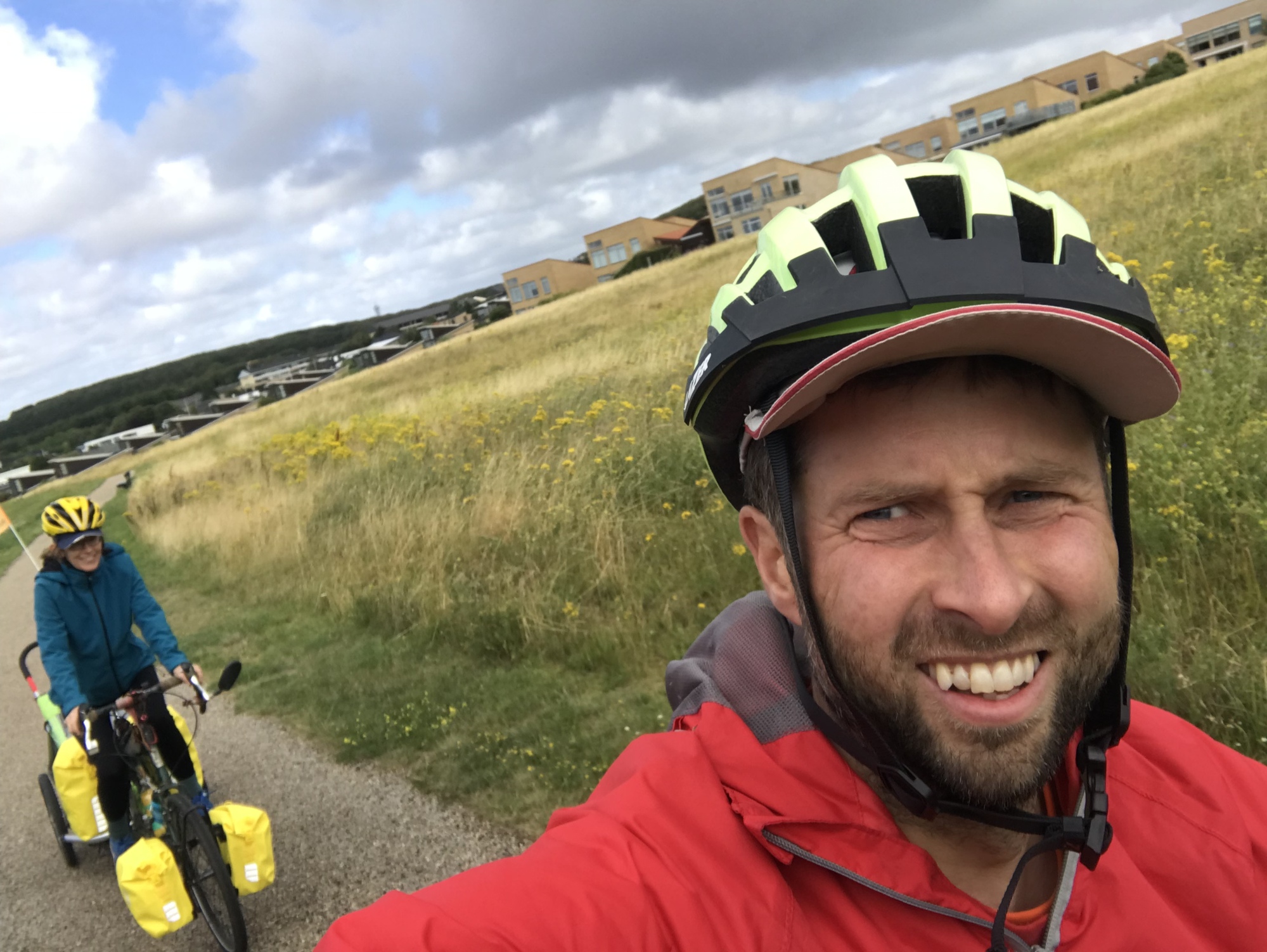 When Dea’s father and her brother decided to have a big joint birthday celebration at the end of July in the family holiday house in Northern Denmark, a location on the shore of a fjord very far from any train stations, it seemed like the only way guests would be arriving would be by car. But then Dea and I realized that this would be a great opportunity for us to have a trial run of travelling with Kevin. Other commitments meant that we wouldn’t be able to cycle the whole way there, but we realized we could take a train to the big northern city of Aalborg and then cycle the 70 kilometres to the summer house, enjoy the party, then return home in much the same way. We’d get a few days of practice at cycling and camping with Kevin, and I wouldn’t have to get in any cars.
