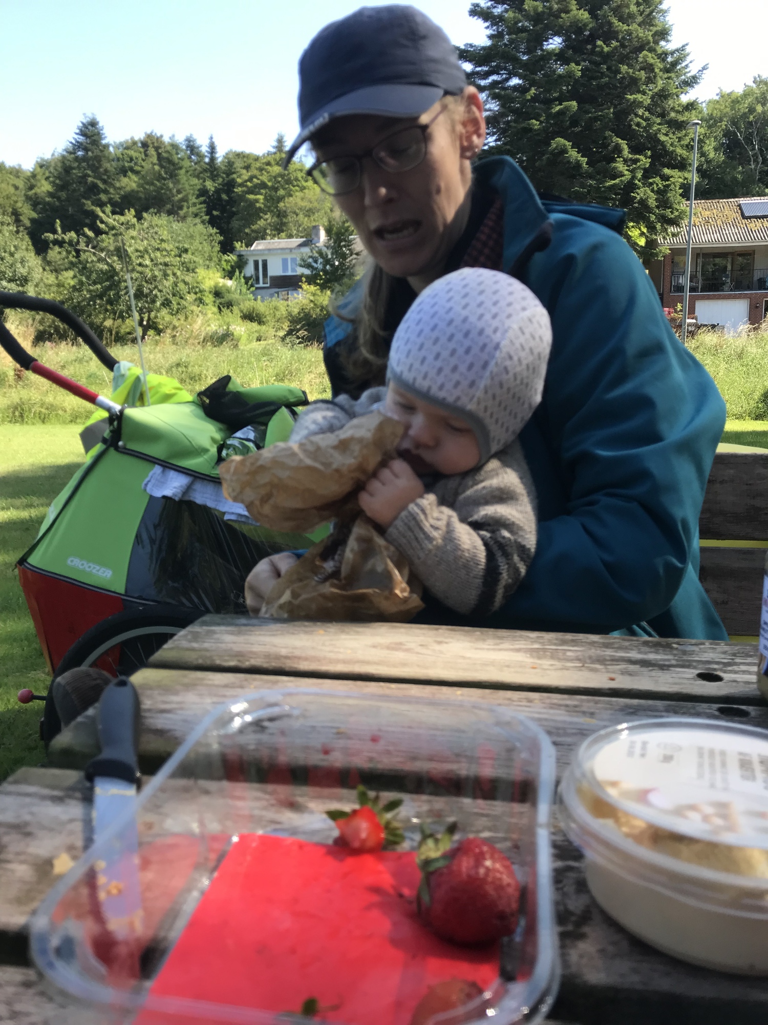 We mixed things up by passing straight through Vegger and instead taking a break at a nice little park in the tiny village of Halkær instead. This was a lovely spot for us to sit and a lovely spot for Kevin to worm around on the floor. He wriggled further than ever before and we were so happy to see him still developing during this journey.