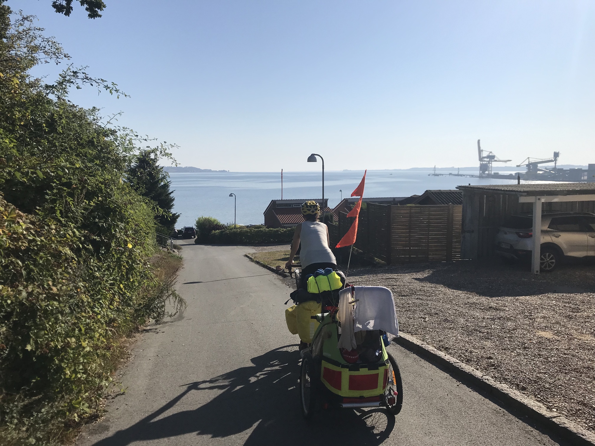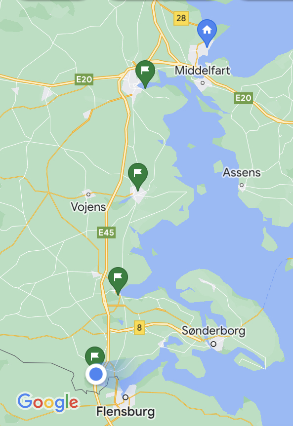 Then it was time to cycle. First down to the water, where Dea spotted some porpoises out in the bay. “Just like when we saw those pink river dolphins in the Amazon,” she remarked. “Or the whales in Mexico.” Then we climbed up a very steep road away from the water. “Just like Kotor Bay,” she said, this time being reminded of a day of switchbacks we had done climbing up a mountainside away from that bay. She had now been reminded of travelling in Peru, Mexico, and Montenegro, and we were barely even out of Aabenraa.