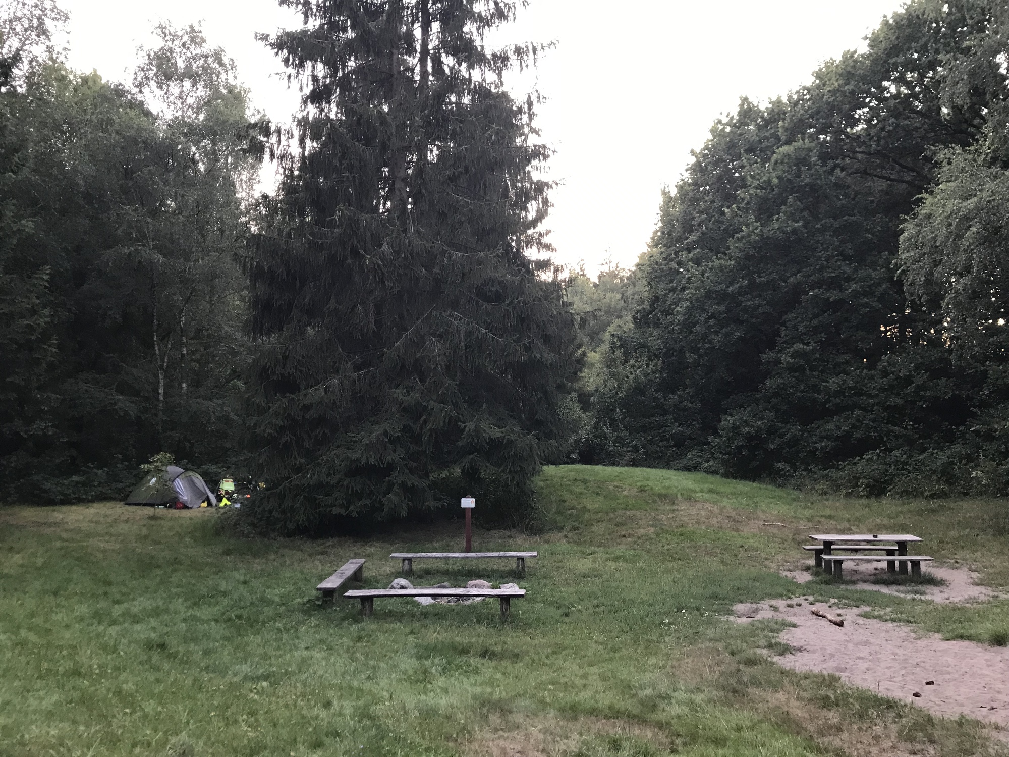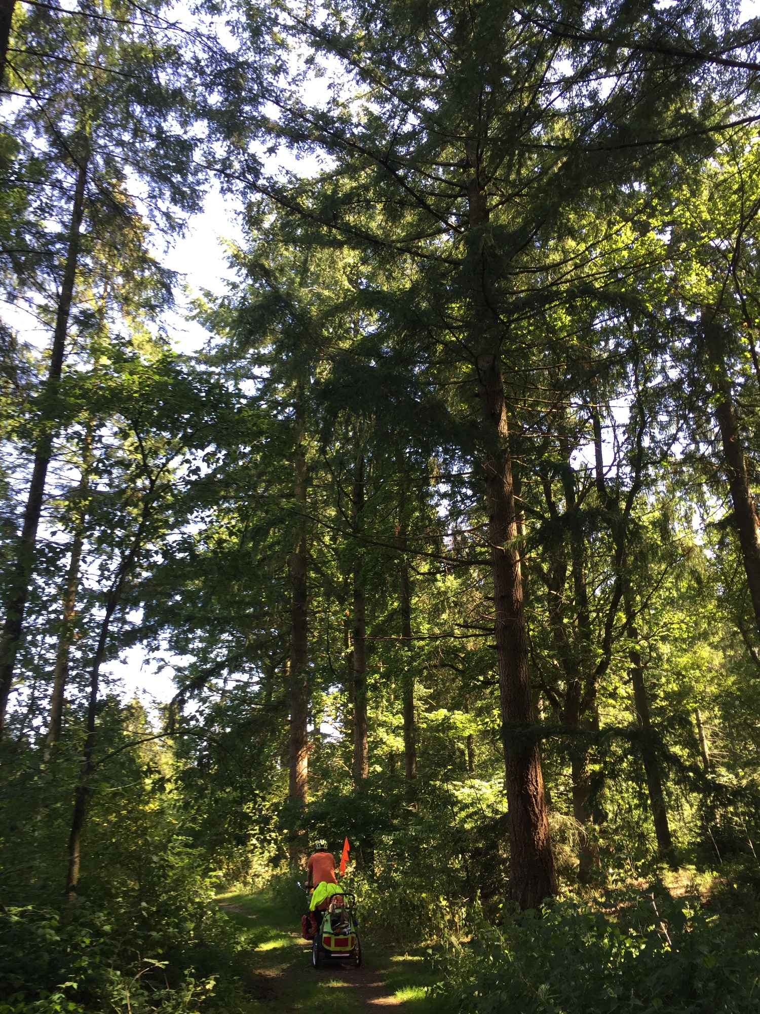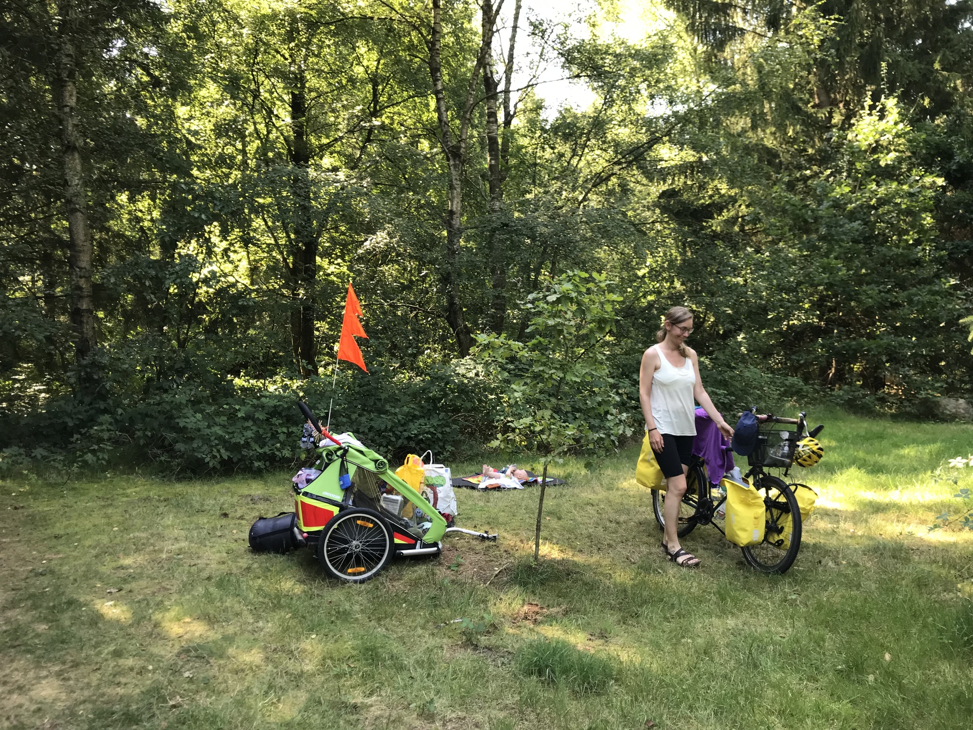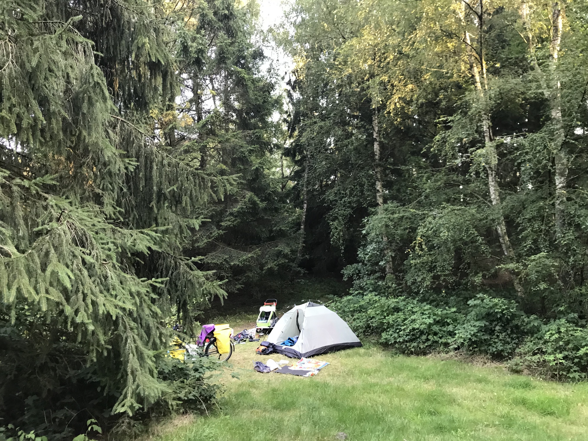 The camping place was a free site in the forest just a few kilometres from Germany. We had arrived by early afternoon and enjoyed some hours off the bikes to relax and recharge ahead of crossing into a new country tomorrow. It was really nice to just hang out with Kevin, and especially in such a place, surrounded by nature. The campsite is in a clearing in the forest, with water and a simple toilet and everything we need, and nobody else is staying here overnight (although it is also a forest where dogs can run free off leash, so we had a few canine visitors). I like it so much to be in a place like this with Kevin, and I enjoyed holding him up and showing him the different trees. He liked to touch the leaves and watch them move. I couldn’t tell him what any of them were though, of course.