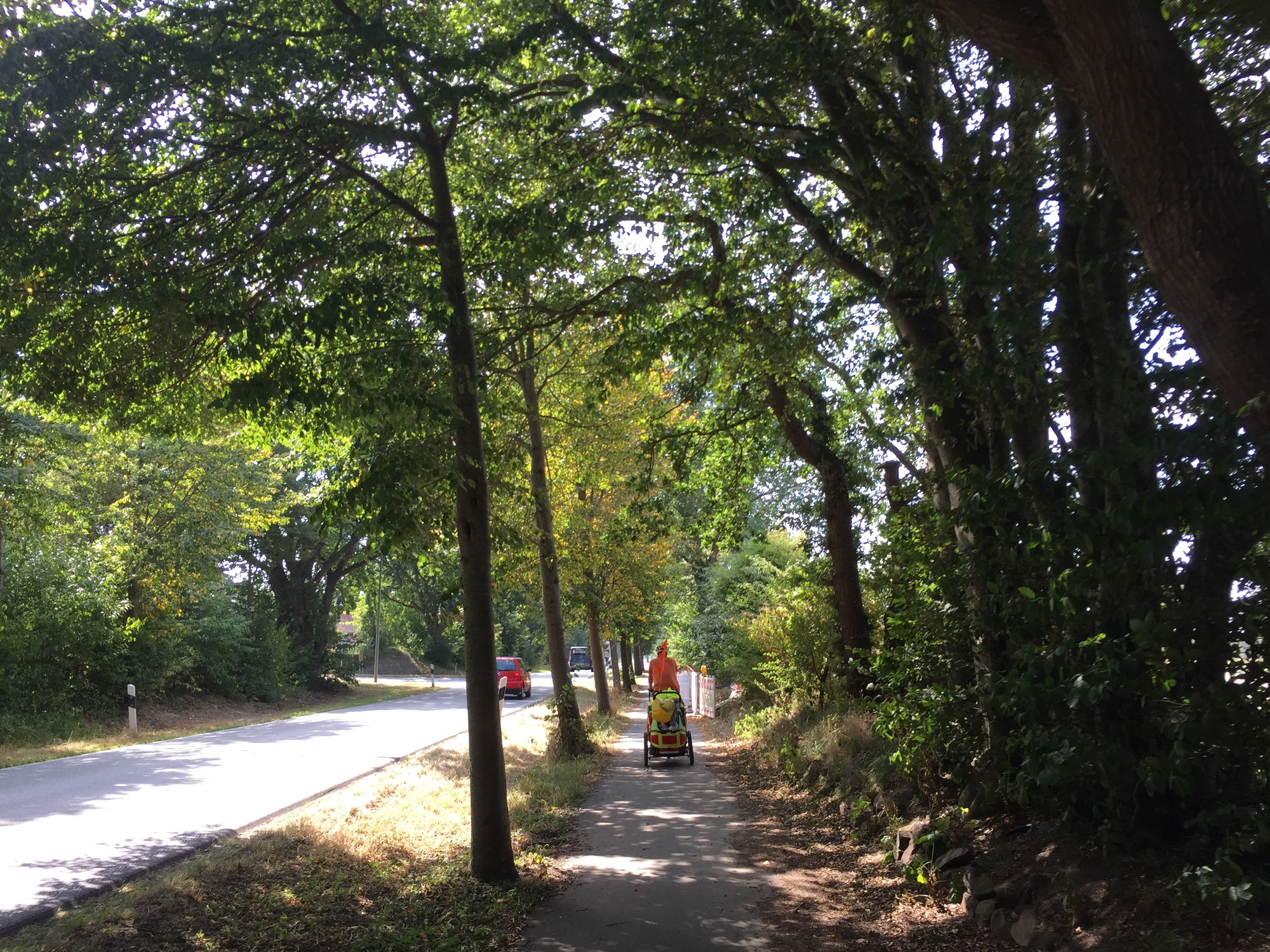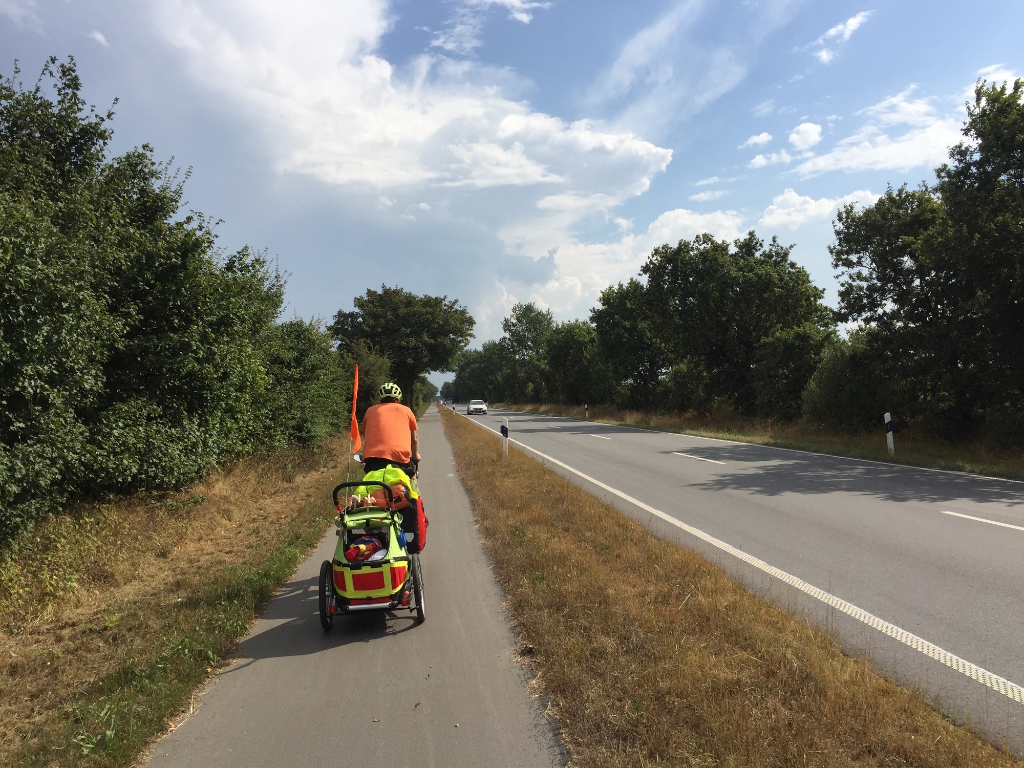 We had potential break spots planned for 10, 12, and 14 kilometres and it was a relief to make it all the way to the last of those without any complaints from our little boy, despite bumpy slow progress on the rough German bike paths.