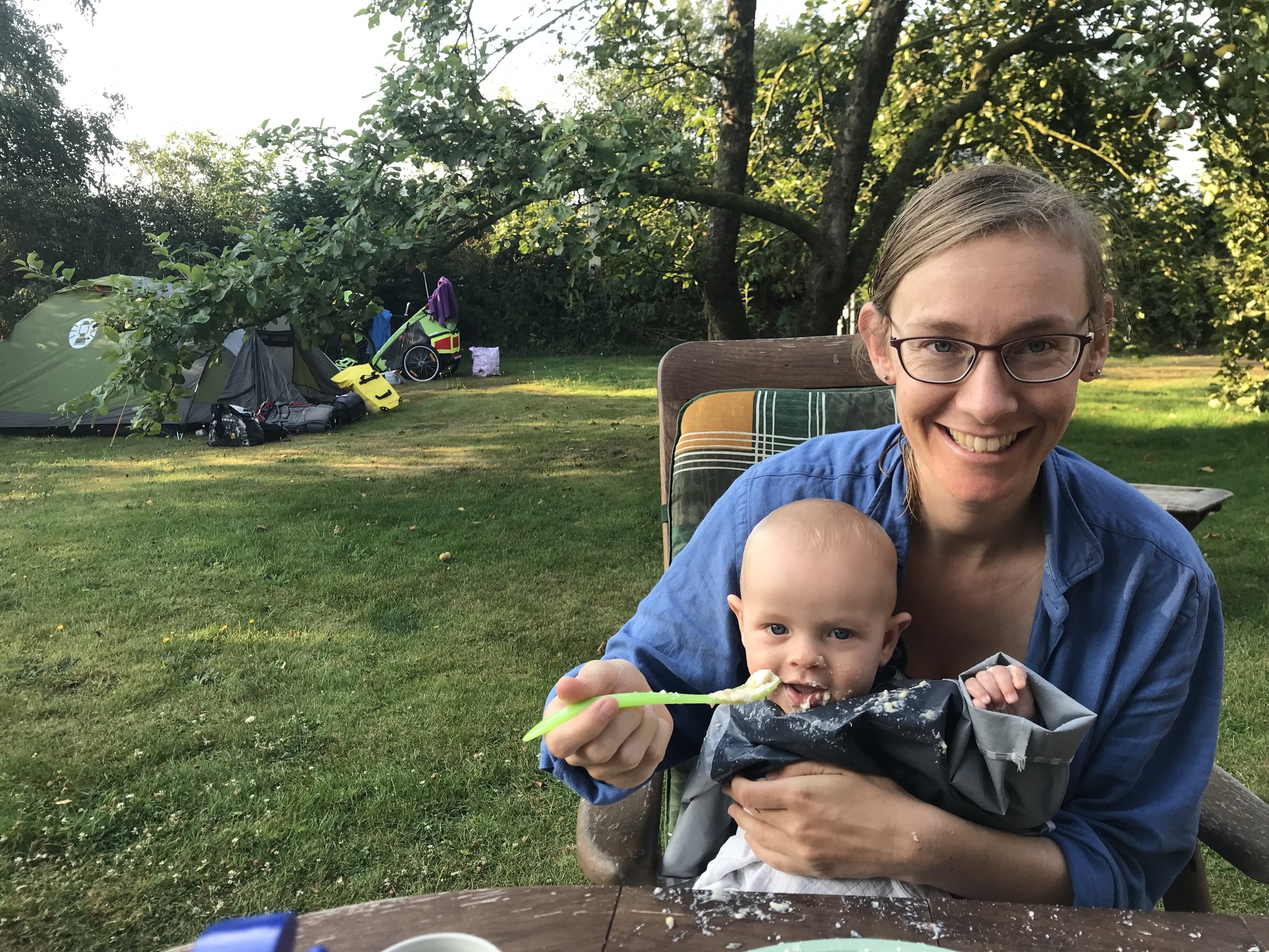 We woke up still not knowing what to do. We both agreed, however, that cycling another 40 kilometre day to get to Rendsburg wasn’t a good idea and wasn’t fair on Kevin, so that was off the table. We had the option of staying where we were, but that would mean a whole day in a garden that would become hot under the sun and then potentially wet due to thunderstorms in the forecast, and would still leave us with the problem of having to cycle the 40 kilometres to Rendsburg the next day. The most sensible solution, then, was to cycle some of the way to Rendsburg today and the rest tomorrow. But where to stay halfway to Rendsburg?! There weren’t any places offering camping in gardens, no warmshowers hosts, no free shelters or paid campsites. Wild camping might have been an option but could be very tricky with a baby and the thunderstorms worried us. We were still a bit stuck.