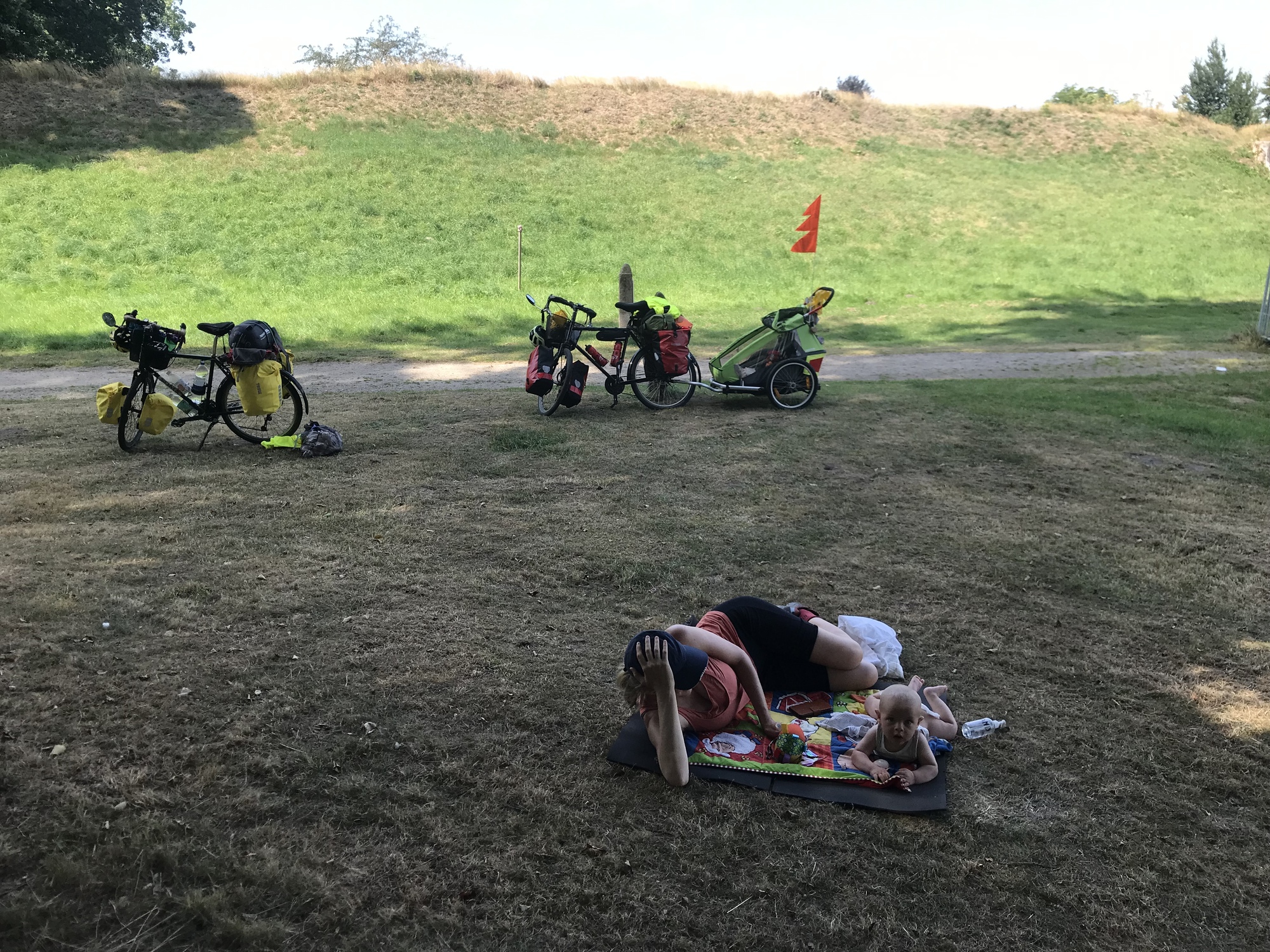 We took that break at Danevirke, at a very cool and appropriate spot. It was the place where the border between Denmark and Germany used to be, with a big wall having been constructed by the Danes to protect their land during the Middle Ages. This place where we sat eating our peanut butter and jam sandwiches was once the only gate along the whole border wall. We tried to explain the significance to Kevin but I’m not sure he really understood, but we did play some very fun games with his little colorful ball.