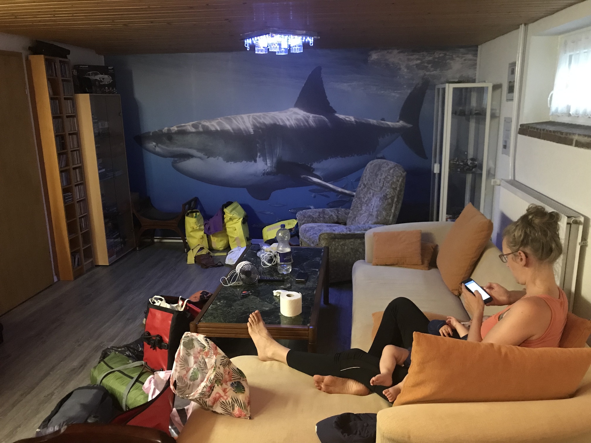 We were shown in to our quarters, which was, as we suspected, just the families basement. Luckily it was made up quite nicely with all the things we might need, like a bathroom, two bedrooms, a cot for Kevin, and a little kitchen. But there were also some unusual features - the well stocked bar, for example, and the water bed that Kevin had great fun on. Strangest of all was perhaps the giant picture of a shark. It was probably the weirdest place we had ever stayed, but it was fun.