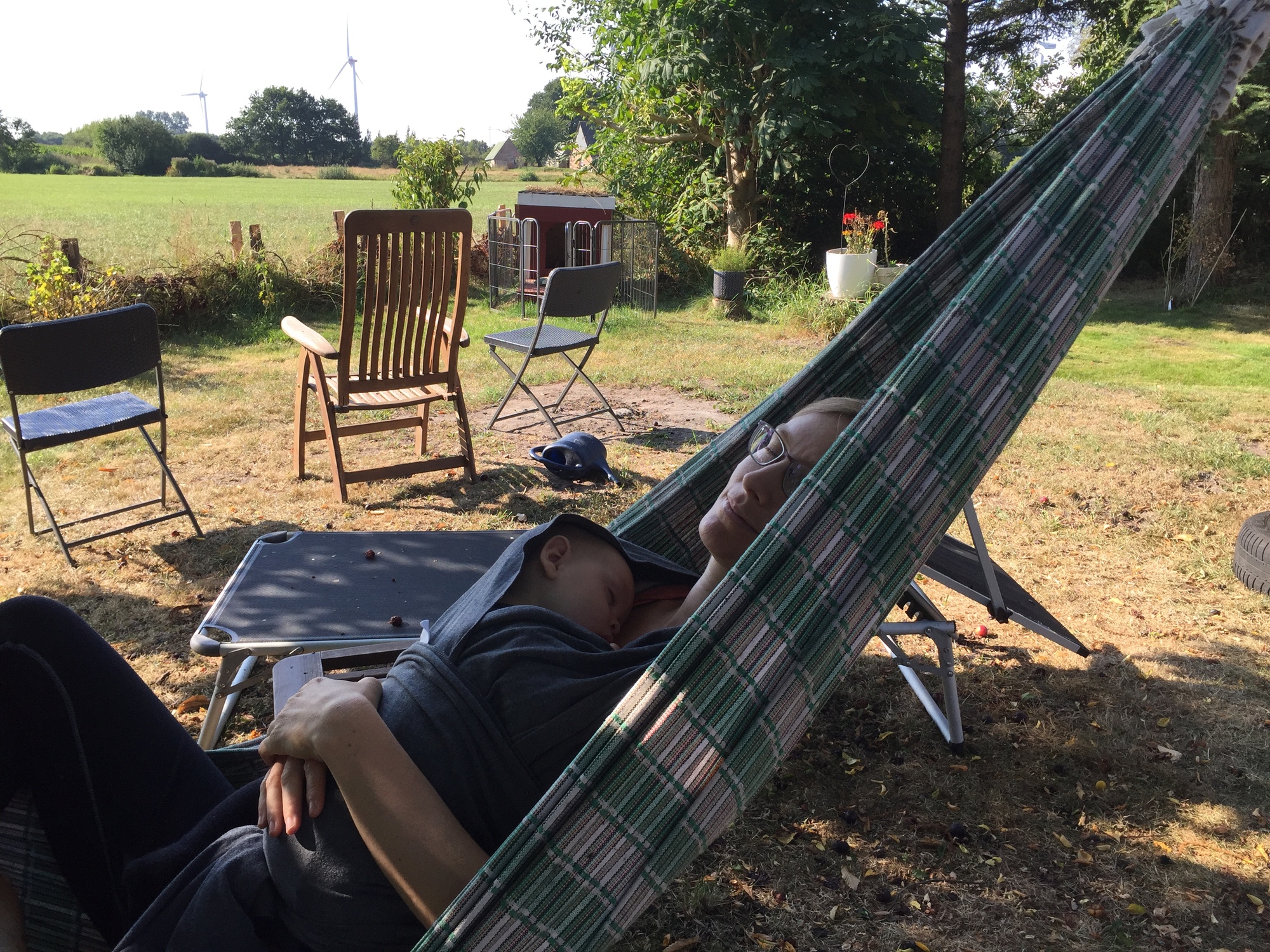 There was one town at the halfway point called Kropp and after a bit of searching I found a guesthouse there for 65 euros. A lot more than we were used to spending but less than the 100+ euros most accommodations were asking. Dea called the owners and I was impressed by her German skills, but she found out there was a 40 euro cleaning fee on top of that which put it out of our price range. After a bit of pleading about being a bit desperate and with a baby, the owners offered us an alternative - a basement apartment that was twice as big for a flat 60 euros. It sounded too good to be true. It sounded like we would just be sleeping in their basement. But it was our best option, and at least we had a plan now, much to our relief. And with just 24 kilometres to cycle we gave Kevin the morning off, and he spent it sleeping with his mother under the shade of the trees in a lovely hammock.