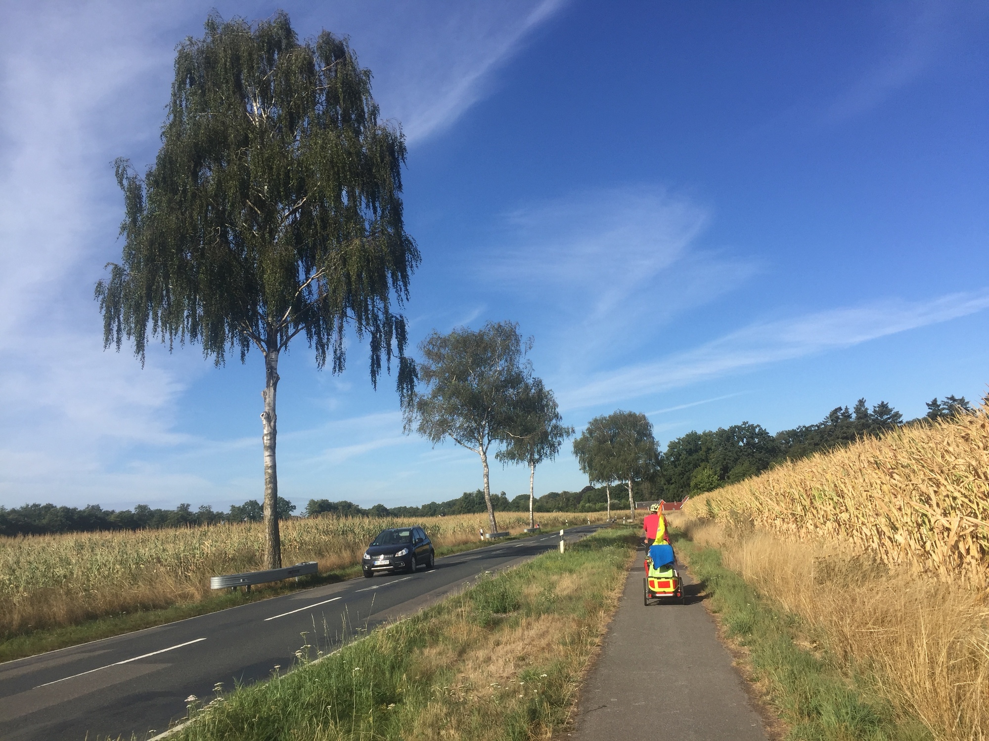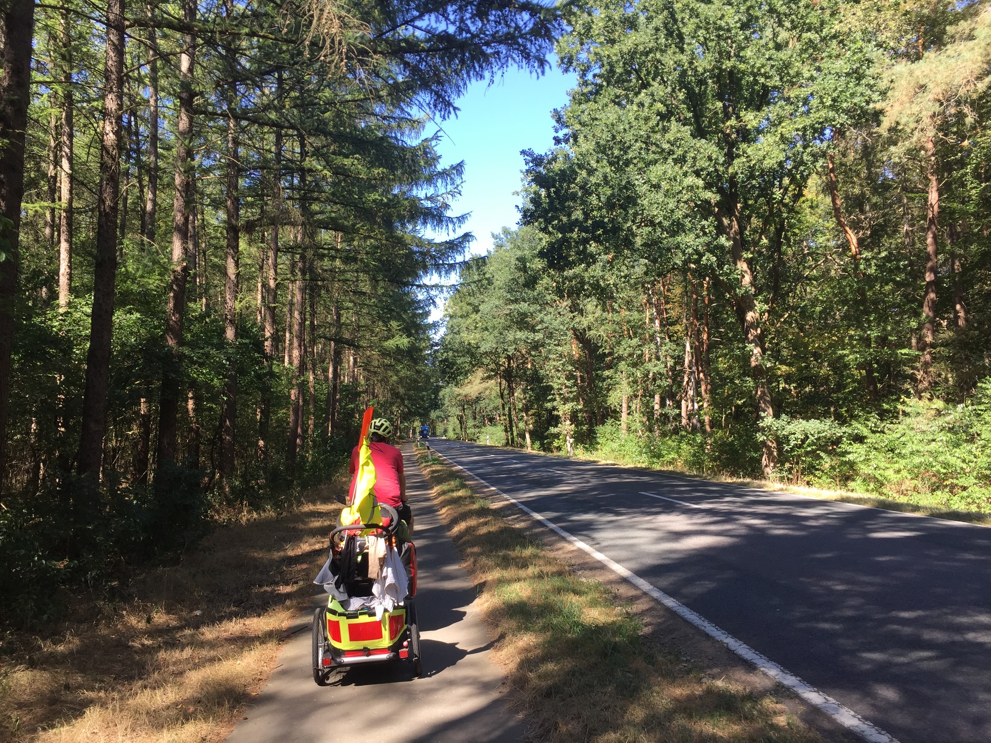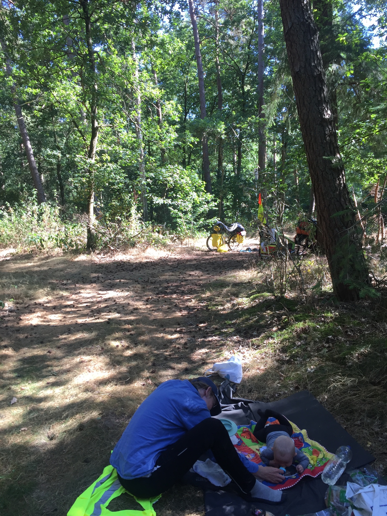 The second section was almost all on a quieter road away from the bike paths and progress was again therefore faster than usual. Our second break was really nice. There weren’t any small towns here, so we stopped by a river and spent the two hours in the forest instead. As usual Kevin seemed to love being in the nature and we all agreed it was one of the best places we had taken a break on the whole journey.