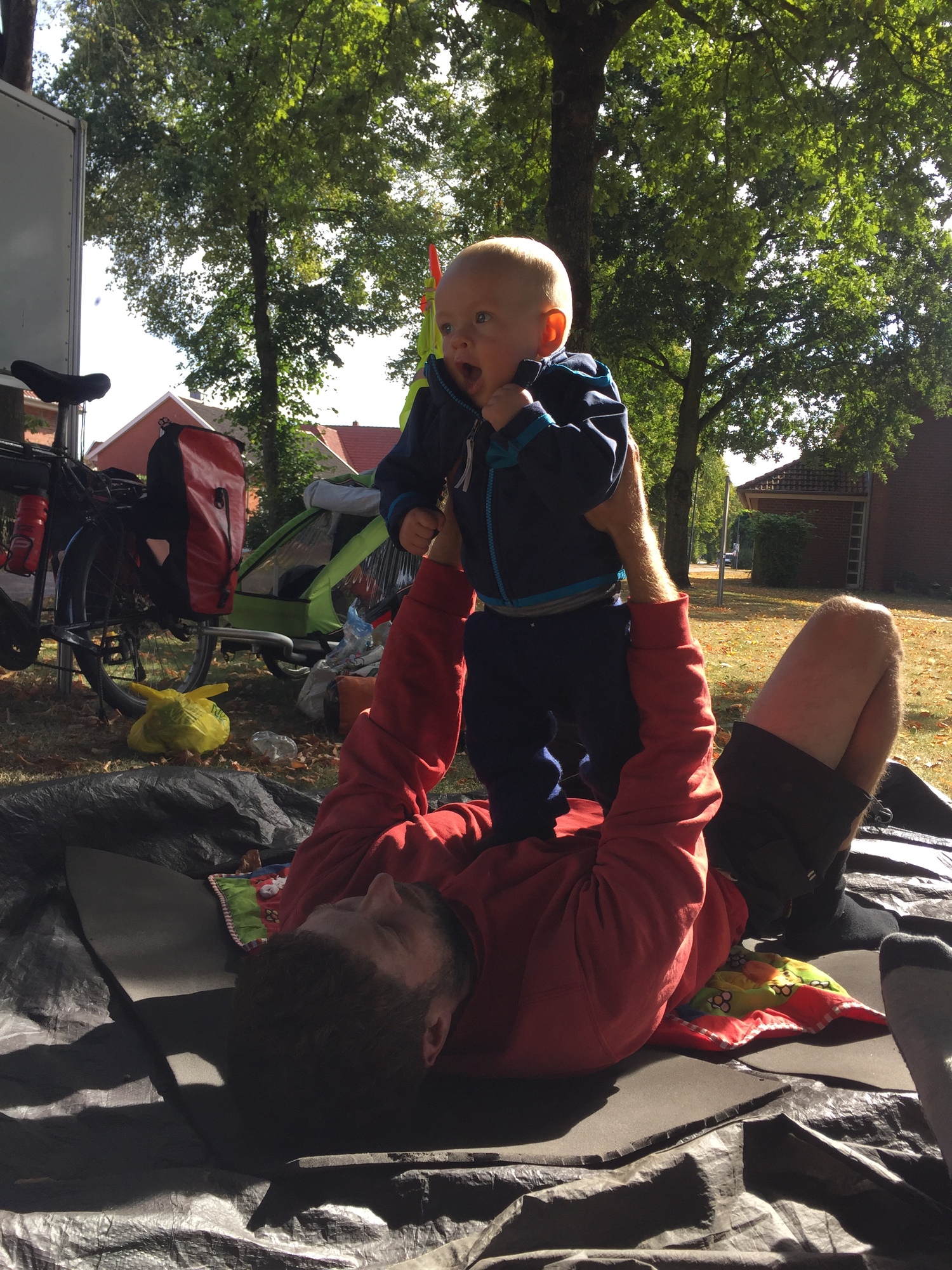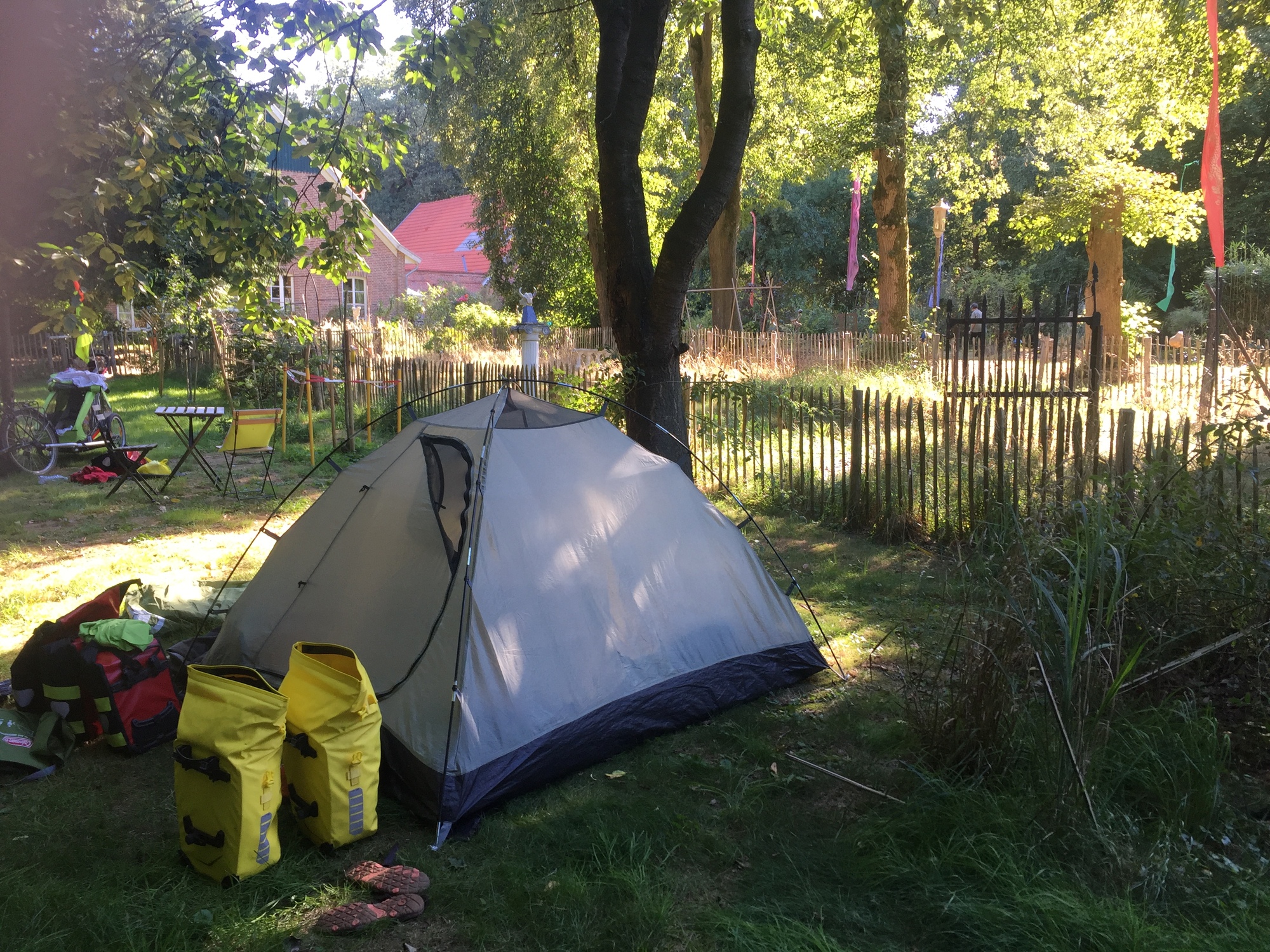 Our hosts this night were a charismatic older couple - Jorn with his colorful rainbow spectacles and Birgit with green steaks in her hair. They have a big farmhouse with lots of space including a special fenced off area for us to camp in. It is really nice to have this space to ourselves; especially as they are animal lovers, as evidenced by the big paw print tattooed on Jorn’s left calf, and have four dogs and four cats. We were introduced to the dogs after we had settled in so that the dogs could give us a sniff and wouldn’t come and bark at us later. It was a bit scary holding Kevin as four dogs charged at us barking and jumping up, but they were okay after the initial excitement, and Kevin was as calm and laid back about it as always. We chatted a bit with Jorn and Birgit before they left us to enjoy the evening. They mentioned that their usual guests were gravel cyclists doing long distances each day and we were doing things a bit different. But we have enjoyed slowing down and taking our time and have met a lot more people than we ever did when we cycled this way much faster without a baby. And yet still we have made our steady progress across the map, and tomorrow will be our last night in Germany. Already we are looking forward to the Netherlands and a brand new country for Kevin.
