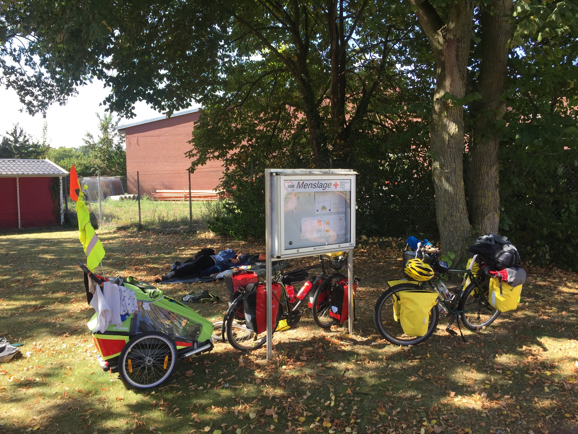 We needed to ride 38 kilometres today which was pushing very close to the 40 kilometre limit we set ourselves, but the good roads meant we made it 15 kilometres in the first of our three planned sections. We took a break in the small town of Menslage on a patch of grass next to some buildings. We got a couple of funny looks but it was fine.
