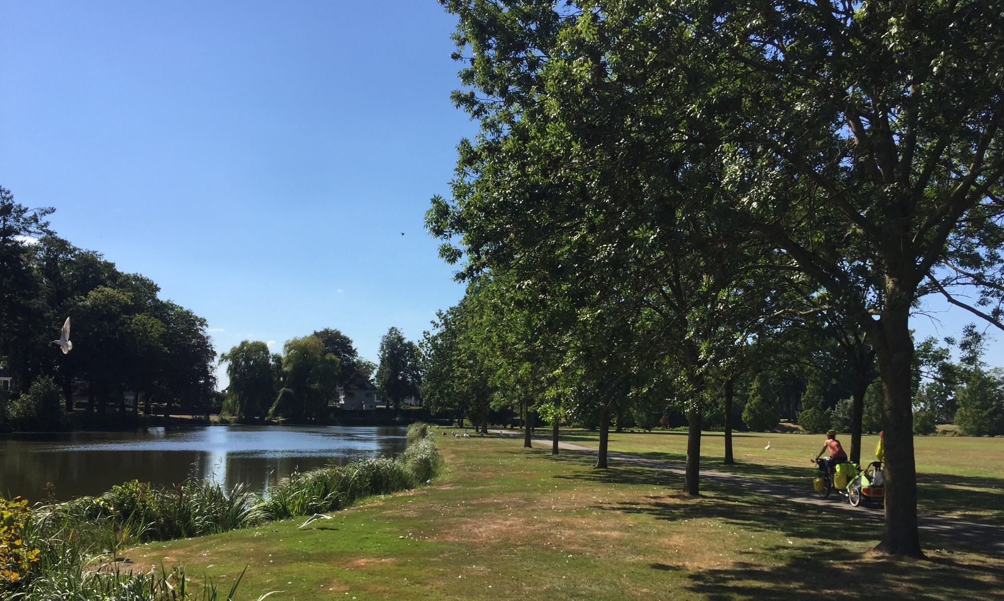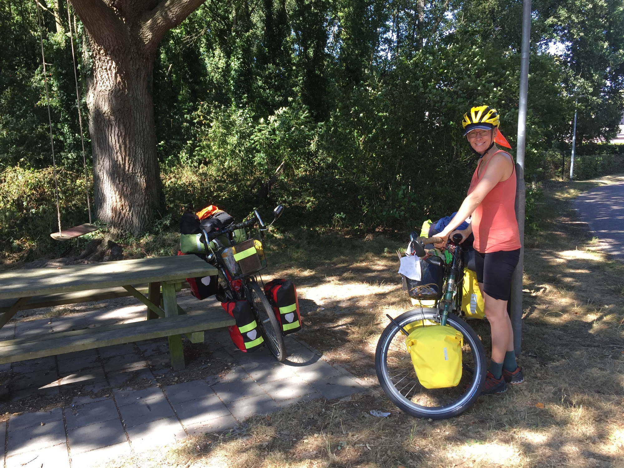 After more quiet roads we joined a bike path into Coevorden that was in much better condition and the Netherlands was doing a much better job of winning us over today. We followed what must have once been a moat around the old town that is now a big green space that I was surprised to see not being used by anybody on this sunny Saturday. Well, we used it for a break beside a lake. Dea stayed with Kevin and I went to get some shopping.