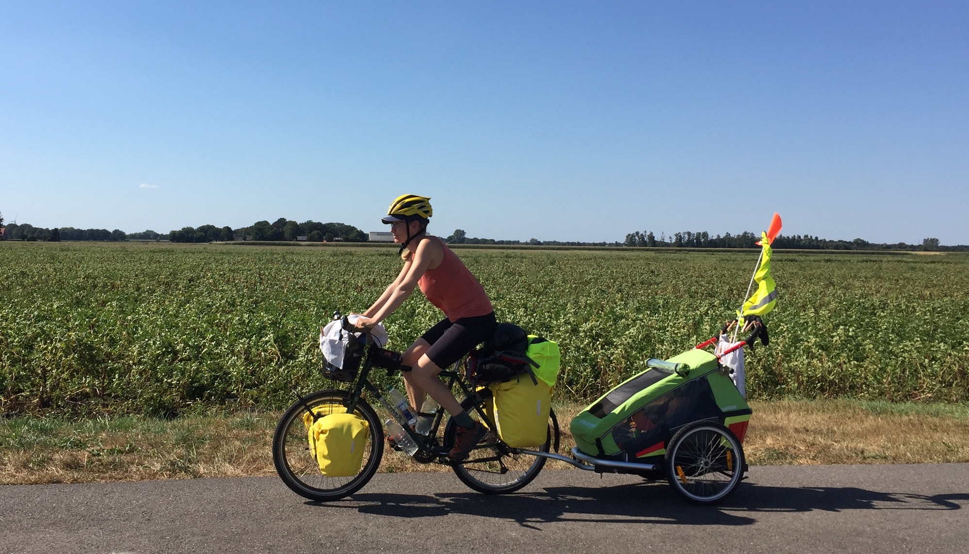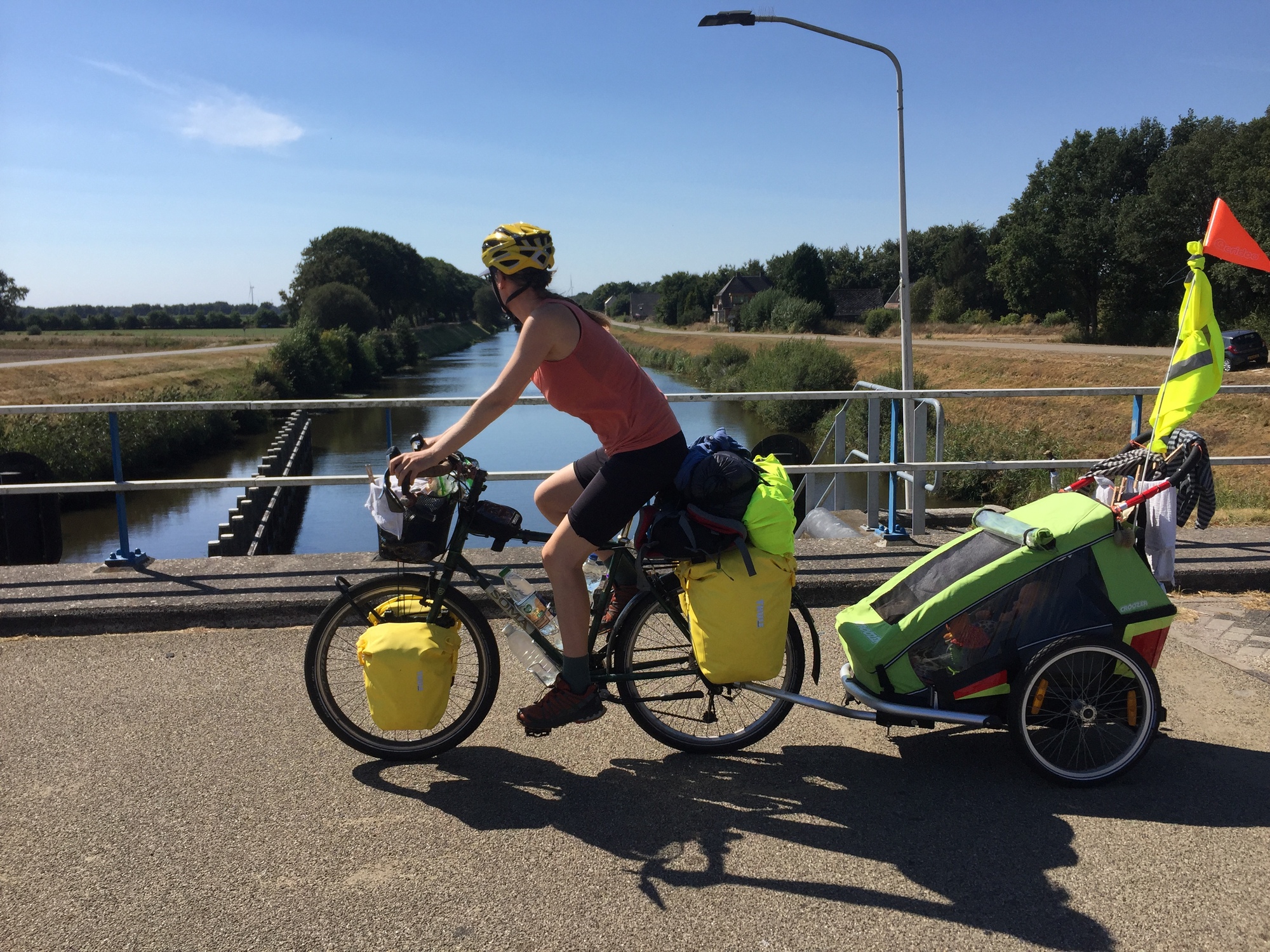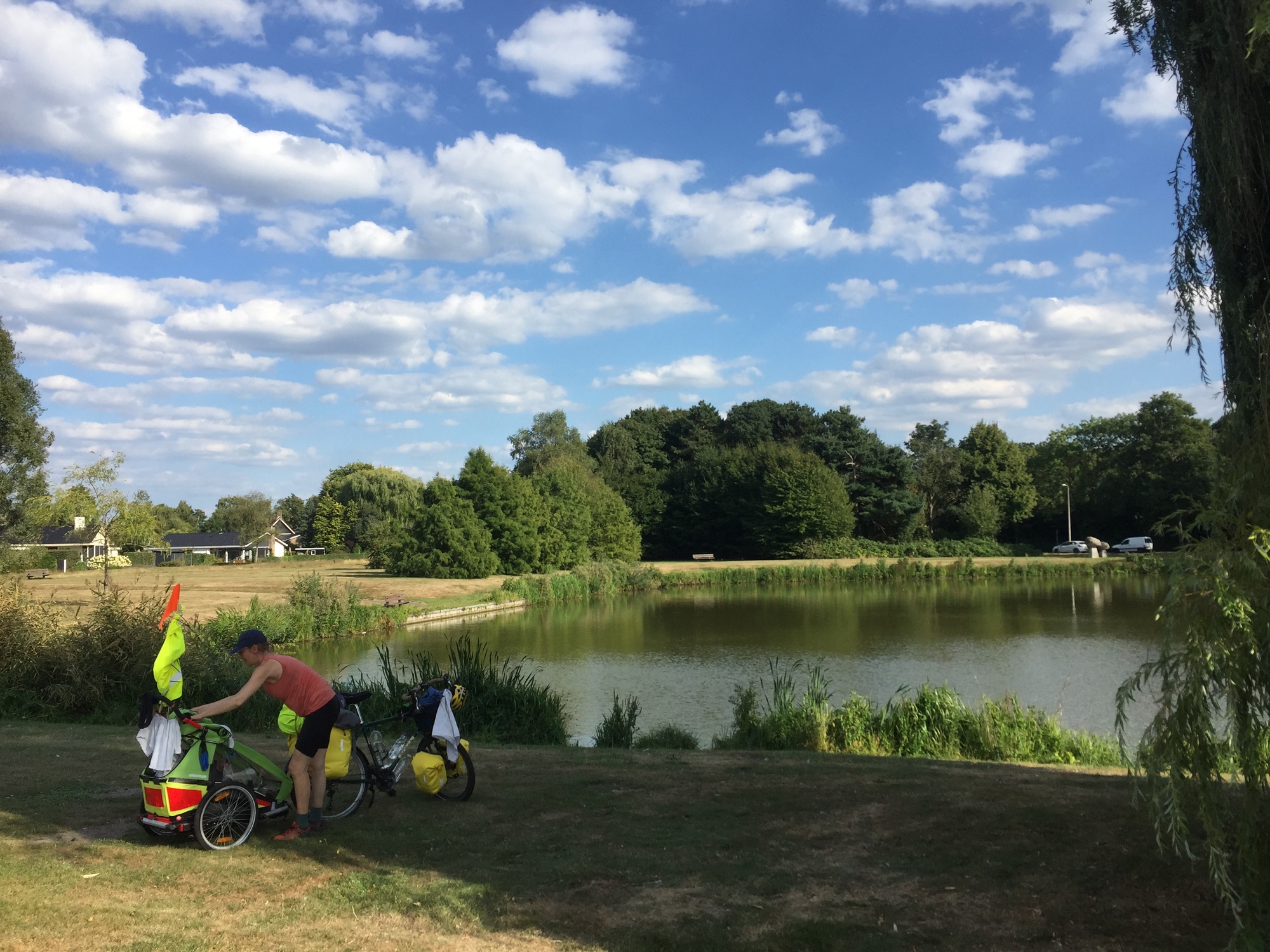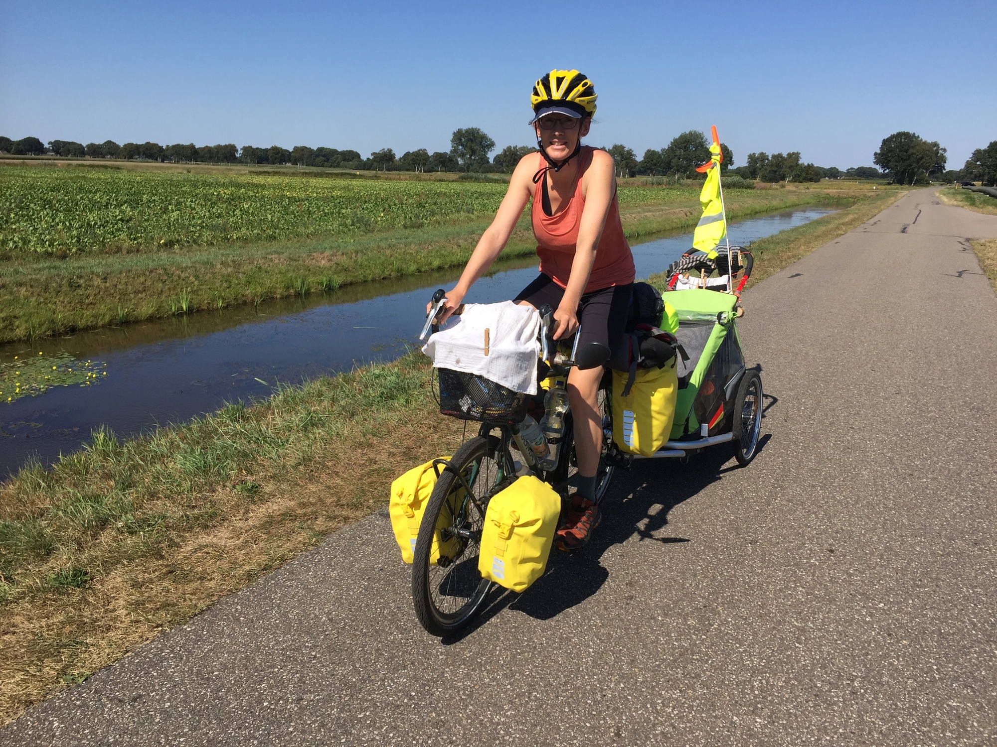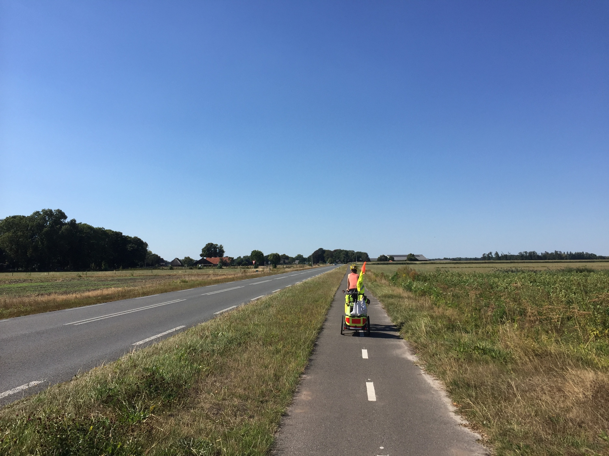We had initially planned to cycle along a canal direct to Coevorden, but as we took our break next to it we noticed that the narrow road was a bit busy and that made us nervous after yesterday. It was also a road made of bricks and was a bit bumpy for the trailer, so we made a new plan and headed on a different route on some small quiet roads instead.
