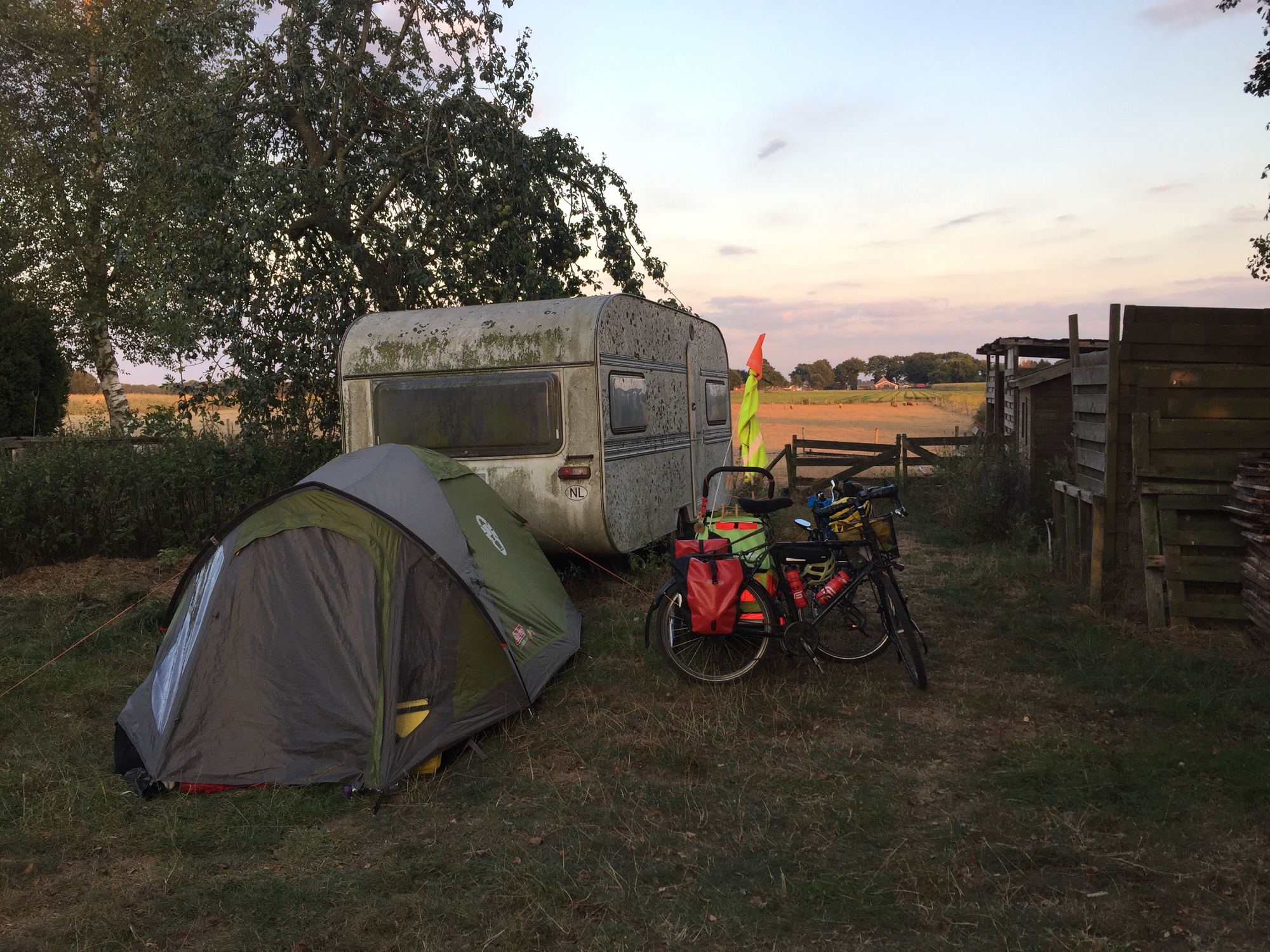 From there we had a five kilometre ride out of town on small roads to our host. In Denmark we had used “brug min baghave” and in Germany “one night tent” but in the Netherlands it is “welcome to my garden”. It is the same principle, although it is only supposed to be for slow travelers, hikers or cyclists. Our hosts lived right out in the countryside but were having a family get together so they just showed us to our spot and left us to it. That was fine by us - sometimes it can be difficult to keep being social, every day somewhere new, especially as Kevin was being fussy again. But on the other hand, it has been so interesting to get to see all of these different places and wow, how differently people do live and keep their gardens! Tonight was the yard behind an old brick farmhouse next to a filthy old caravan, with a cat and a dog, a few chickens, and eight sheep that our hosts keep in the field behind. It was in many ways our kind of place, much more so than immaculate lawns with sprinkler systems anyway. We went through our routine of feeding Kevin and feeding ourselves and putting Kevin to bed. We then managed to take a few minutes before sunset to watch the animals - the sheep and the cows in the next field. It reminded me of watching animals in faraway countries, in places like Mongolia. Having Kevin with us now means such destinations are out of reach, and yet having him with us has also changed our way of travelling and brought us new experiences. Before we would have cycled quickly through these countries, wild camping in the forest each night. Now we move slowly and we see more, meet more people, and are much more in touch with the land. These were my thoughts as I watched the grazing animals - being reminded of travelling through faraway lands in search of adventure, of the eight amazing years of adventure I’ve had with Dea, and how doing this now with Kevin, a boy whose story really begins on this day eight years ago, is the best adventure of it all.