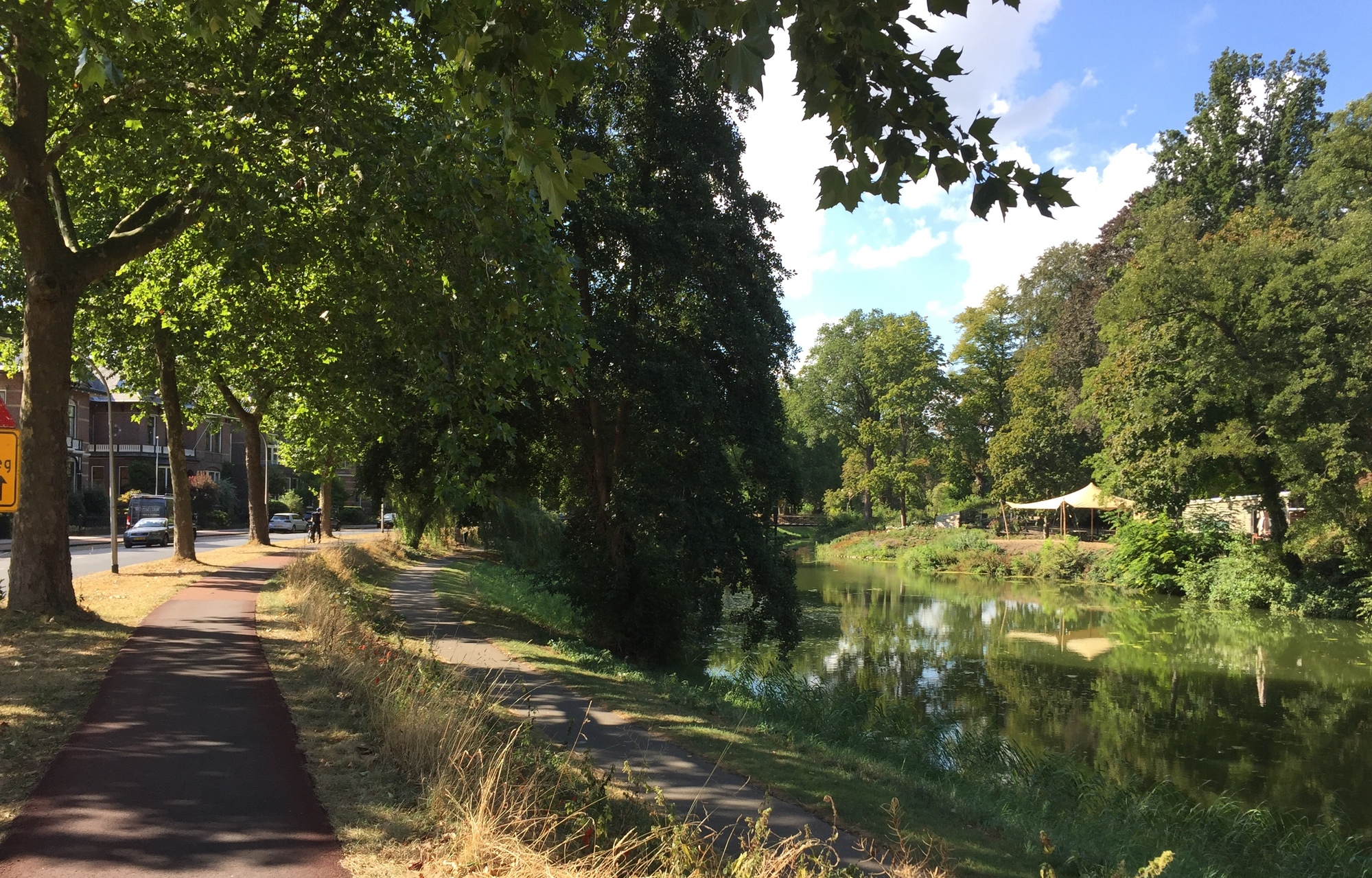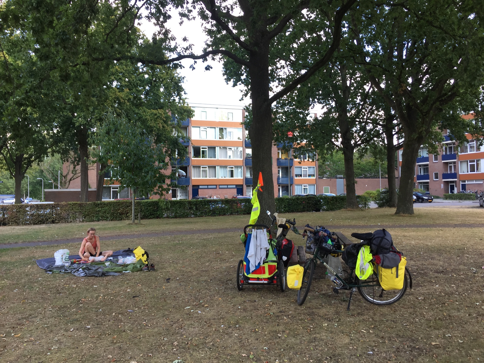The day was hot and sunny but quite uneventful. We took small roads for the first half of the day, stopping for a break after an hour as usual. Then we took bike paths into the city of Deventer and took our second break in a park.