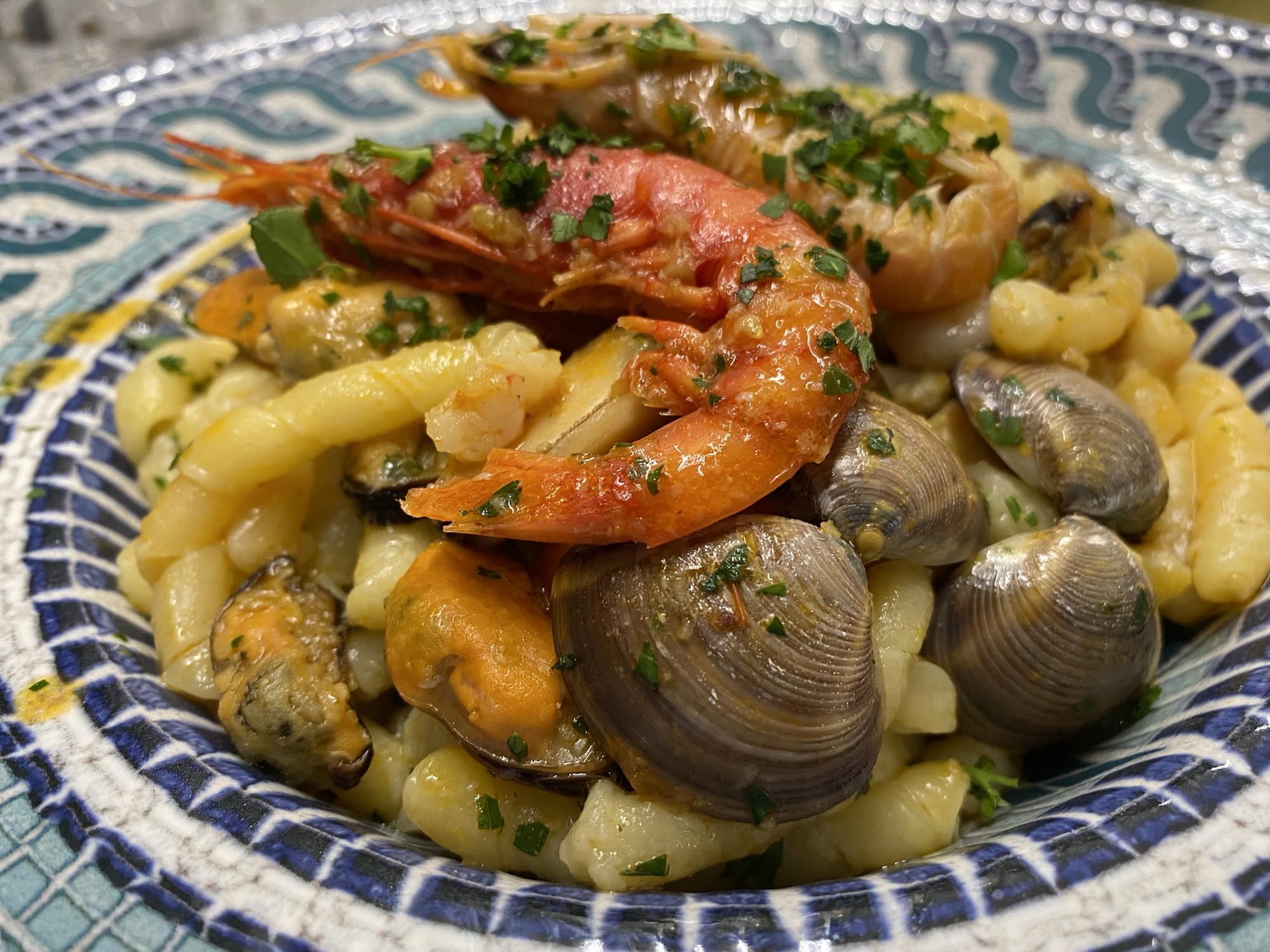 Last night we ate again at Salamureci, where we are staying in the rooms above. We had pasta dishes again and shared a salad, but the salad was mostly (very good) potatoes so we were stuffed again. Al finds that a secondi plus vegetables in some form doesn’t give him enough food and, since the second plates here didn’t really appeal to me, the idea to share a pasta (primi or first course) and a secondi (second course) remains a future plan. How any individual could eat an antipasto, a primi, a secondi, and then dessert, all à la carte, I don’t know. Not even Al could do it, and that’s saying something!