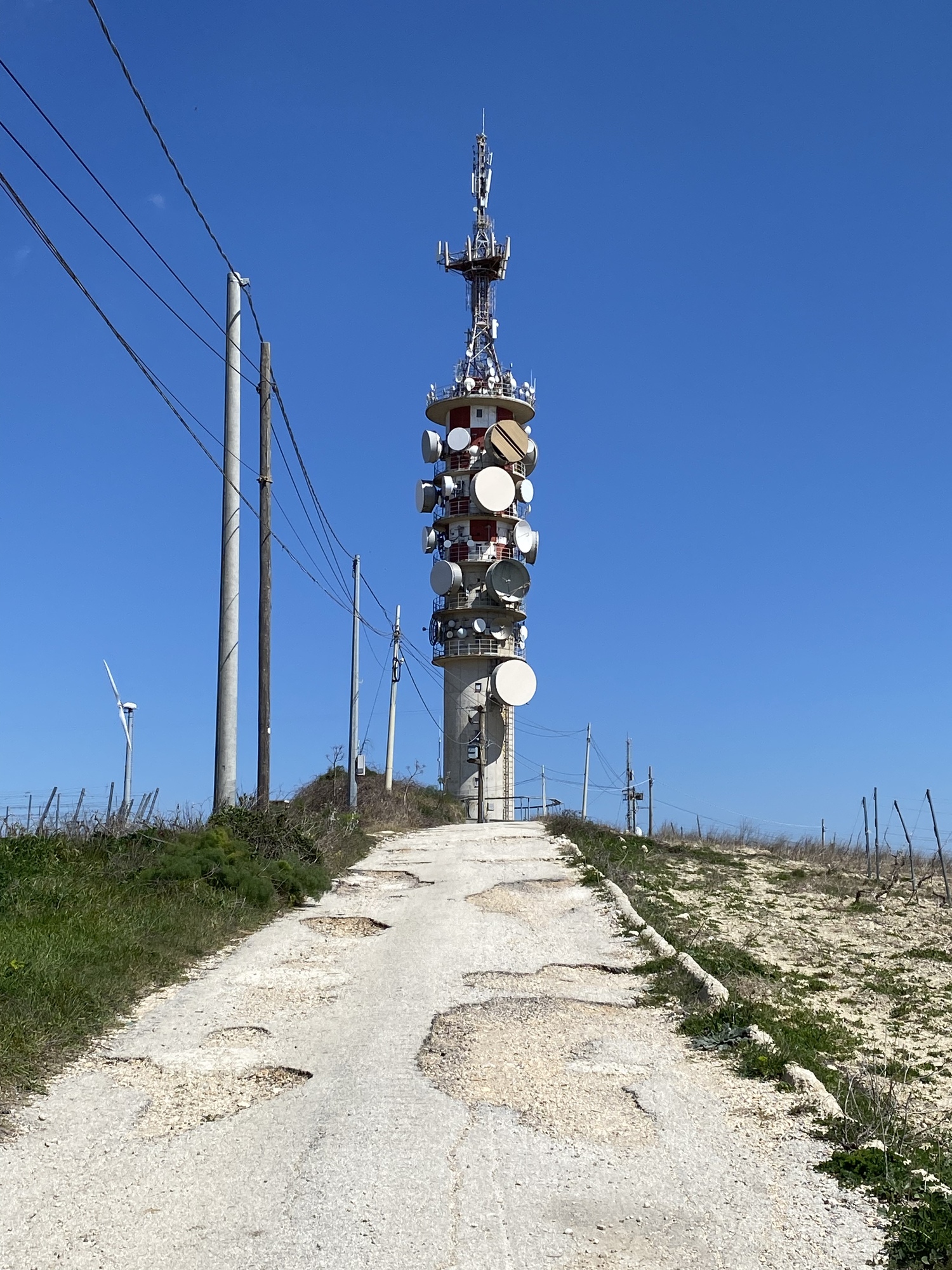 On through Gorgazzo, our route diverged a bit from the highway. Ulmi, Gorgazzo, and Salemi are quite close together and there was now, near noon, some traffic, so we were happy to take what we thought would be a quieter road into Salemi. I hadn’t checked this one carefully on RWGPS as it was marked as paved and I thought Salemi itself was the top of the hill. Oops! The highway contours around the hill but we went over it, on a farm track/access road to the communication tower right on the top of the hill.
