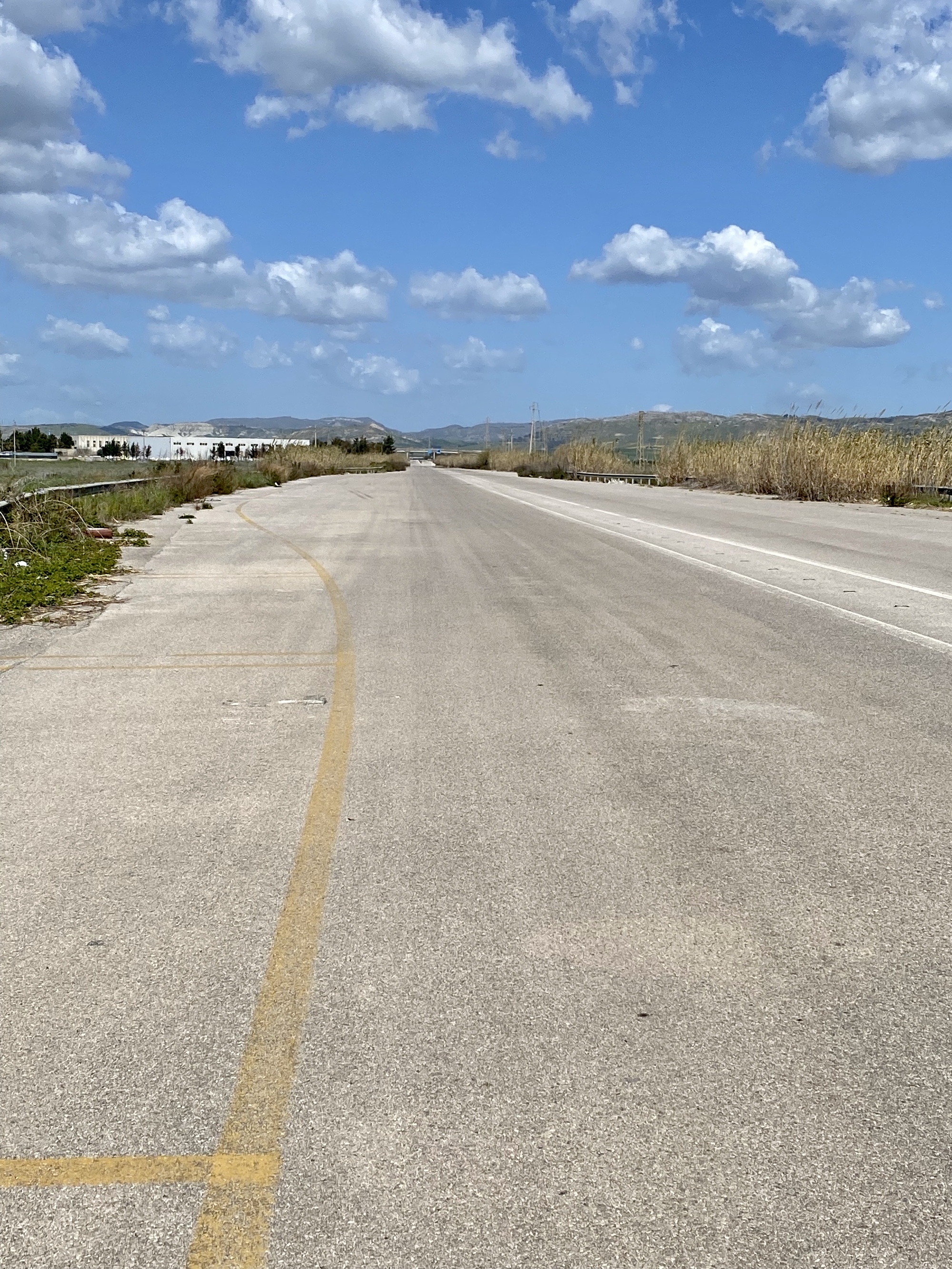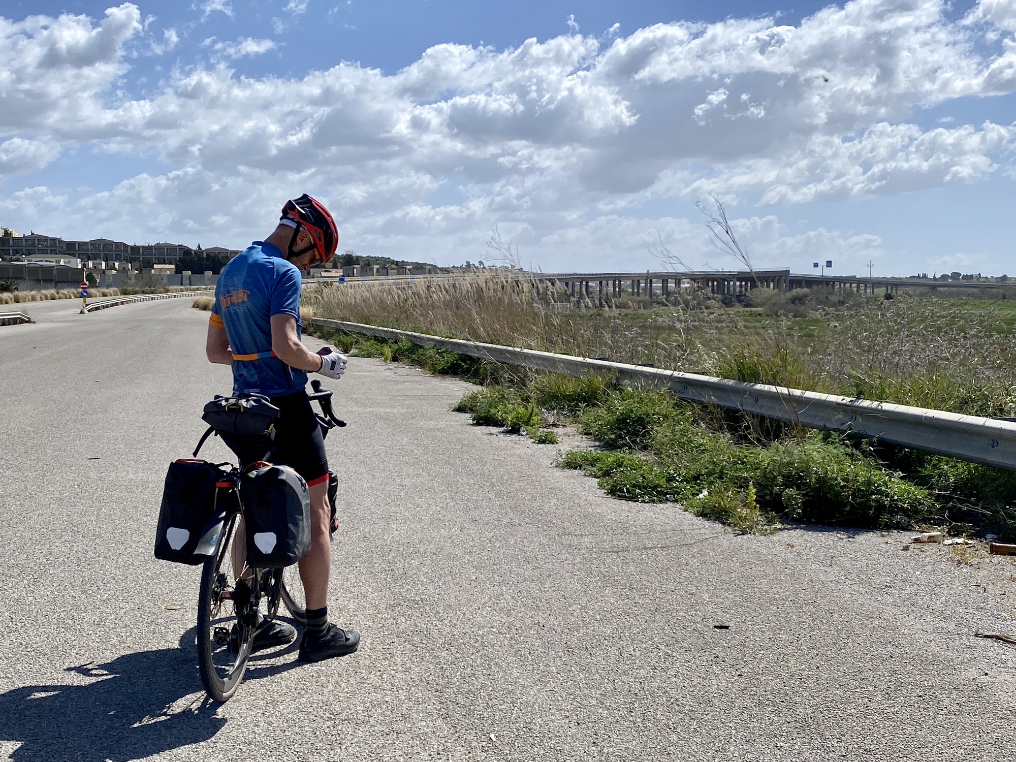 We started with a few flat km but soon enough found ourselves on the SS 115, a busy highway with a lot of trucks. Unfortunately, for half an hour or so, it was the only option. We had some relief on quieter roads for a while, but as we neared Gela, we were on the road with all the truck traffic once again. It seems that this road, signposted SP 83 or “Strada dei Due Castelli” and shown as a narrow white road on my Michelin map, is a popular bypass route around Gela. We couldn’t wait to get off.